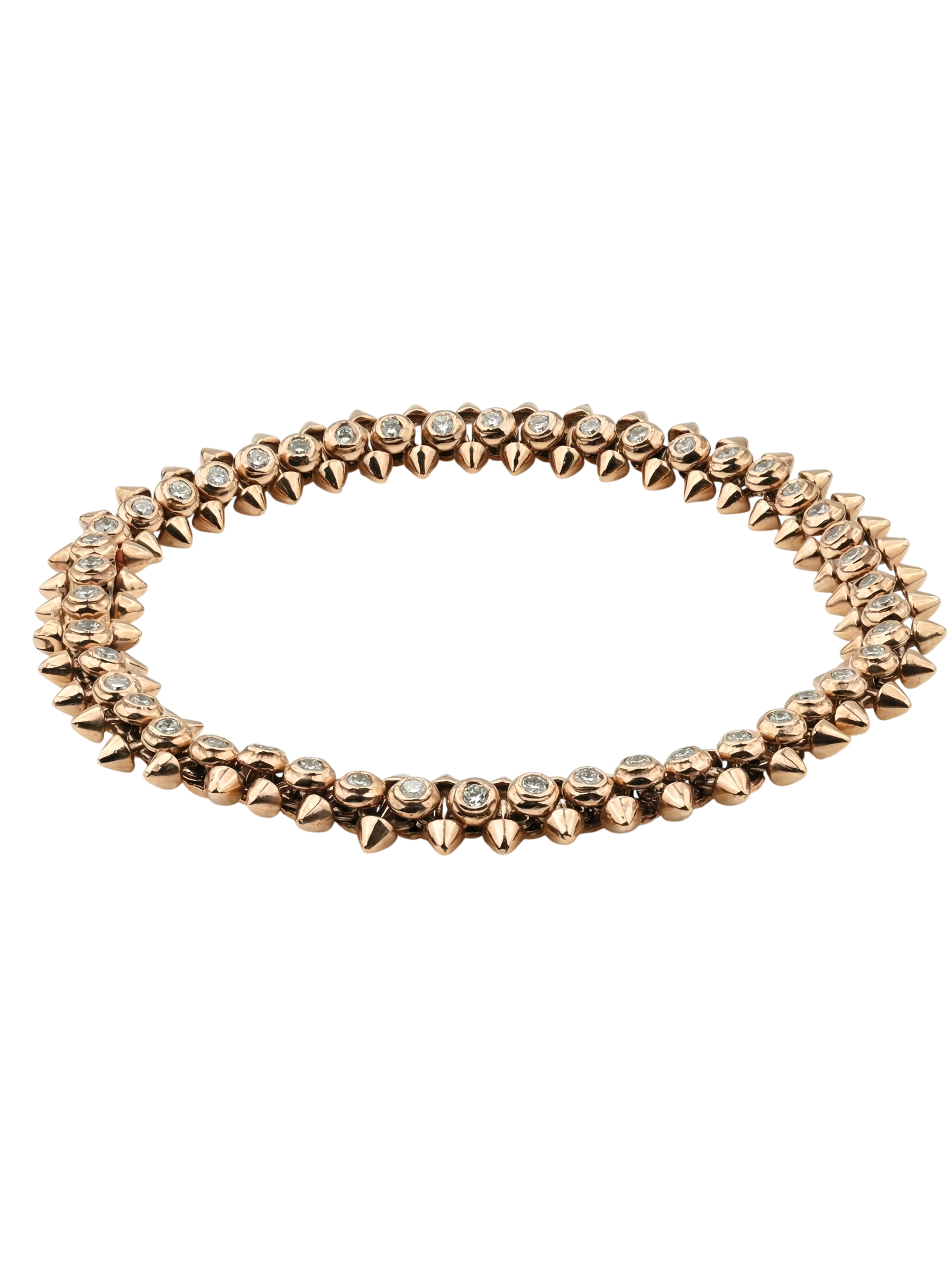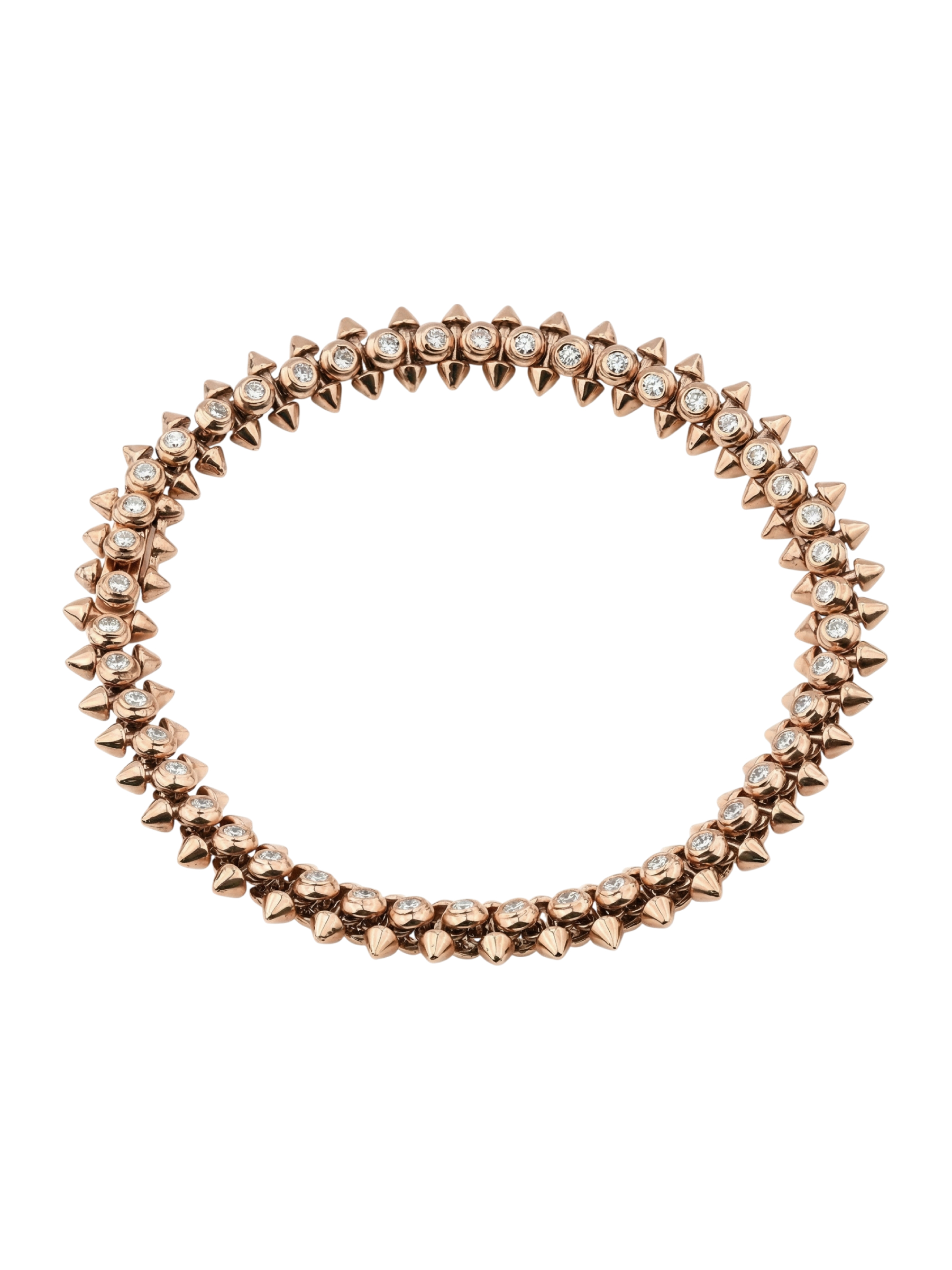 Браслет доступен для заказа в широкой размерной сетке, включающей варианты 16, 16.5, 17, 17.5, 18, 18.5 и 19. Каждое изделие отличается высоким качеством исполнения и проработанностью деталей. Выбирая данное украшение, вы делаете ставку на актуальный дизайн, который будет уместен в любой ситуации. Найдите свой идеальный размер и добавьте в свою коллекцию аксессуар, сочетающий в себе роскошь бриллиантов и бунтарский стиль шипов.