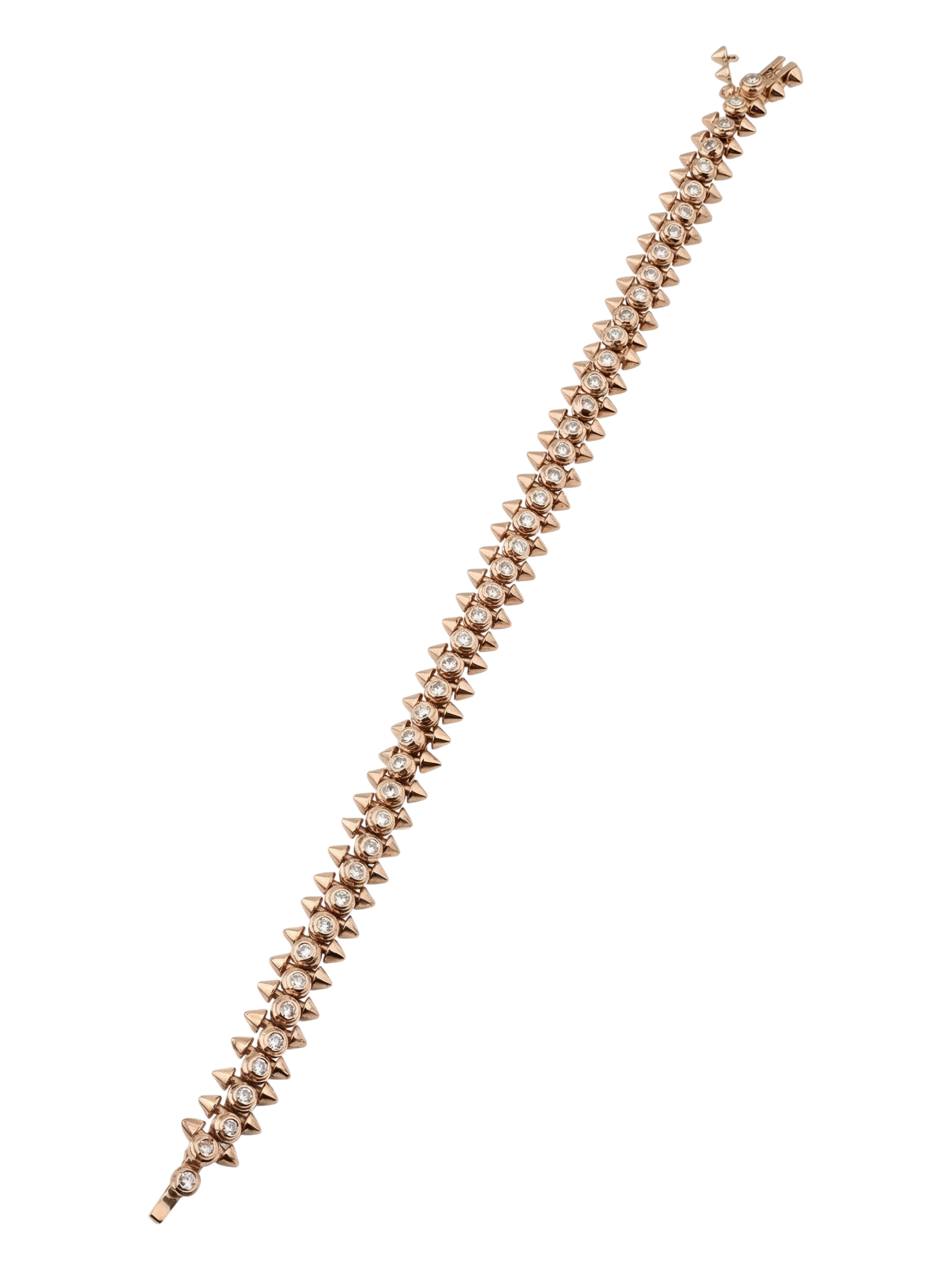 Композицию браслета дополняют 326 бриллиантов, которые изящно инкрустированы в металл. Камни круглой формы отличаются безупречным белым цветом, создавая великолепную игру света и контраст с теплым розовым золотом. Этот аксессуар станет идеальным дополнением вашего образа, подчеркивая индивидуальность и вкус владельца. Модель идеально подходит для создания стильных ювелирных комплектов.