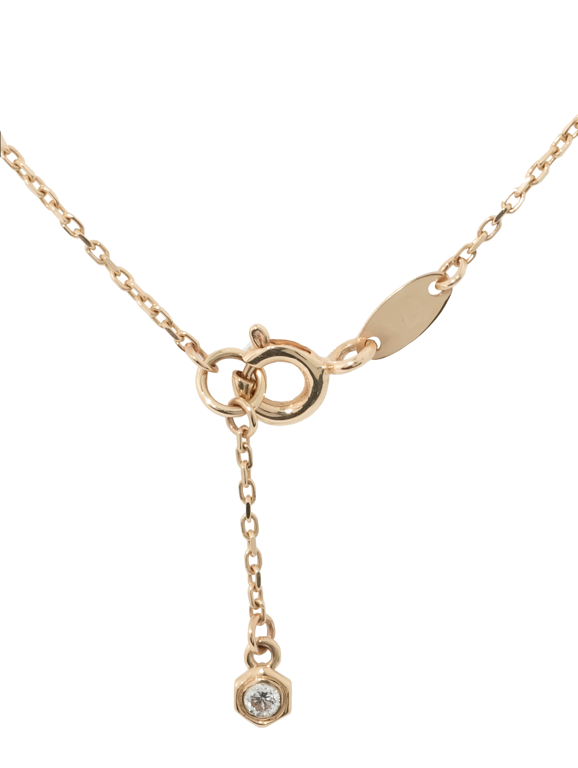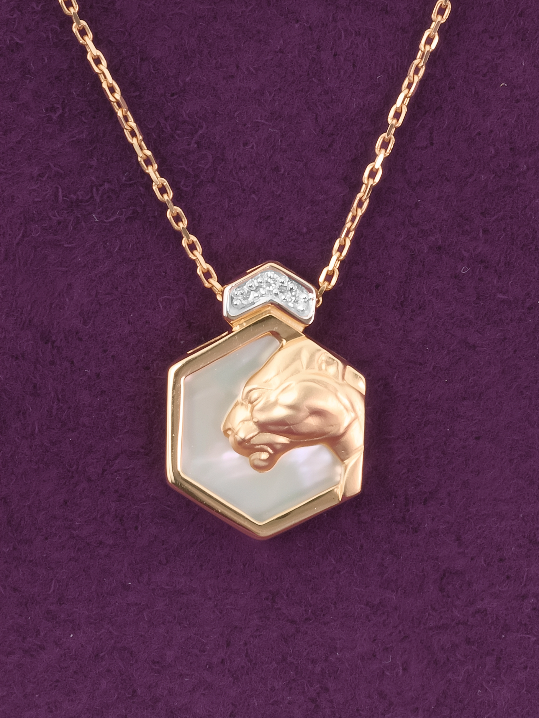 Колье из красного золота 585 пробы из коллекции De Luxe — Гексагон воплощает в себе дерзость и утонченную элегантность. Центральным элементом украшения стал выразительный дизайн в виде головы пантеры, который придает образу нотки хищной грации и уверенности. Ювелиры выбрали для композиции необычную форму вставок — основу в виде шестигранника дополняет изысканный перламутр, создающий мягкое сияние. В верхней части декоративного элемента расположены бриллианты круглой формы белого цвета, которые добавляют благородного блеска и роскоши.