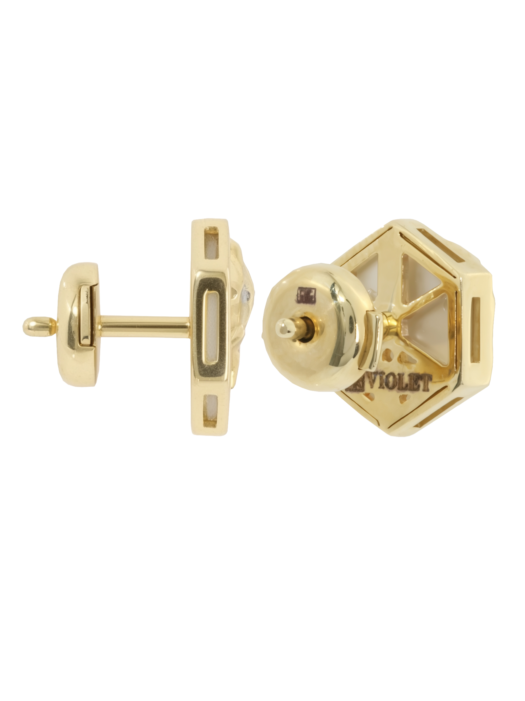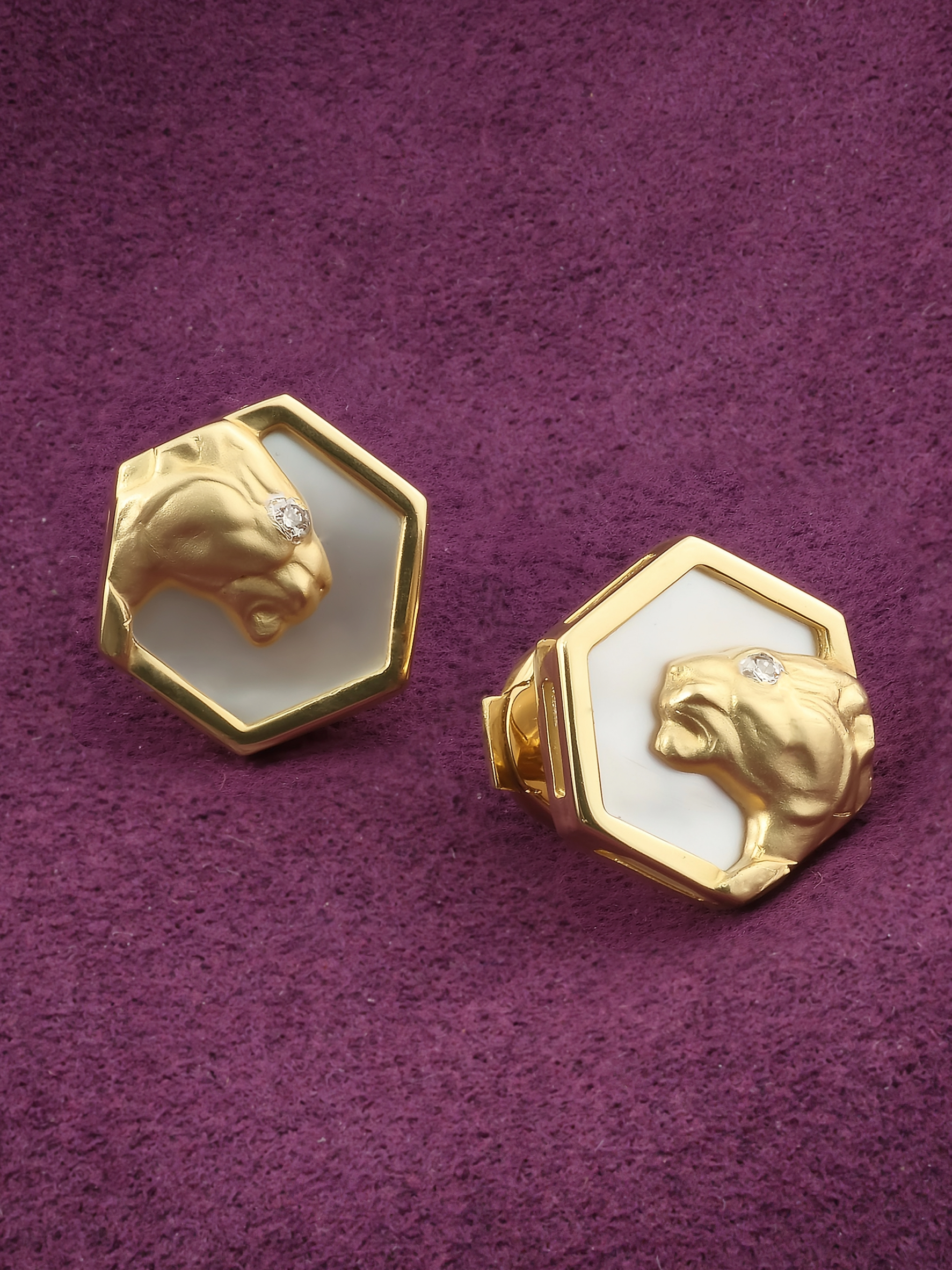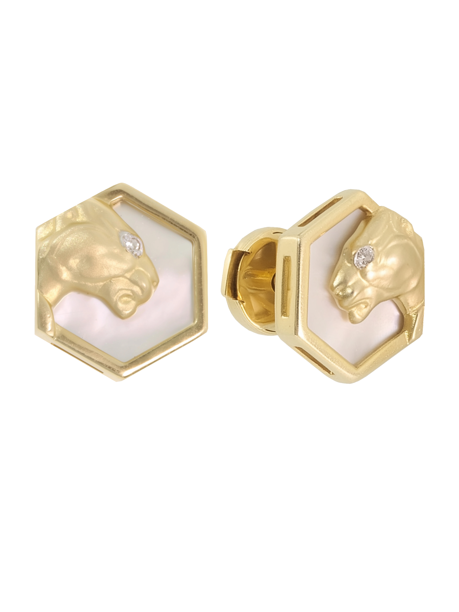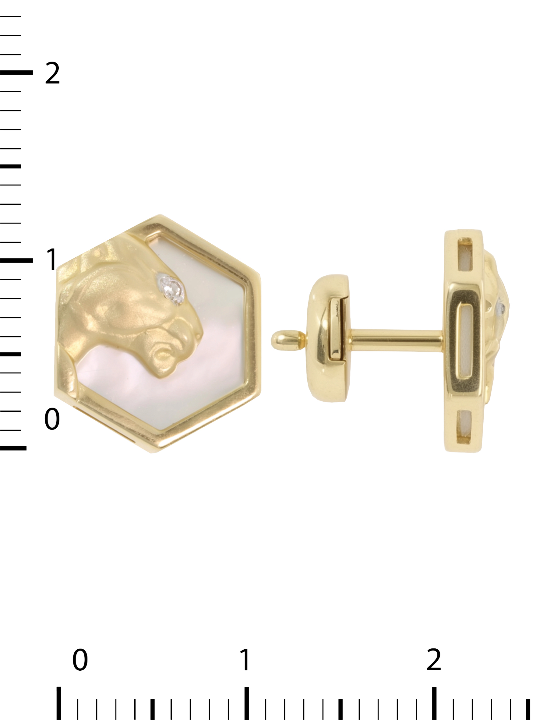Эстетику модели подчеркивает изысканное сочетание материалов. Нежное сияние перламутра с белым оттенком служит идеальным фоном для золотых хищников, а акцентные бриллианты круглой формы добавляют изделию необходимого блеска и премиального сияния. Всего в паре украшений использовано 2 вставки, каждая из которых подчеркивает мастерство исполнения.