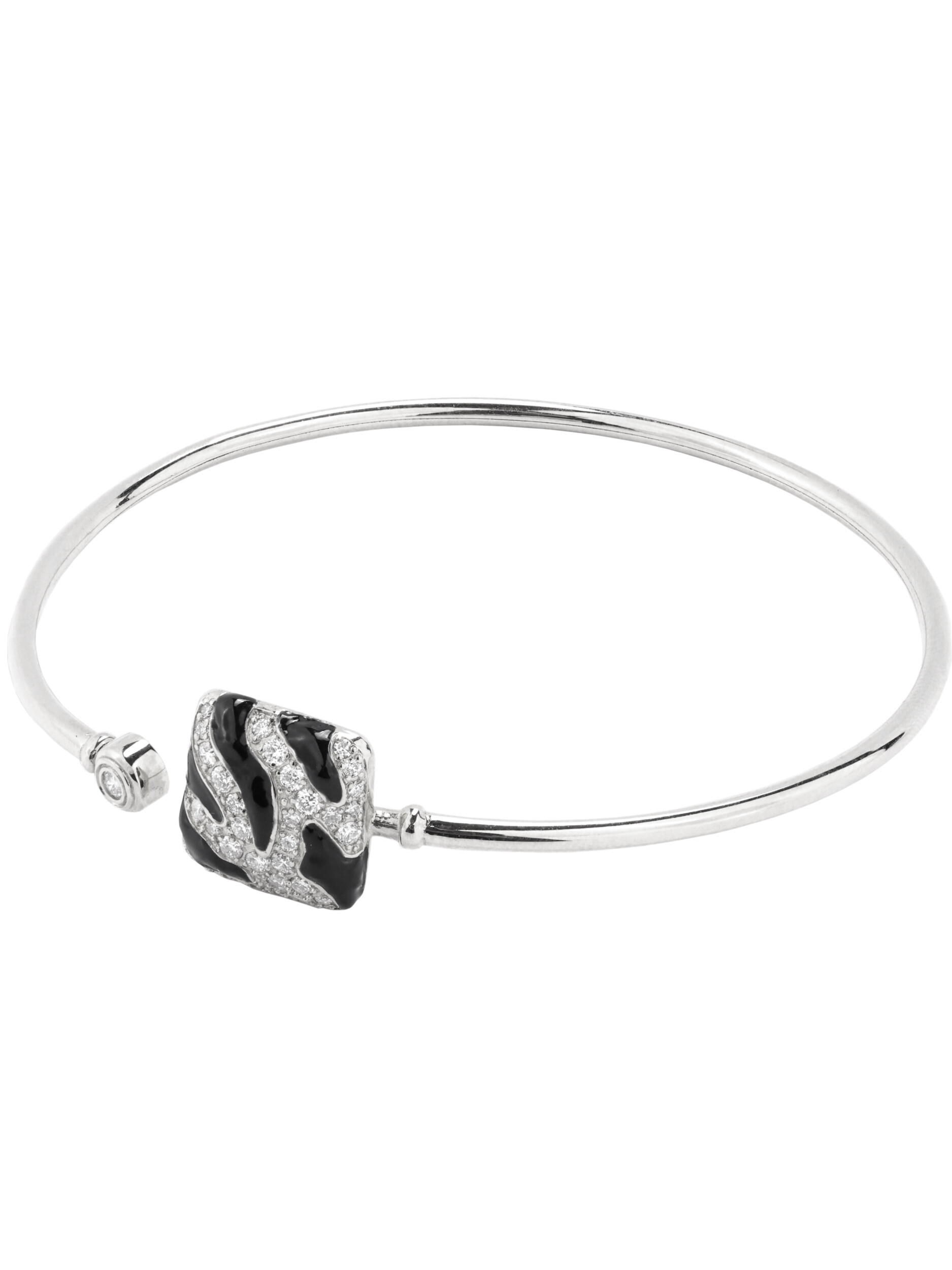 Ювелиры украсили композицию 35 бриллиантами круглой огранки, чье сияние подчеркнуто глянцевой эмалью. Холодный блеск металла гармонично сочетается с драгоценными камнями, придавая браслету современный и статусность вид. Белый цвет материала подчеркивает чистоту линий и изысканность работы.