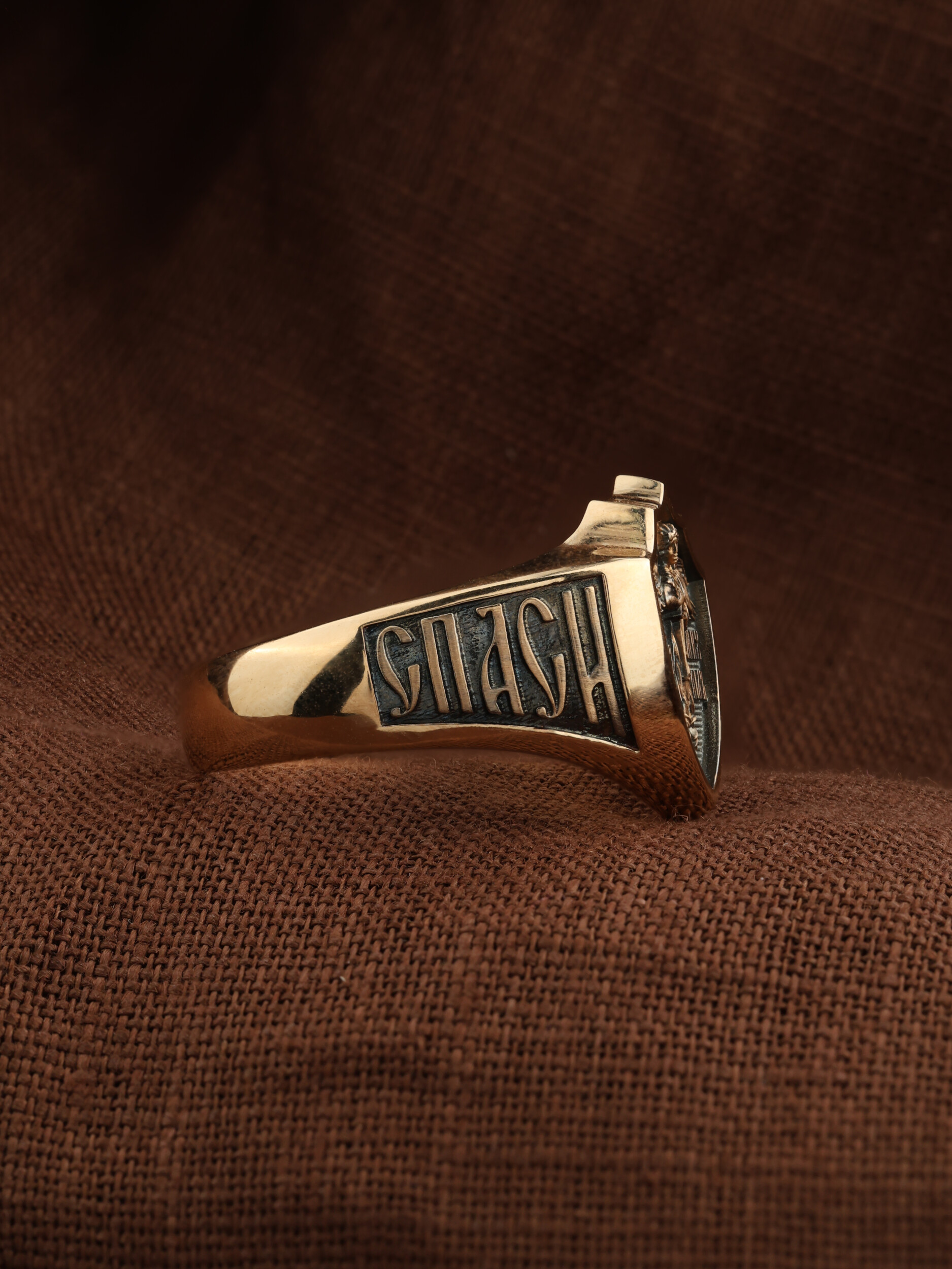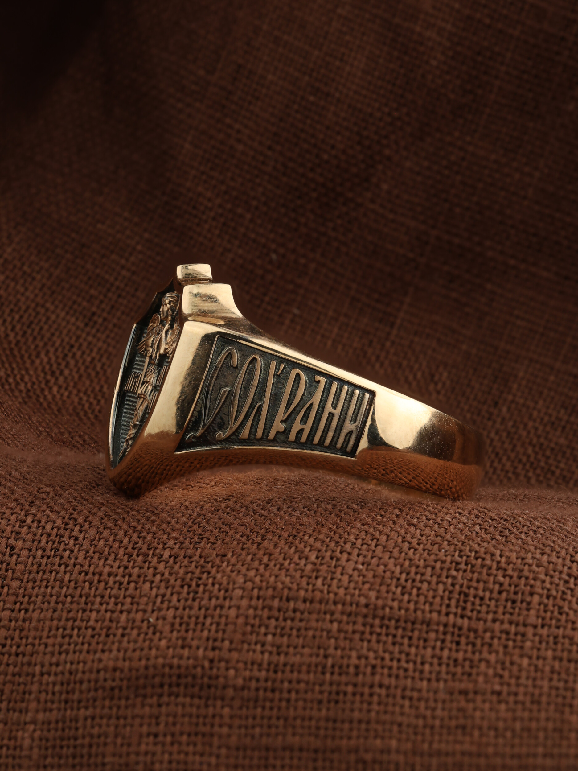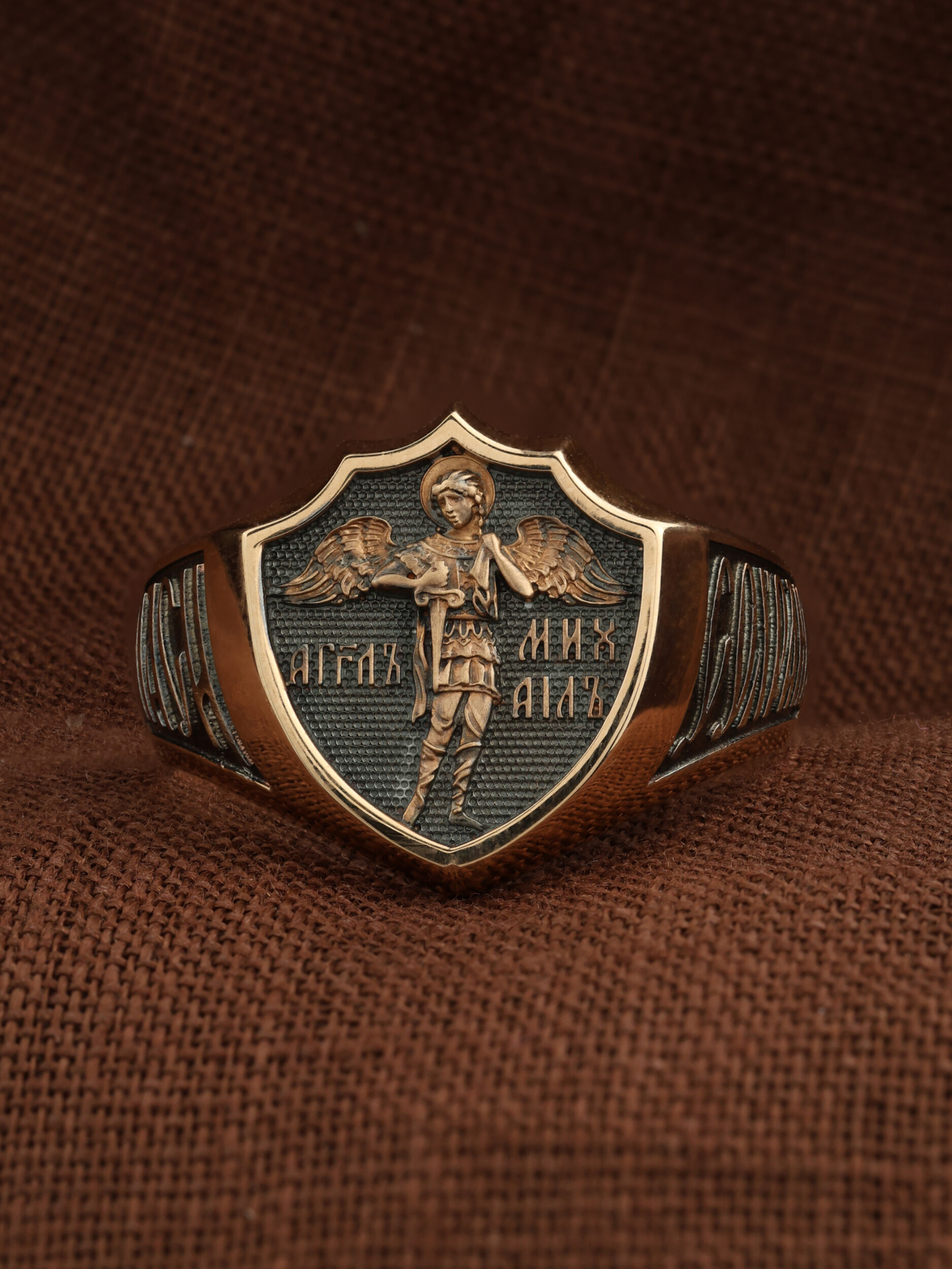 Кольцо «Архангел Михаил» выполнено в древних христианских традициях. Архангел Михаил — верный служитель Божий, который низринул с Неба возгордившегося денницу с другими павшими духами. В Православии его называют Архистратигом, что означает глава святого воинства Ангелов и Архангелов. Архангел Михаил изображен в воинственном виде с огненным мечом в правой руке и щитом в левой. Архангел почитается как покровитель воинов и всех верных Богу и ведущих борьбу против сил зла, борец против ересей, а также защитник душ умерших, страж райских врат. С древних времен прославлен своими чудесами Архангел Михаил на Руси. Примеров явления и помощи Архистратига Михаила в русской истории бессчетно. Архангел Михаил не перестает ратоборствовать за славу Творца и Господа всяческих, за дело спасения рода человеческого, за церковь и чад ее. И, согласно, Откровению Иоанна Богослова во время последней битвы небесных и дьявольских сил Михаил и его ангелы опять низвергнут Люцифера вместе с его войском: «Михаил и Ангелы его воевали против дракона, и дракон и ангелы его воевали [против них], но не устояли, и не нашлось уже для них места на небе. И низвержен был великий дракон, древний змий, называемый диаволом и сатаною, обольщающий всю вселенную, низвержен на землю, и ангелы его низвержены с ним» (Откр.12:7−9).