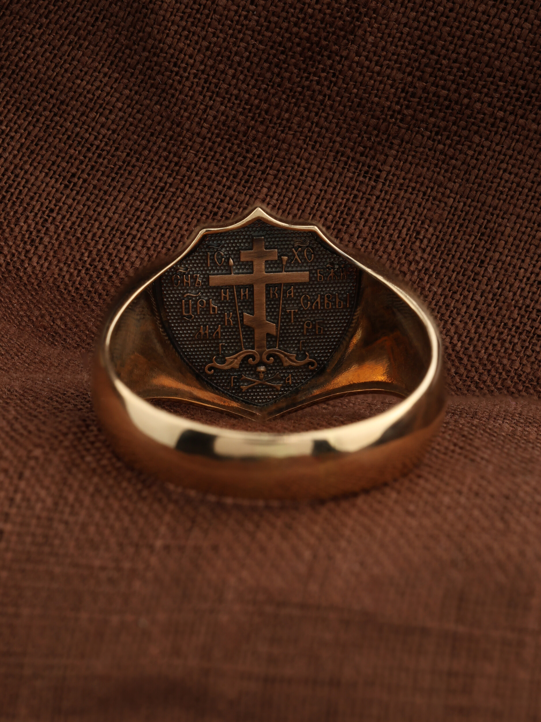 С внутренней стороны кольца изображен «Голгофский крест». Центральным и главным элементом композиции лицевой стороны является восьмиконечный крест — образ Честного и Животворящего Креста Господня, установленного на горе Голгофе. В основании креста изображена гора Голгофа, на которой был распят Спаситель и череп Адама, чьи кости по приданию омыла кровь Иисуса Христа. Перед головой располагаются лежащие кости рук, изображаются правая на левой, как при погребении или причащении. В XVI веке на Руси около изображения Голгофы появились обозначения «М.Л.Р.Б.» — Место Лобное Рай Бысть (Голгофа в переводе с еврейского — Лобное место). Чуть ниже справа и слева буквы «Г.Г.» — гора Голгофа.