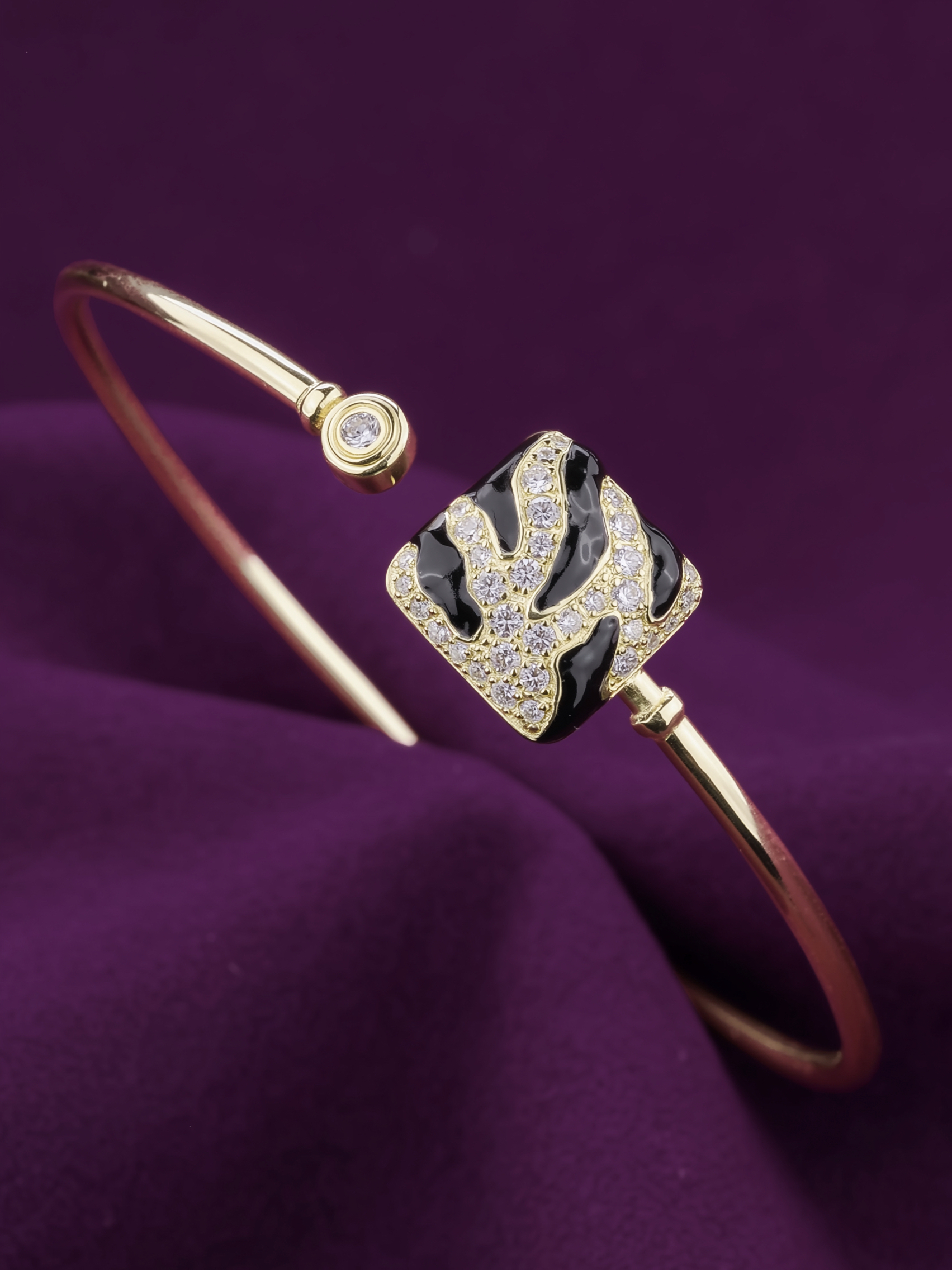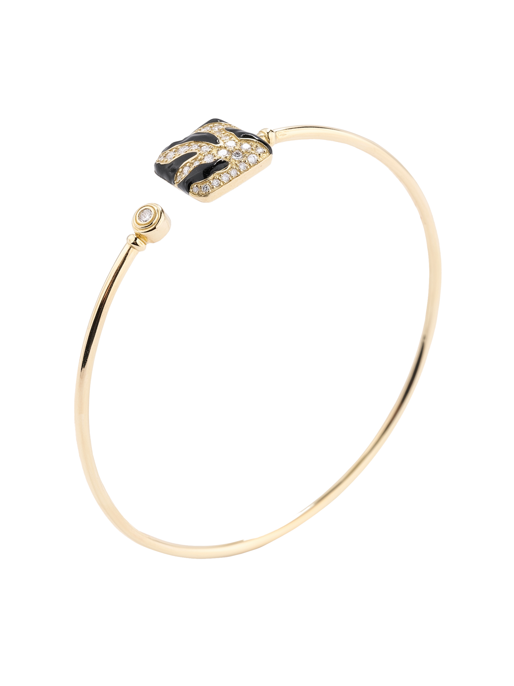 Эффектный браслет из лимонного золота 585 пробы — украшение, которое мгновенно приковывает взгляд своей дерзкой эстетикой. Изделие из De Luxe — Тигровый стиль — Бриллианты представляет собой сочетание благородного металла теплого оттенка и анималистичного дизайна. Центральная часть аксессуара выполнена в виде выразительного декоративного элемента с тигровым орнаментом, созданным с помощью контрастной черной эмали и россыпи сверкающих бриллиантов белого цвета.