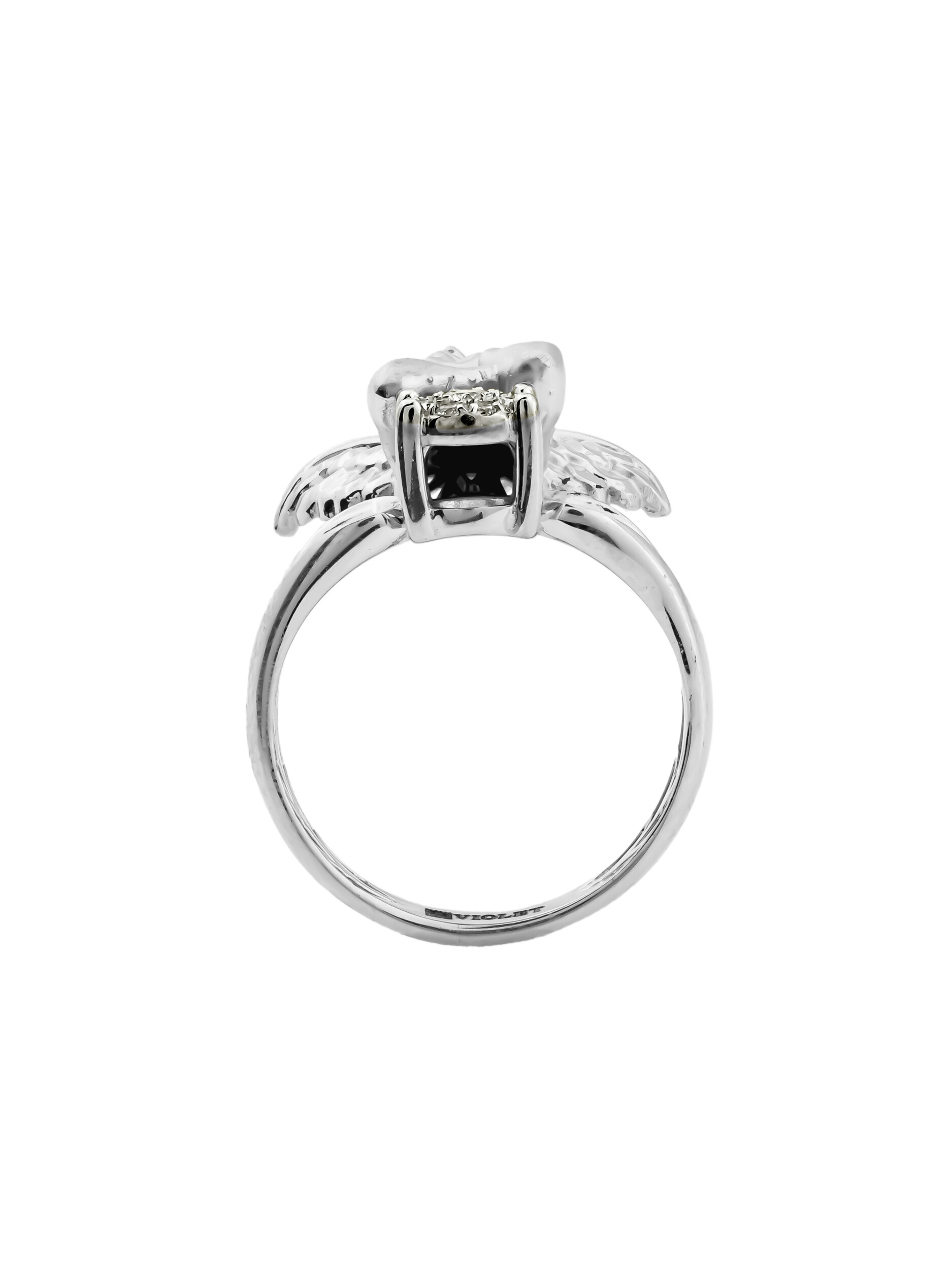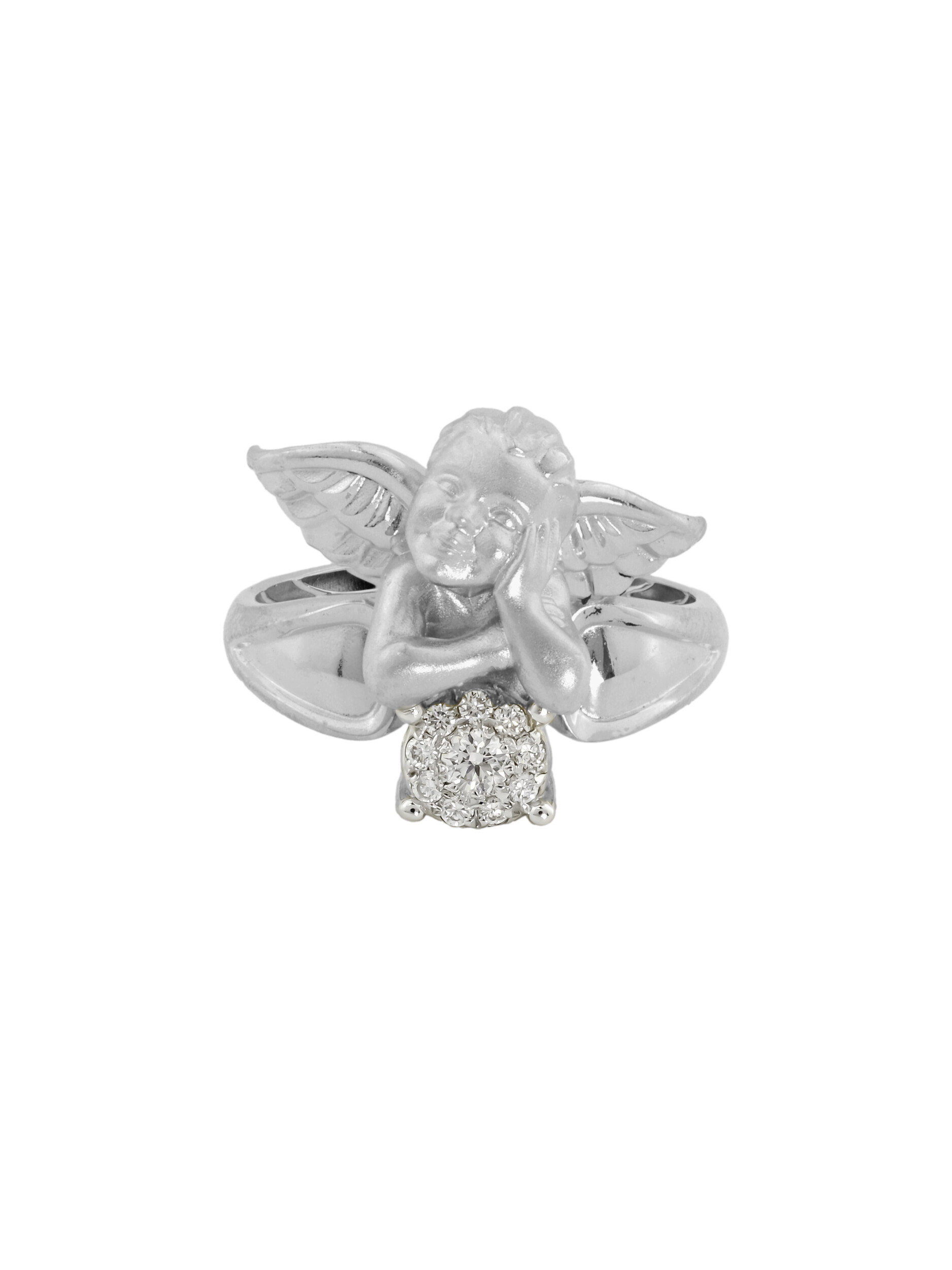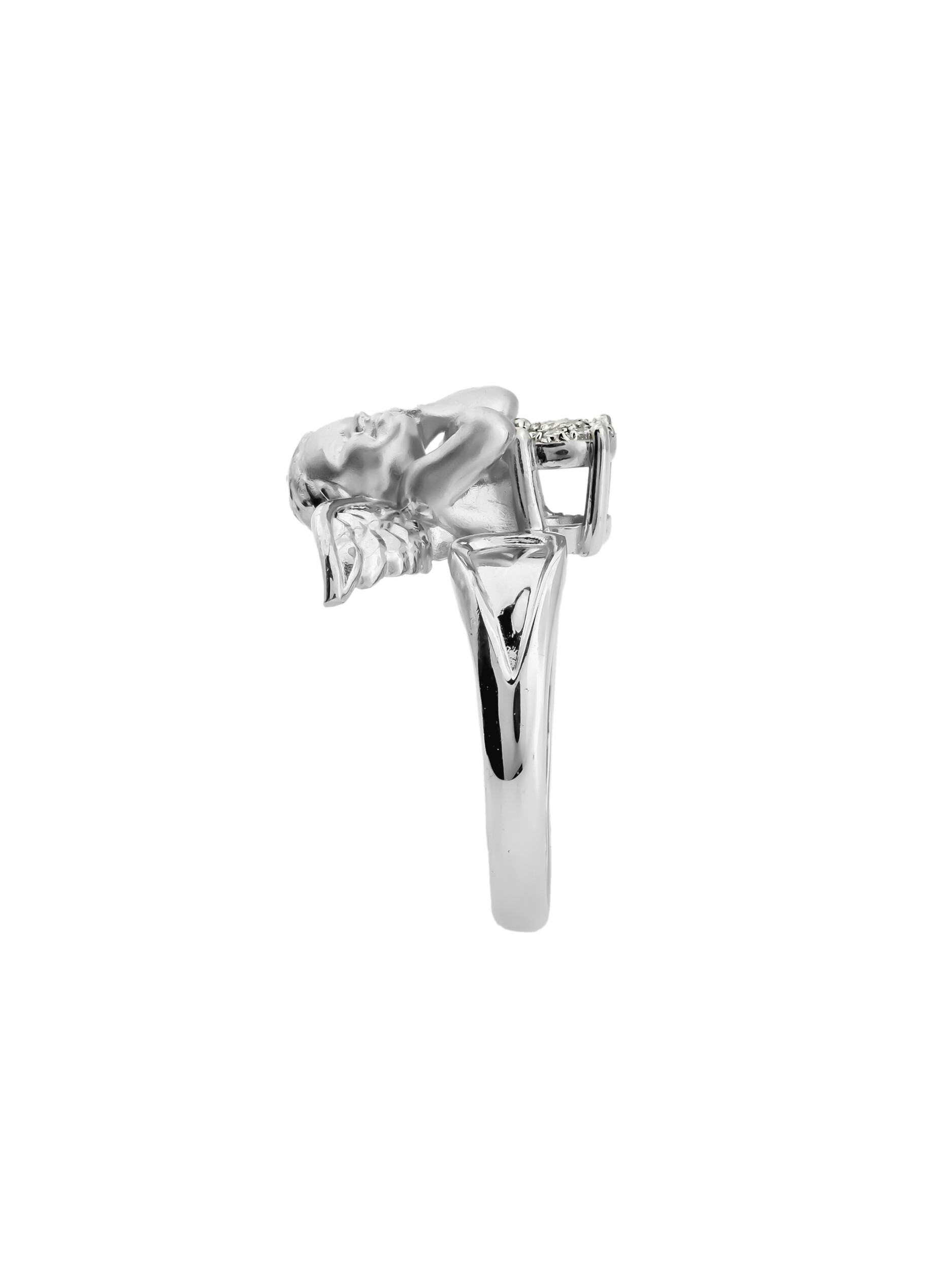 Кольцо из белого золота с бриллиантами — это утонченное украшение, которое станет воплощением нежности и элегантности в вашей ювелирной коллекции. Изделие выполнено из высококачественного белого золота 585 пробы, что обеспечивает долговечность и благородный блеск на долгие годы. Дизайн модели отличается оригинальностью: центральным элементом выступает фигурка купидона, мастерски выполненная ювелирами. Этот нежный образ придает украшению особое очарование и символизм.