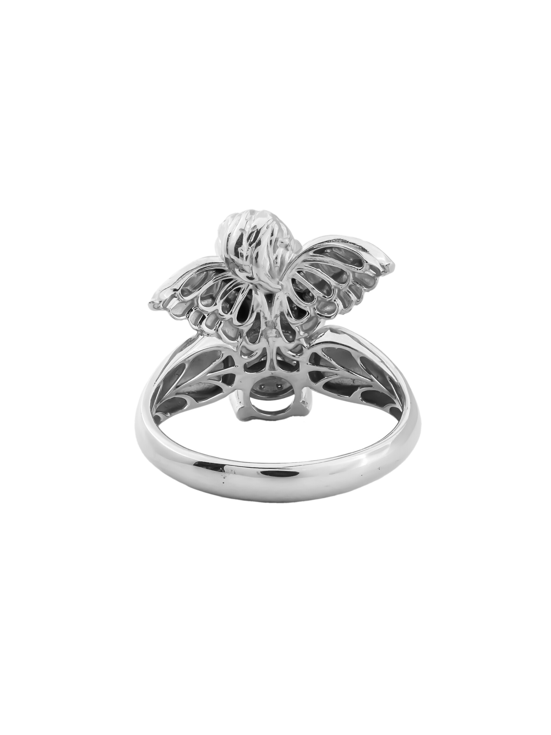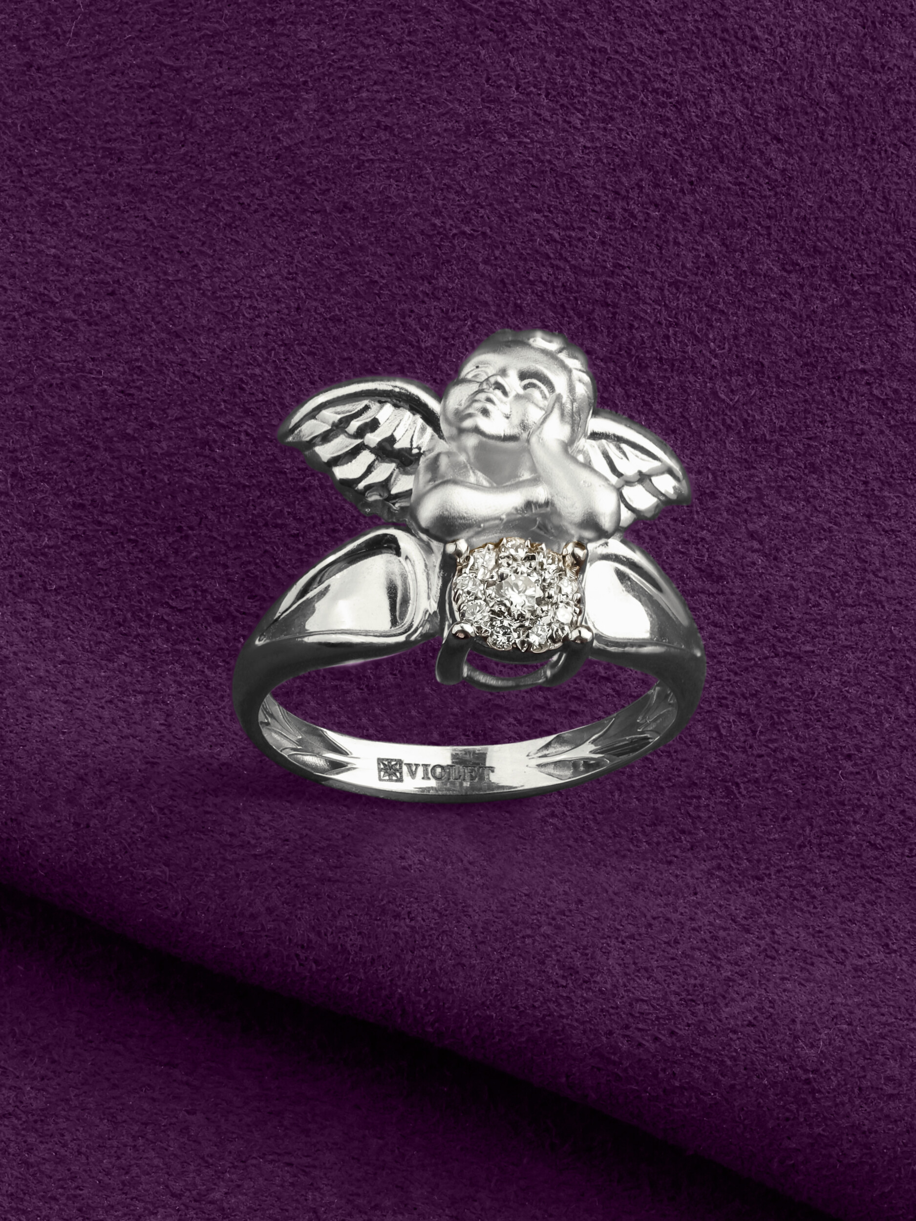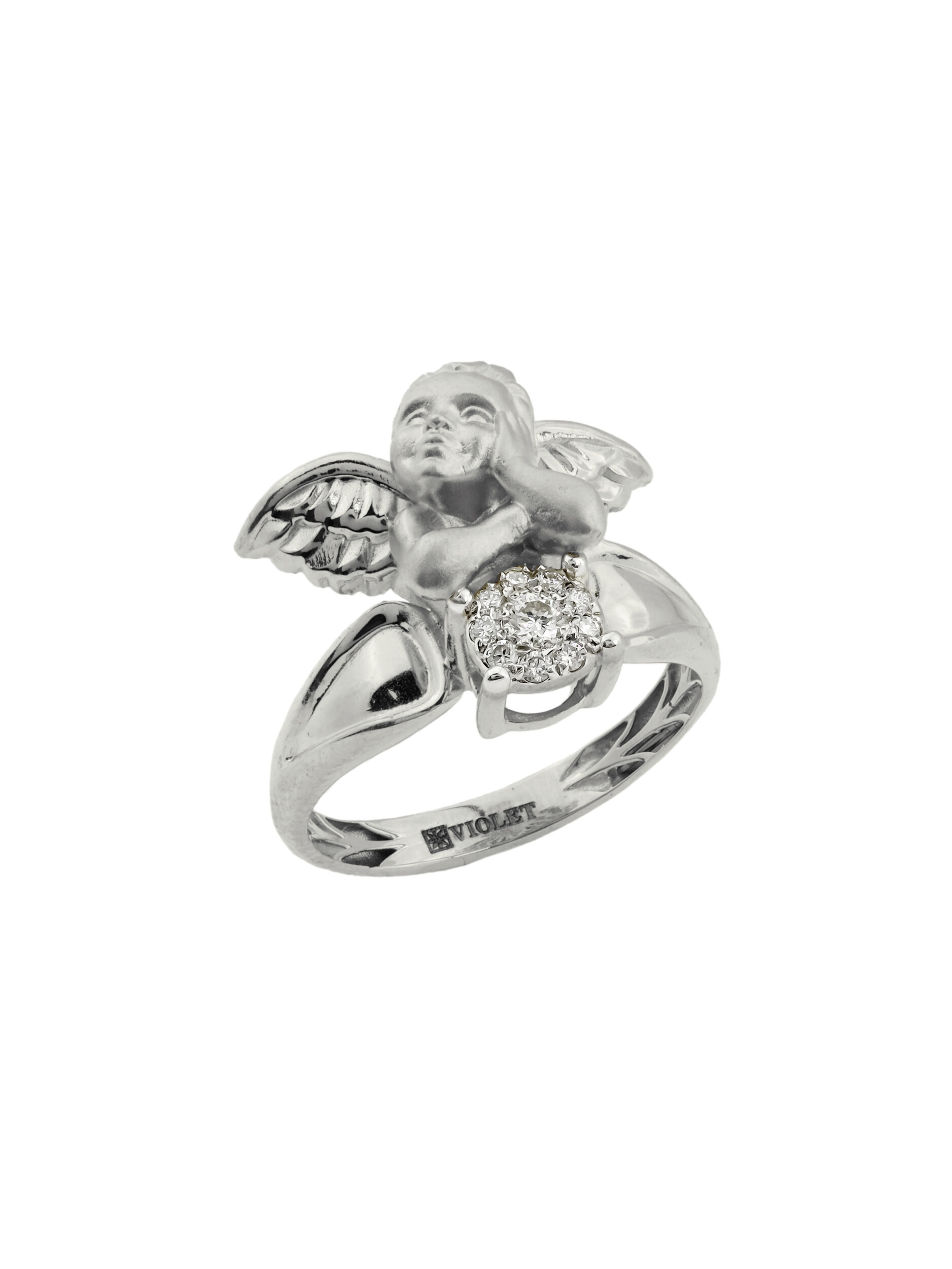 Кольцо из белого золота с бриллиантами — это утонченное украшение, которое станет воплощением нежности и элегантности в вашей ювелирной коллекции. Изделие выполнено из высококачественного белого золота 585 пробы, что обеспечивает долговечность и благородный блеск на долгие годы. Дизайн модели отличается оригинальностью: центральным элементом выступает фигурка купидона, мастерски выполненная ювелирами. Этот нежный образ придает украшению особое очарование и символизм.