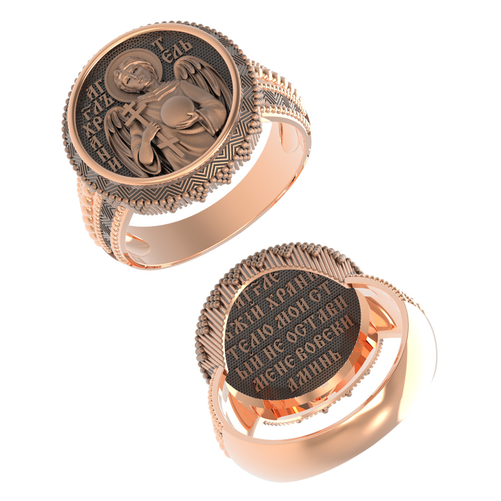 Кольцо «Святой Ангел-Хранитель " выполнено в древних христианских традициях. Ангел-Хранитель — это Ангел приставляемый Богом к человеку при крещении для охраны и помощи в добрых делах. Он невидимо находится при человеке на протяжении всей его жизни, если человек сохраняет в себе любовь к Богу и истинную веру перед Ним. Ангел-Xранитель делают для нас все, что служит к истинному нашему благу и спасению. Невидимо пребывая при нас постоянно, он, руководствуя нас ко спасению, не только по нашему желанию таинственно наставляет нас на все доброе и полезное, не только возносит наши молитвы к Богу, но еще и сам от себя охраняют и защищают нас от врагов видимых и невидимых и ходатайствует за нас пред Богом. Ангел-Хранитель так любит нас, как никто на земле любить не может. Ангел-Хранитель — присный друг наш, незримый тихий собеседник, пресладостный утешитель. Одного лишь каждому из нас он желает — спасения души; к этому он направляет все свои заботы. И если видит нас также заботящимися о спасении, радуется, если же видит нас пребывающими в нерадении о душе своей, скорбит.