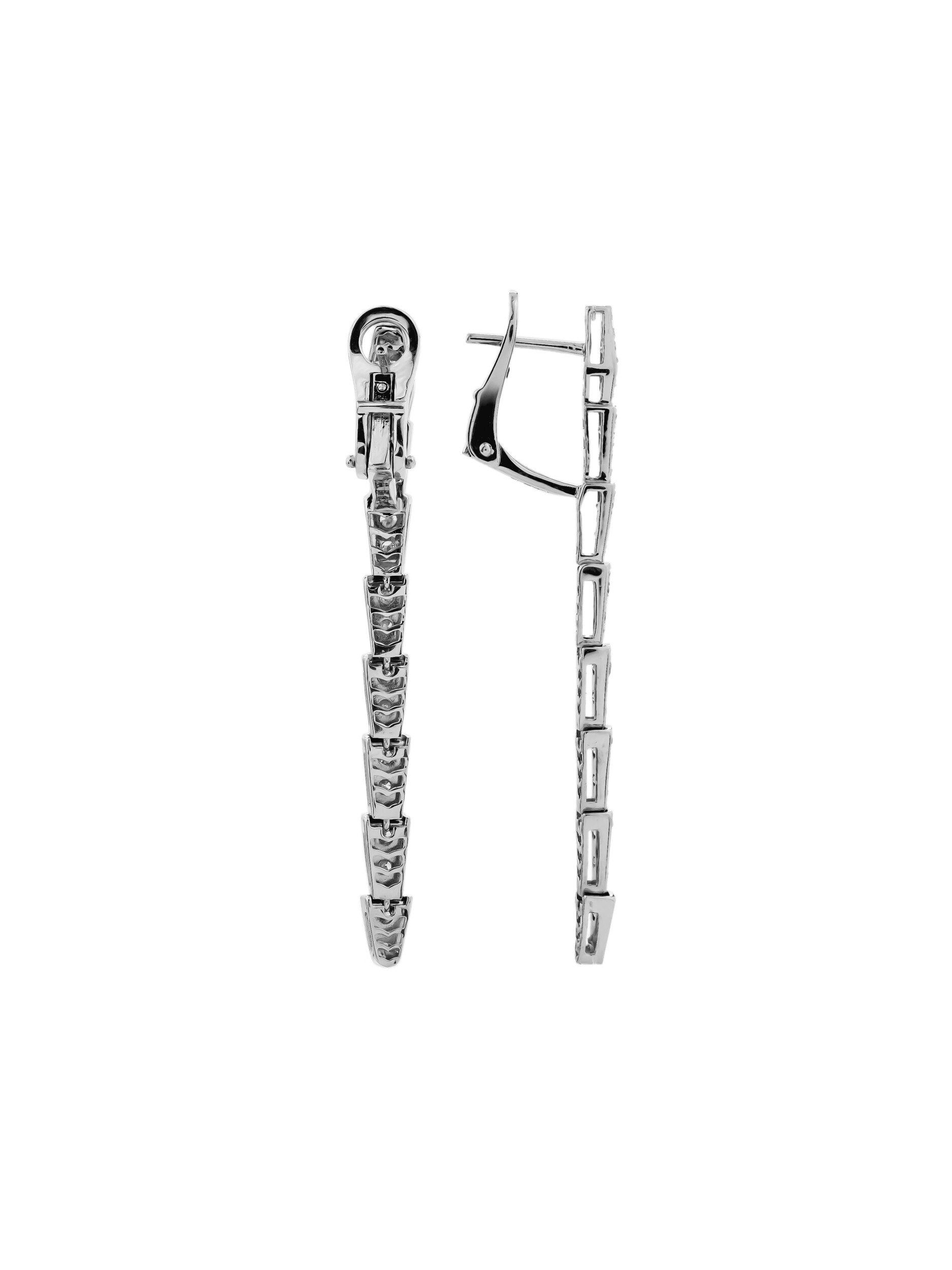 Серьги из белого золота 585 пробы из коллекции De Luxe — Серпенти представляют собой воплощение дерзкой эстетики и ювелирного мастерства. В дизайне изделия угадываются грациозные линии скорпионов, чье тело сегментировано и плавно изгибается, подчеркивая динамику форм. Лаконичный и холодный блеск белого металла идеально сочетается с драгоценными вставками.