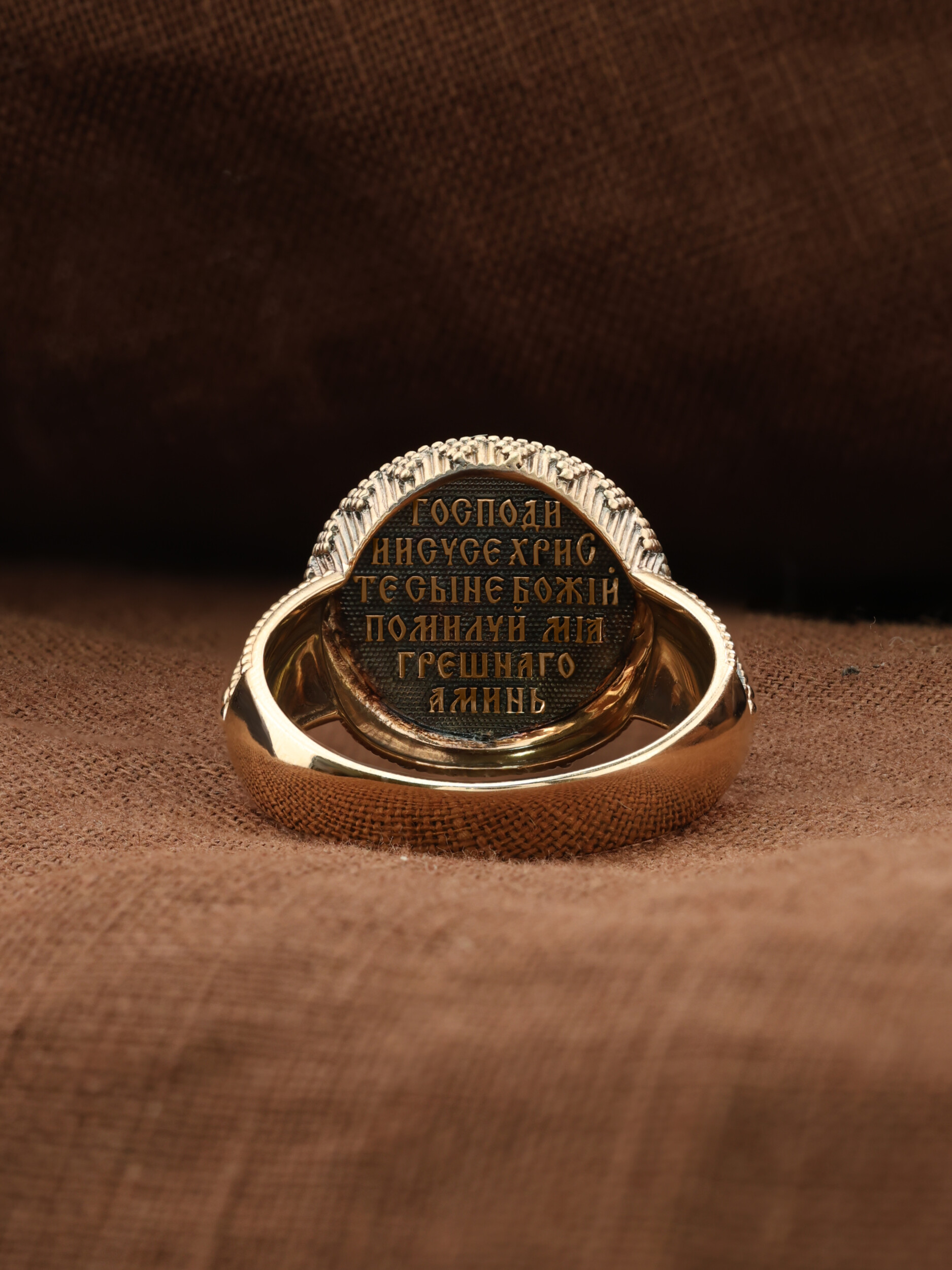 Кольцо «Господь Вседержитель» выполнено в древних христианских традициях. Господь Вседержитель или Пантократор (от греч. всевластный, всесильный). Он представлен как Царь Небесный и будущий Судия мира. Именование Иисуса «Вседержителем» указывает, с одной стороны, на Его Божественную природу: «Аз есмь Альфа и Омега, начало и конец, говорит Господь, Который есть и был и грядет, Вседержитель» (Откр. 1: 8). С другой стороны, такое именование связано и с человеческой природой Христа, искупившего крестной жертвой людские грехи и обновившего тем самым человеческую природу. Господь Иисусь Христос изображен фронтально огрудно. Главу Спасителя осеняет нимб, на нем угадывается крест. Крест символизирует голгофскую жертву Спасителя. По греческой традиции, на нимбе написаны буквы Омега, Омикрон, Ню — вместе они обозначают слово Сущий, одно из имен и характеристику Бога, согласно Священному Писанию. Правой рукой Он благословляет, а левой держит Евангелие — благую весть, принесенную Христом всему миру. Также означает она тот новый мир, который будет сотворен Богом после второго пришествия Христа. Символизирует и Книгу Жизни, где записаны имена всех, возлюбивших Бога. Всемогущий Бог предстает здесь не как обличающий судья, а как милостивый отец, ждущий возвращения блудных детей.