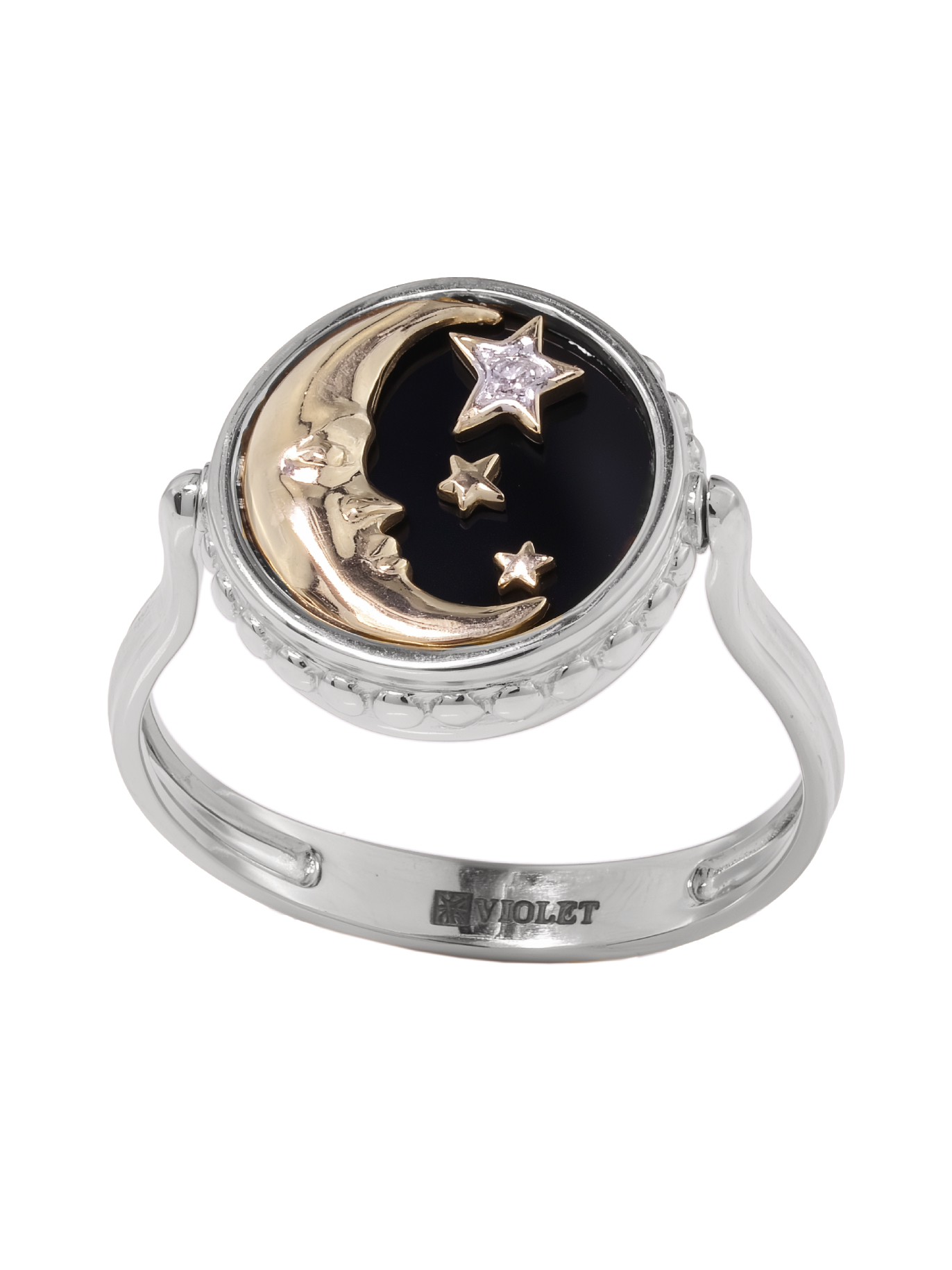 Основу композиции составляет контрастное сочетание материалов. Глубокий чёрный оникс служит эффектным фоном для декоративных элементов, создавая ощущение бесконечного космоса. На нём изящно располагаются фигурки небесных тел: изысканный полумесяц и сверкающие звёзды. Инкрустация бриллиантами круглой огранки добавляет благородного сияния, создавая яркий акцент на фоне тёмного камня. В изделии гармонично переплетаются вставки: белый перламутр, чёрный оникс и искристые бриллианты, что подчеркивает высокий статус украшения.