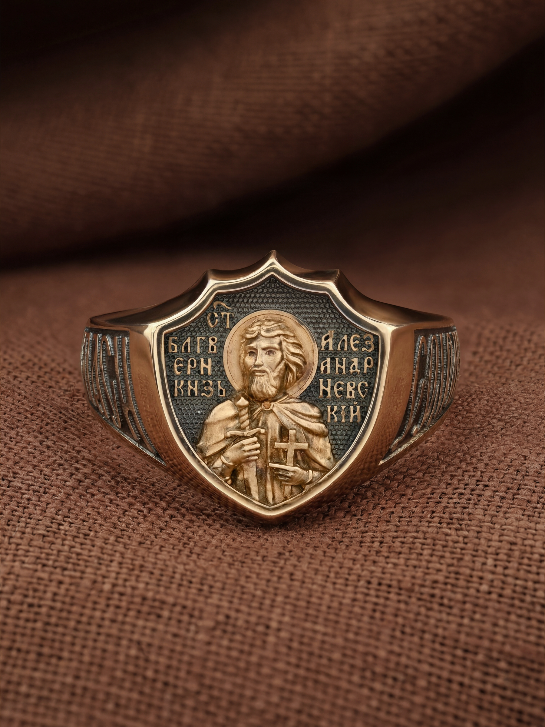 С внутренней стороны кольца изображен «Голгофский крест». Центральным и главным элементом композиции лицевой стороны является восьмиконечный крест — образ Честного и Животворящего Креста Господня, установленного на горе Голгофе. В основании креста изображена гора Голгофа, на которой был распят Спаситель и череп Адама, чьи кости по приданию омыла кровь Иисуса Христа. Перед головой располагаются лежащие кости рук, изображаются правая на левой, как при погребении или причащении. В XVI веке на Руси около изображения Голгофы появились обозначения «М.Л.Р.Б.» — Место Лобное Рай Бысть (Голгофа в переводе с еврейского — Лобное место). Чуть ниже справа и слева буквы «Г.Г.» — гора Голгофа.
