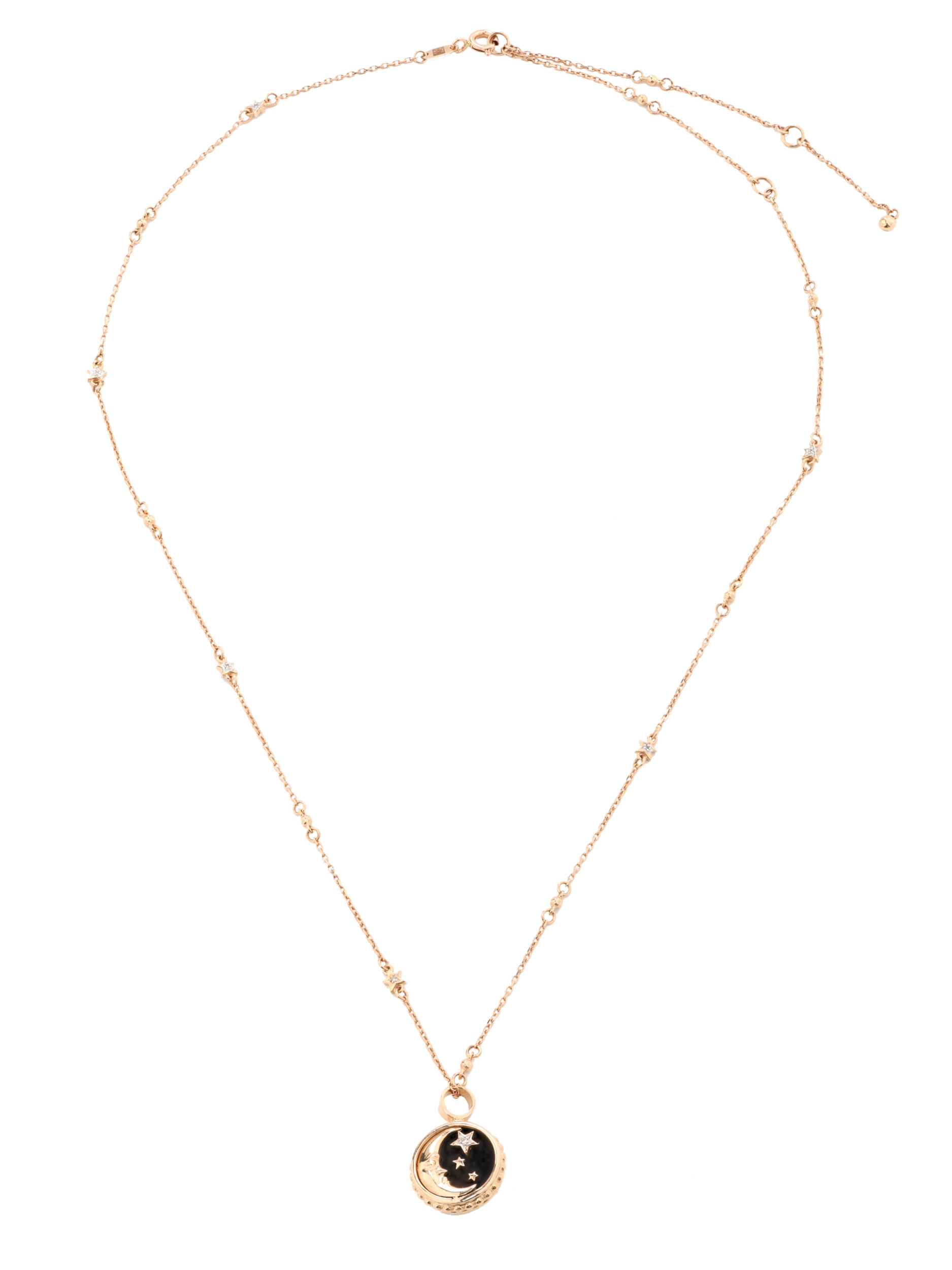 Колье из красного золота 585 пробы из коллекции De Luxe — Солнце и Луна станет утонченным дополнением вашего образа. Дизайн украшения, вдохновленный небесными светилами, обыгрывает тему солнца и луны, создавая загадочный и притягательный визуальный акцент. Центральная подвеска круглой формы выполнена с искусной детализацией: контрастное сочетание черного оникса и нежного перламутра подчеркивает сияние драгоценных камней. Изделие инкрустировано 15 вставками, среди которых чистые бриллианты, создающие эффект звездного неба.
