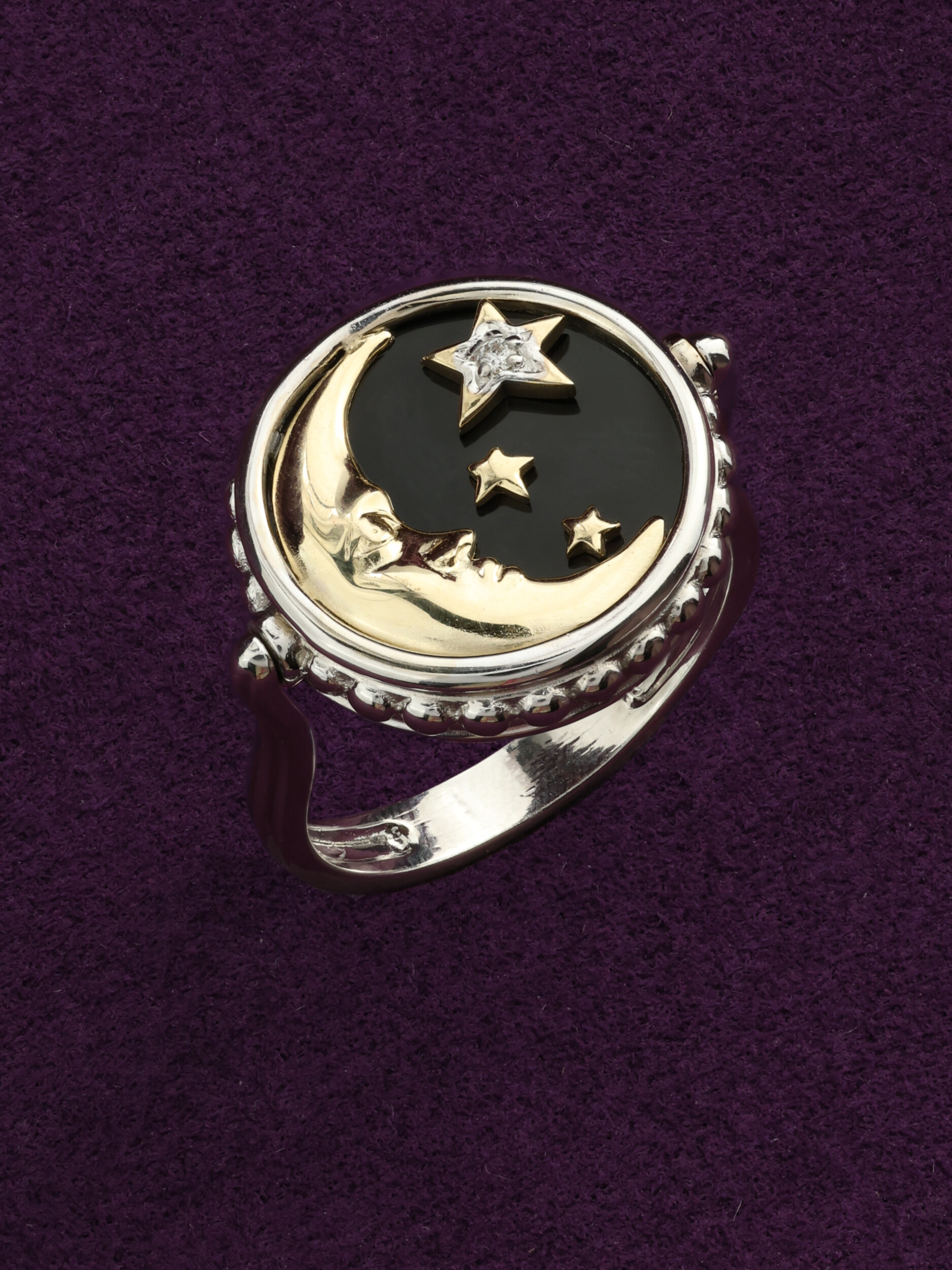 В центре композиции расположен глубокий черный оникс, на фоне которого сияет золотой полумесяц и изящные звезды. Инкрустация включает 3 вставки: сверкающий бриллиант, классический оникс и нежный перламутр круглой формы. Цветовое сочетание вставок — белый, перламутровый и черный — придает аксессуару особую выразительность и статусность.