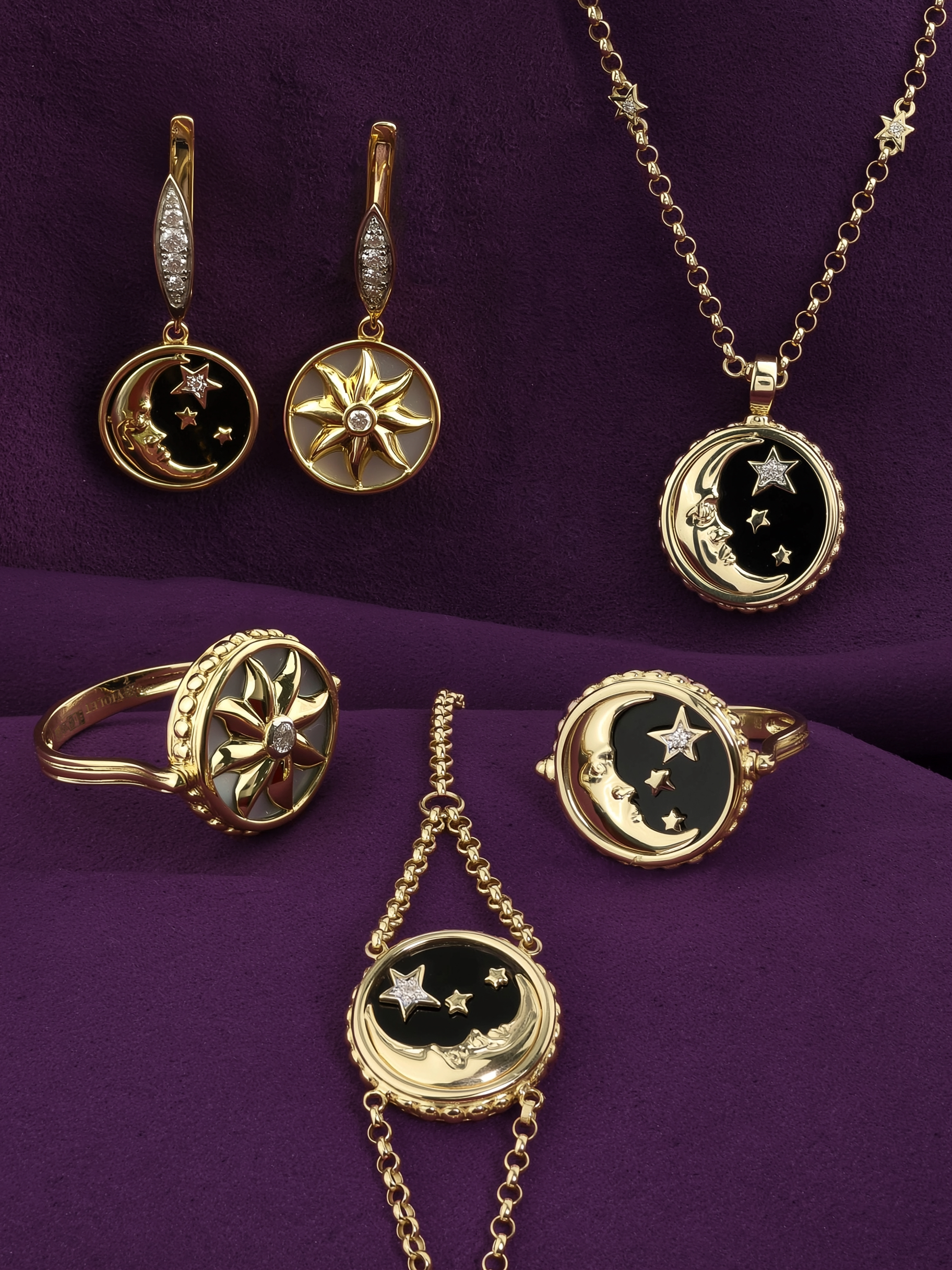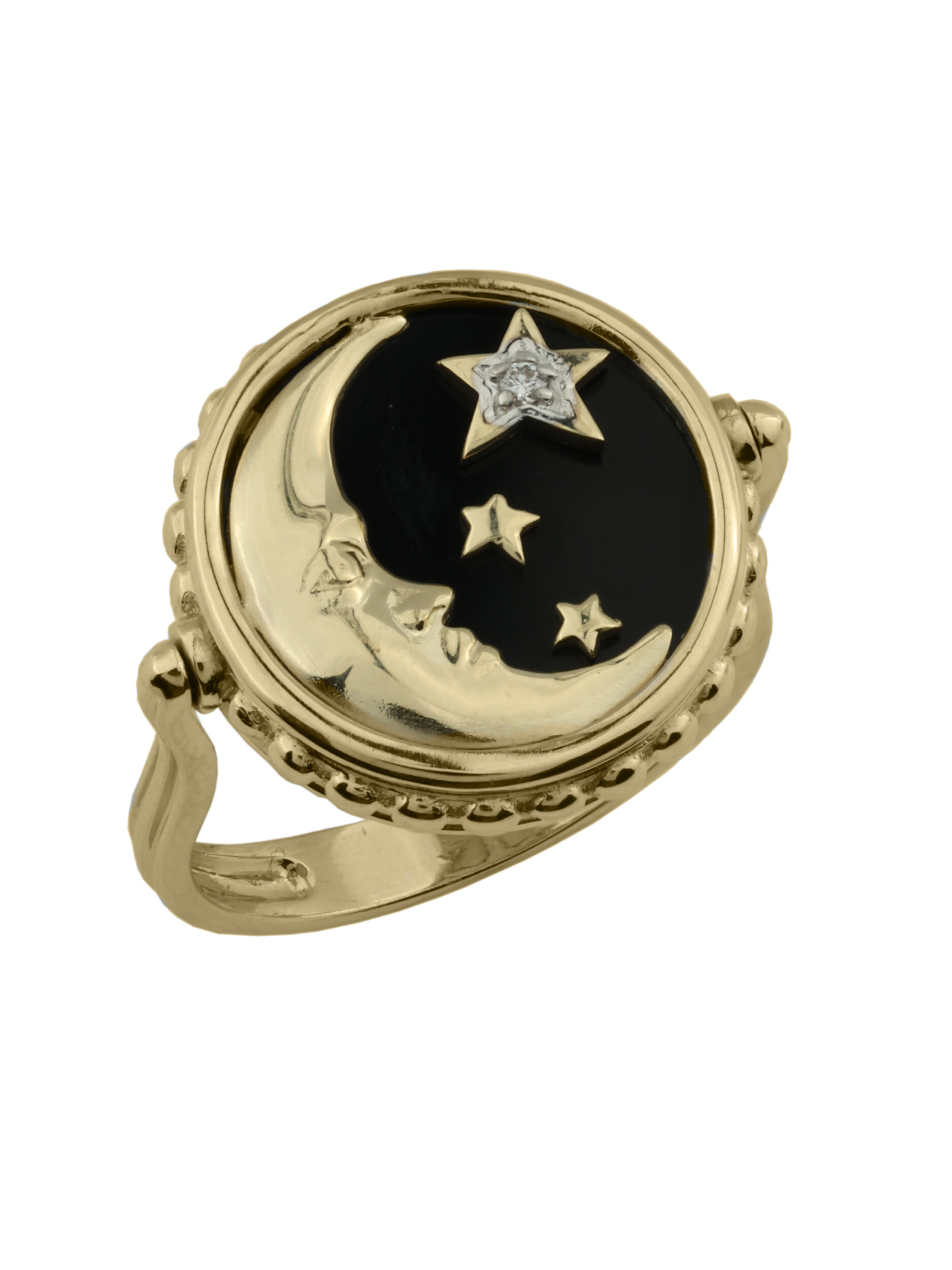 Кольцо из лимонного золота 585 пробы из коллекции De Luxe — Солнце и Луна воплощает в себе мистическую эстетику и высокое ювелирное мастерство. Дизайн украшения, вдохновленный образом Солнца и Луны, притягивает взгляд своей символичностью и глубиной. Центральная часть изделия выполнена в виде композиции с ониксом черного цвета, на фоне которого сияет золотой лик луны и три звезды. Изысканная игра контрастов дополняется блеском вставок: в изделии использовано 3 вставки круглой формы — бриллиант, оникс и перламутр, создающие переливчатое сочетание белого, перламутрового и черного оттенков.