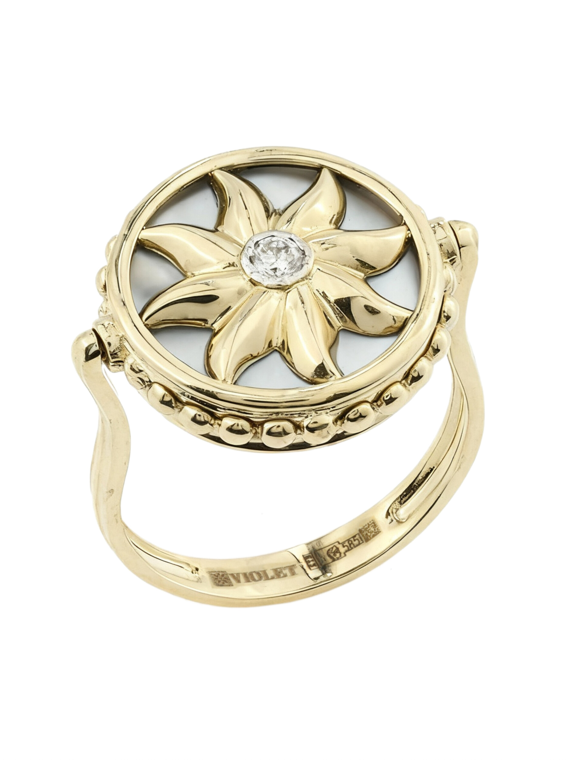 Кольцо из лимонного золота c бриллиантами, лазуритом и перламутром