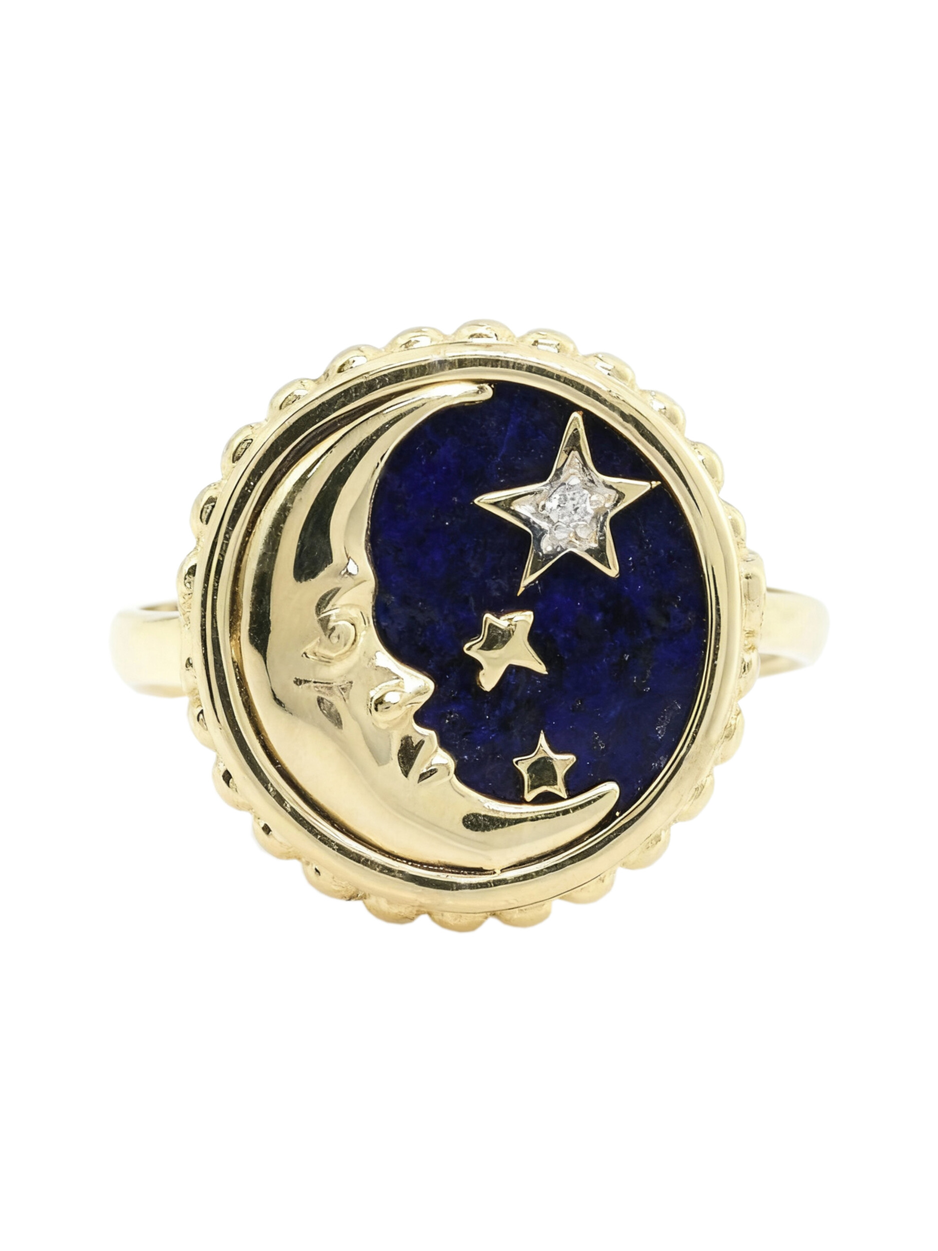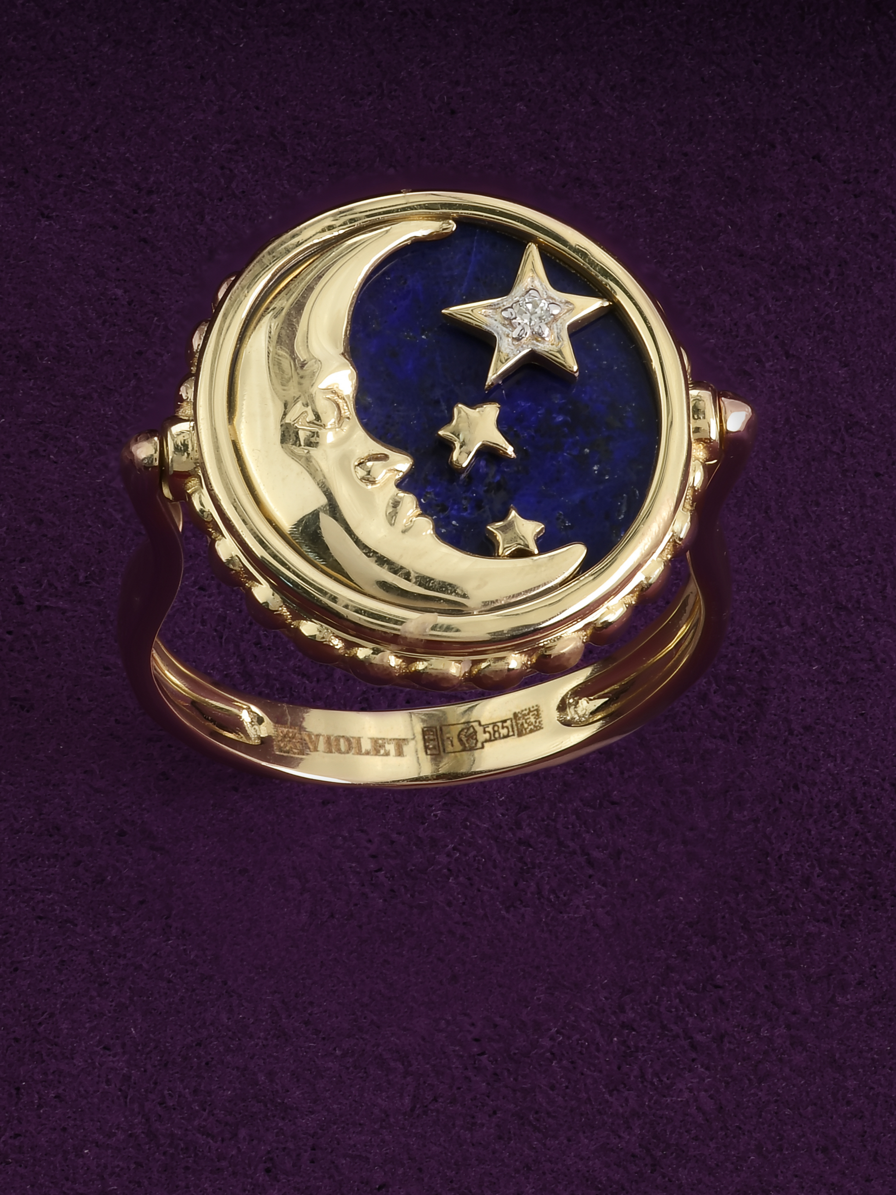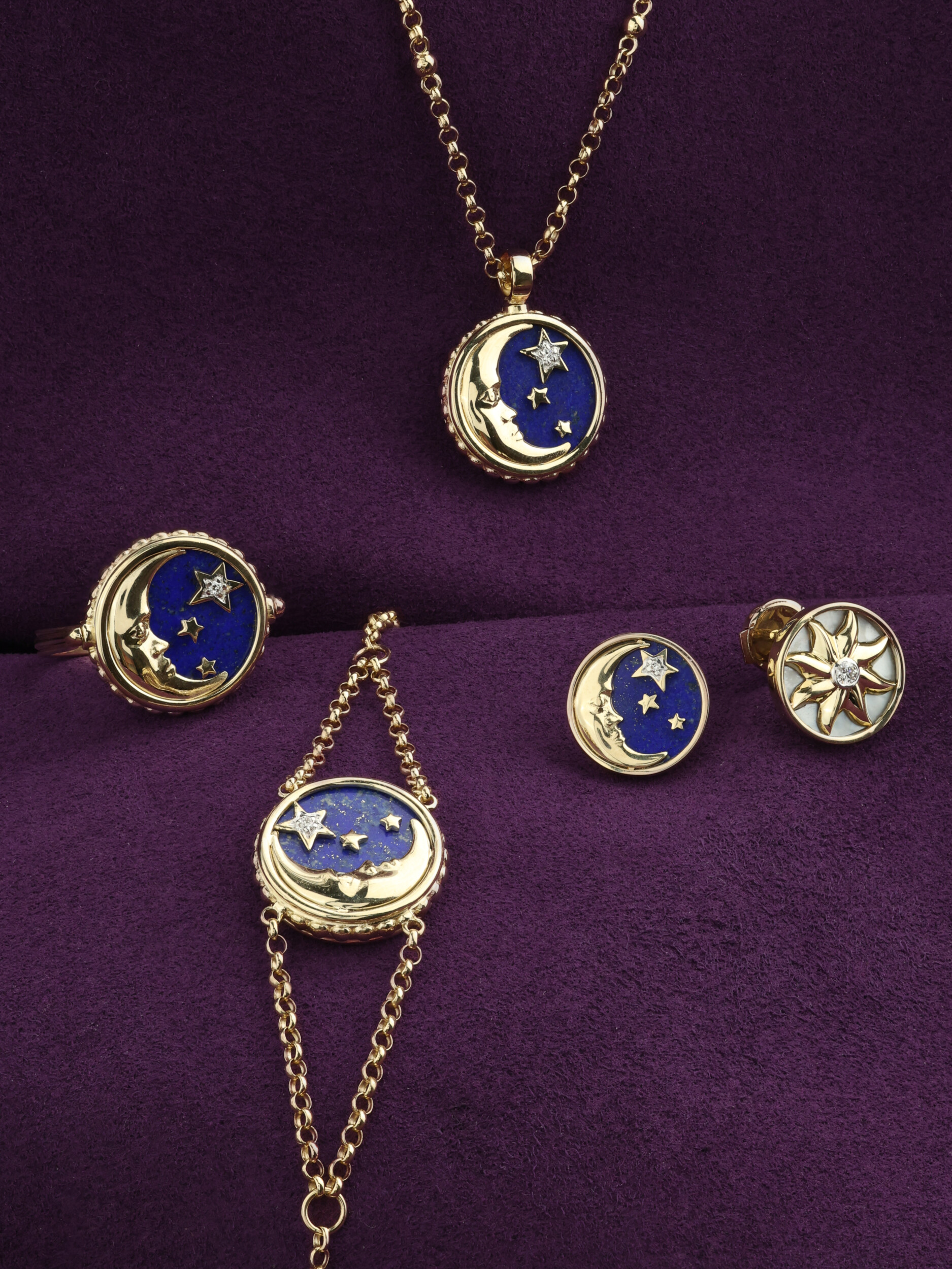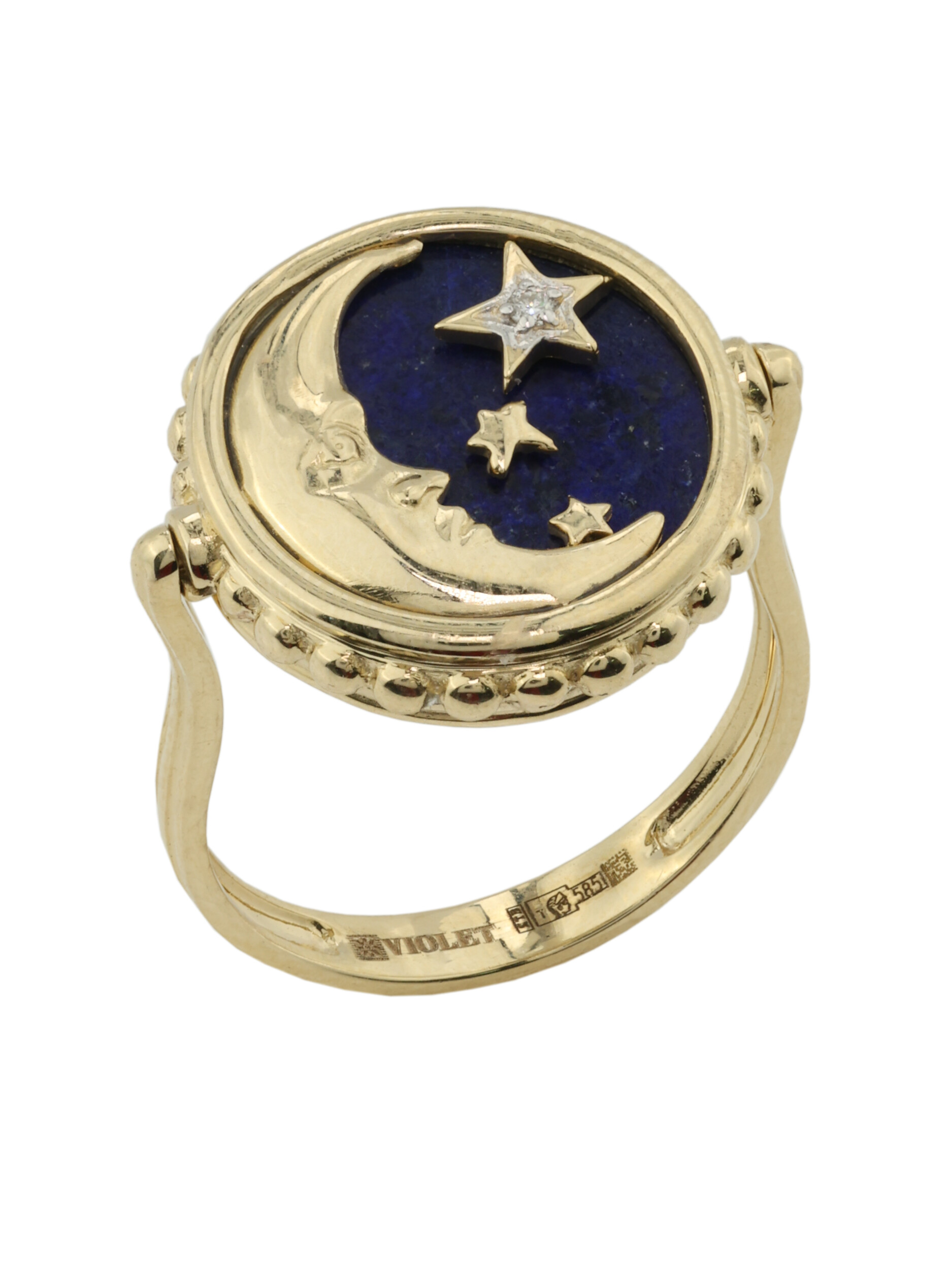 Кольцо из коллекции De Luxe — Солнце и Луна — это ювелирное произведение искусства, которое объединяет небесную эстетику и безупречное исполнение. Украшение выполнено из лимонного золота 585 пробы, чей теплый оттенок идеально подчеркивает глубину вставок. Дизайн изделия вдохновлен мистикой ночного неба: центральную часть занимает контрастное сочетание глубокого синего лазурита и нежного перламутра, дополненное изысканными деталями в виде солнца и луны. Особый шарм кольцу придает наличие трех вставок круглой формы: сияющего белого бриллианта, яркого лазурита и утонченного перламутра.