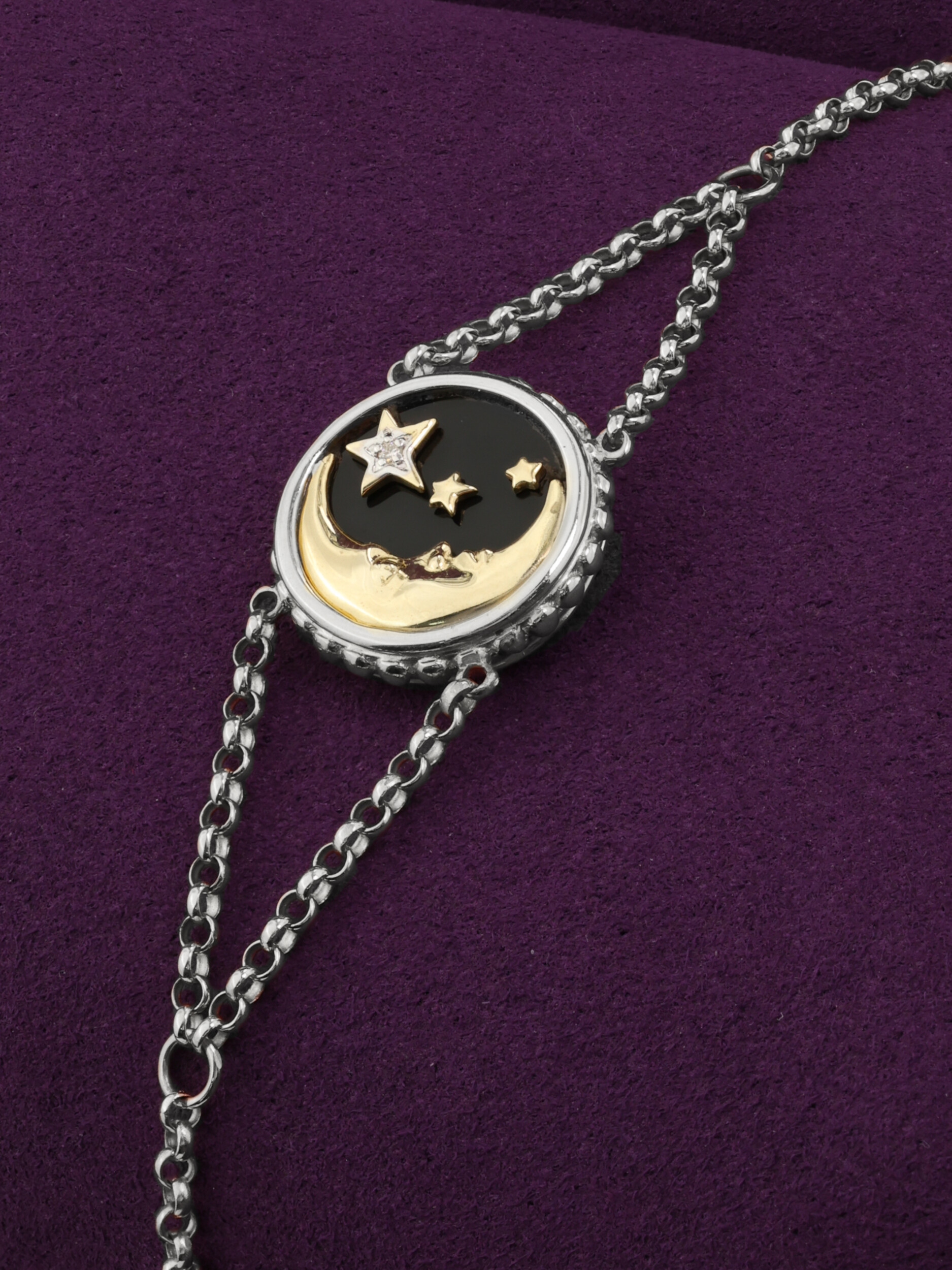 В центре композиции расположены три вставки круглой формы: таинственный черный оникс, нежный перламутр и сверкающий бриллиант, которые создают завораживающую игру света и цвета. Белое золото идеально обрамляет каждый камень, усиливая блеск и сияние. Тонкая, прочная цепочка обеспечивает комфортную посадку на запястье, делая это украшение подходящим как для повседневного ношения, так и для торжественных выходов.