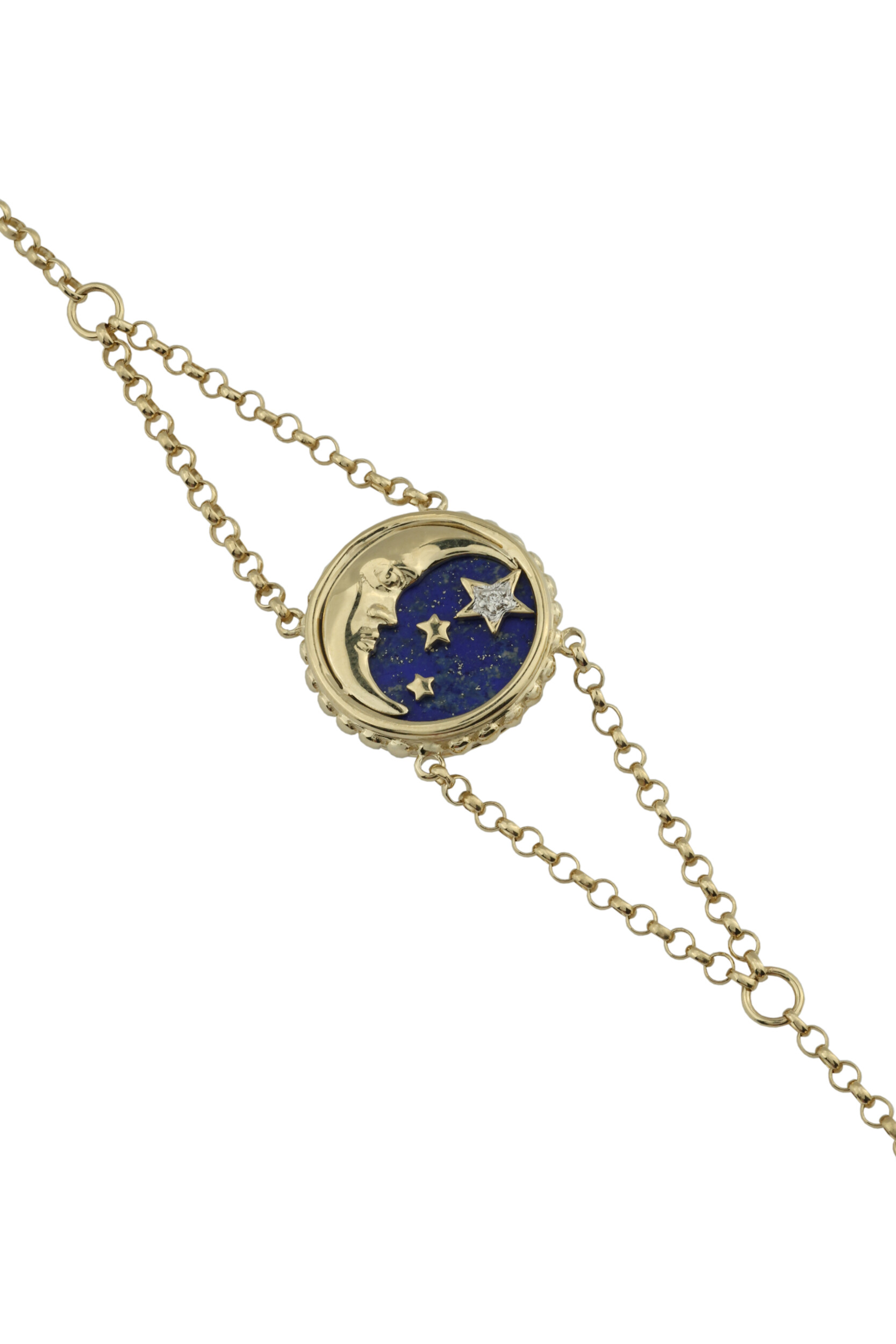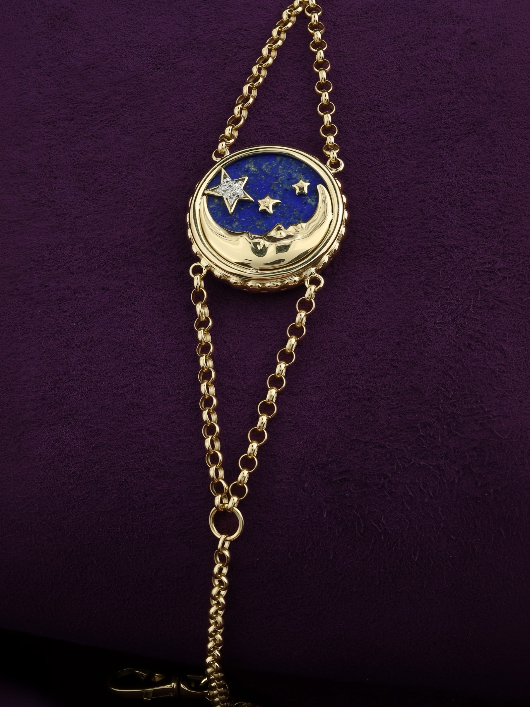 Эффектный браслет из лимонного золота 585 пробы — это украшение, в котором воплотилась магия ночного неба. Центральный элемент изделия выполнен в уникальном дизайне «Солнце/луна», который притягивает взгляд своей детализацией и глубиной. Насыщенный синий цвет лазурита в сочетании с нежным перламутром создает выразительный контраст, подчеркивающий благородный оттенок лимонного золота. Вставки круглой формы в количестве 3 штук гармонично дополнены сияющим бриллиантом, который расставляет яркие акценты на фоне глубокого цвета вставок.
