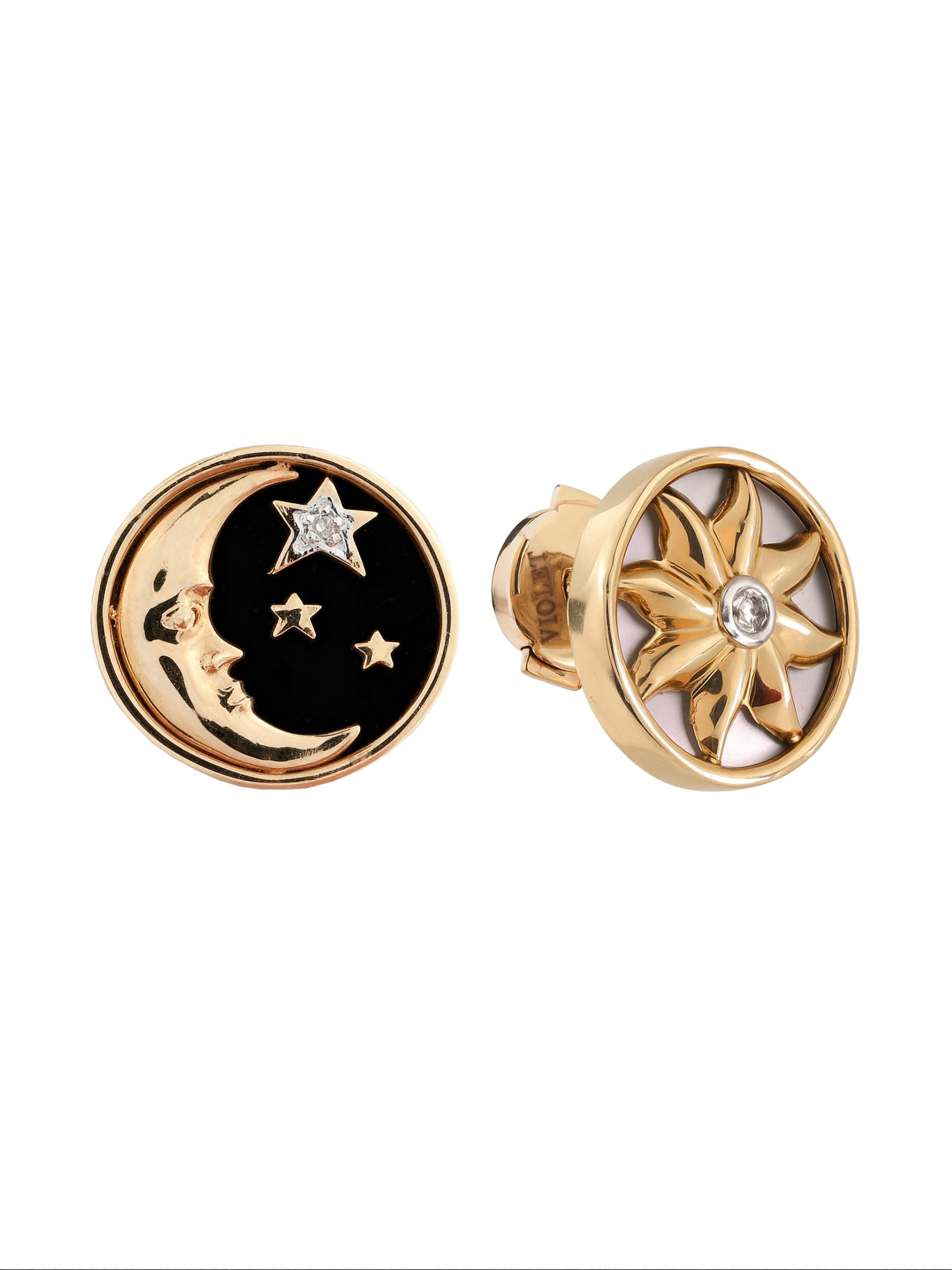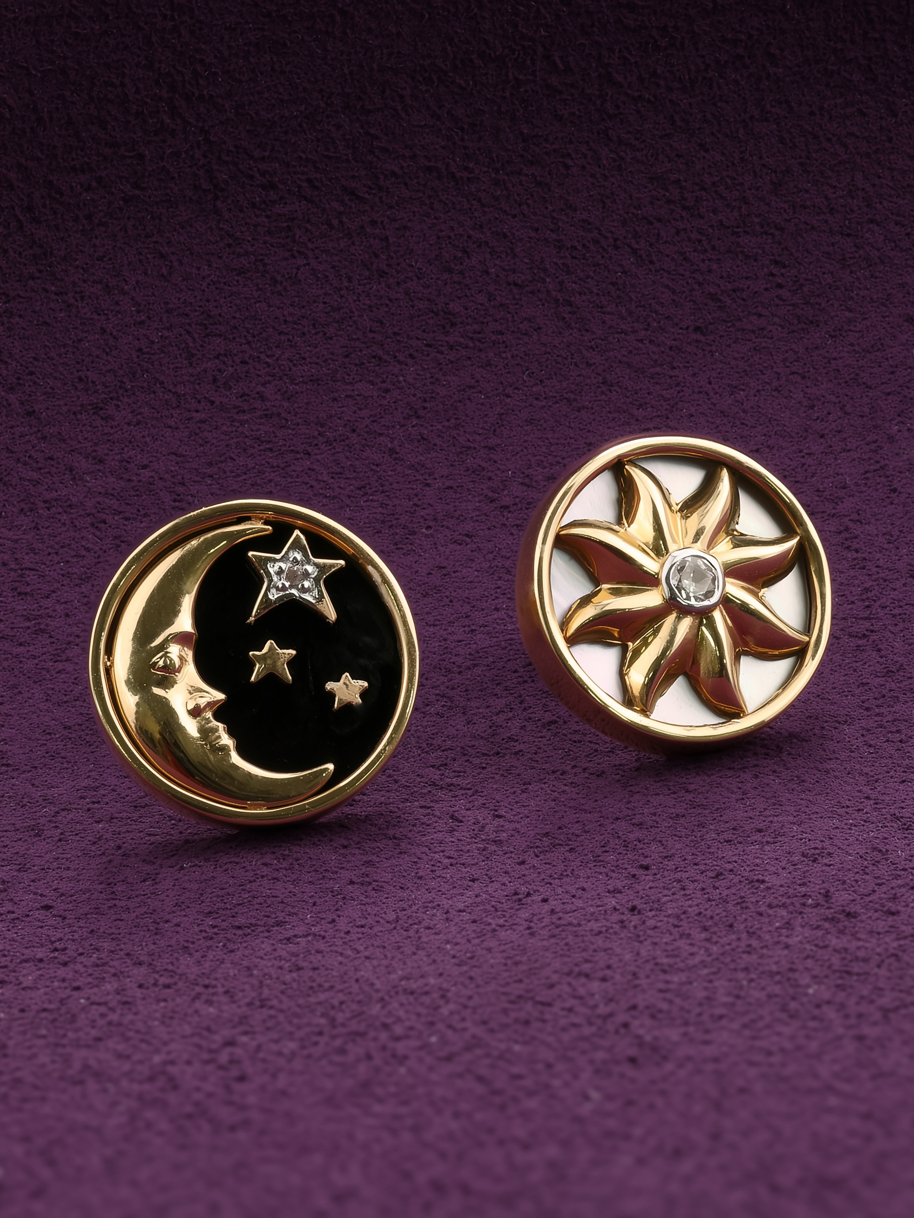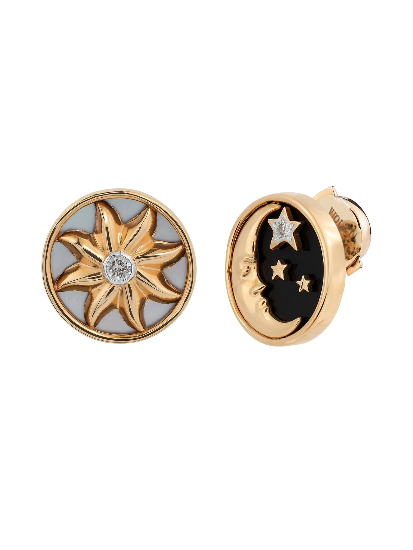 Серьги из коллекции De Luxe — Солнце и Луна представляют собой смелое сочетание классической роскоши и символического дизайна. Это ювелирное изделие, выполненное в стиле Солнце и Луна, притягивает взгляд своей оригинальностью и глубоким смыслом. Основой украшения служит красное золото 585 пробы, которое обеспечивает долговечность и благородный блеск. Дизайн серег строится на контрасте: одна серьга воплощает ночное небо с ониксом черного цвета, украшенным изящным полумесяцем, а другая отражает свет дня с перламутром белого цвета и золотым солнцем.