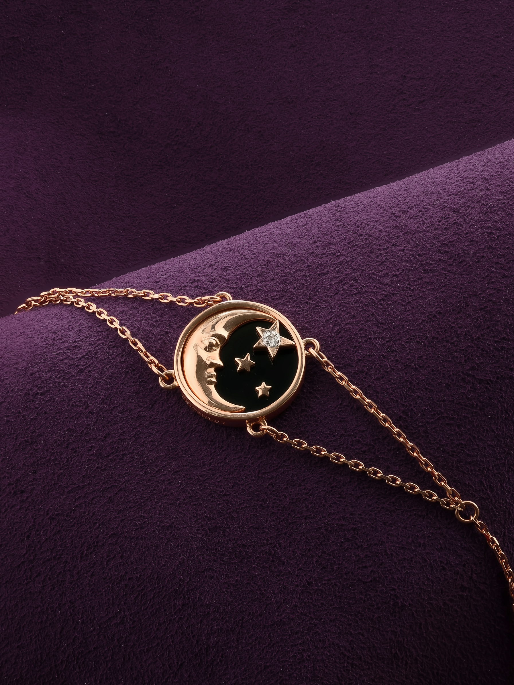 В центре композиции, на фоне глубокого черного оникса, расположен изящный рельеф луны, окруженный звездами. Одна из звезд инкрустирована чистейшим бриллиантом круглой формы, создавая акцент света в этой ночной миниатюре. Всего в изделии использовано 2 вставки, которые гармонично дополняют друг друга. Утонченная цепочка обеспечивает комфортную посадку и подчеркивает хрупкость запястья.