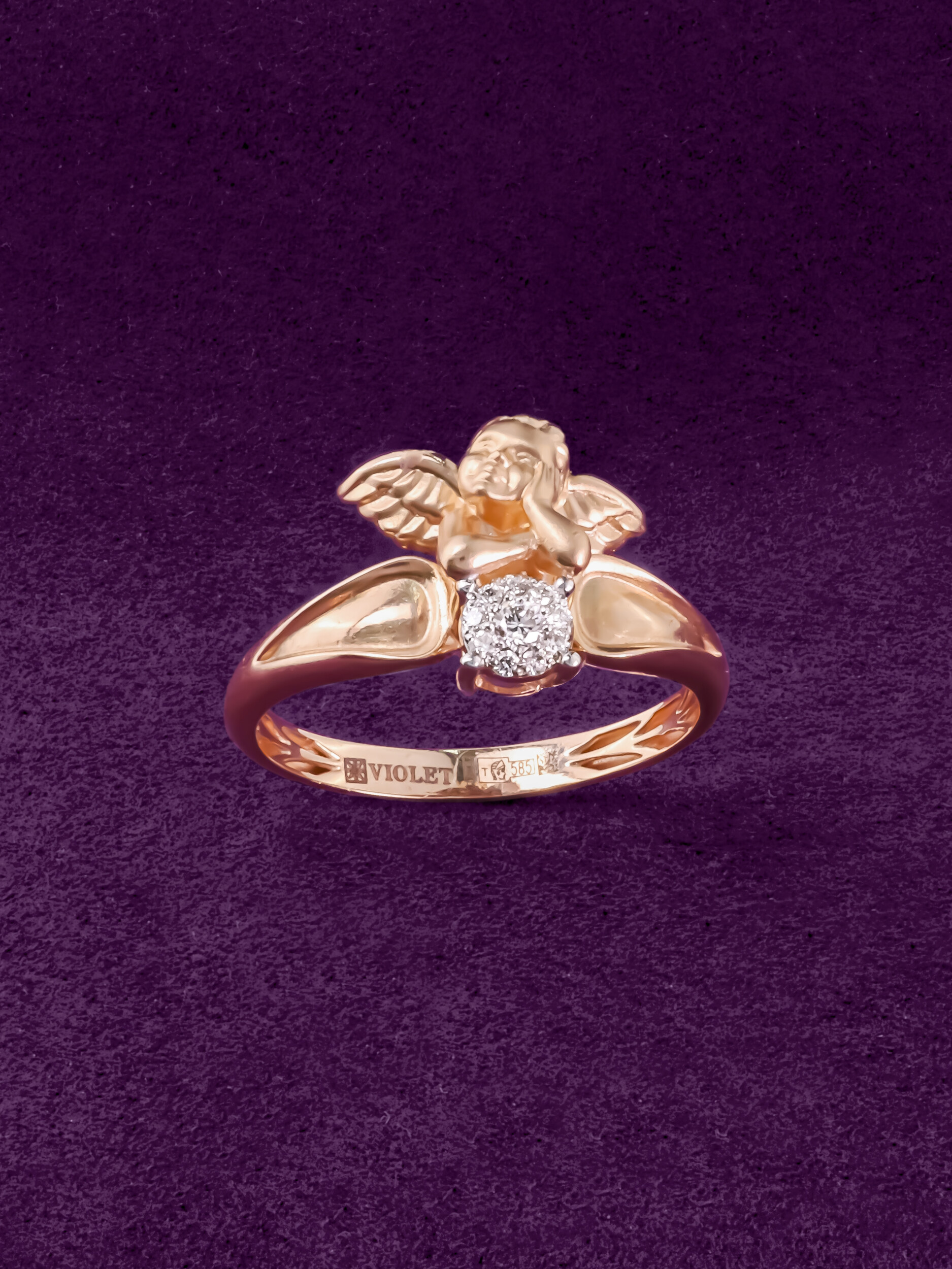 Изысканное кольцо из красного золота 585 пробы станет утонченным дополнением вашего образа или значимым подарком для близкого человека. Украшение из коллекции De Luxe — Купидоны отличается оригинальным дизайнерским решением: центральным элементом изделия является искусная фигурка купидона, символизирующая любовь и нежность. Гармоничный дуэт драгоценному металлу составляет композиция из 10 белых бриллиантов круглой формы, которые эффектно играют гранями, придавая кольцу особенное сияние.