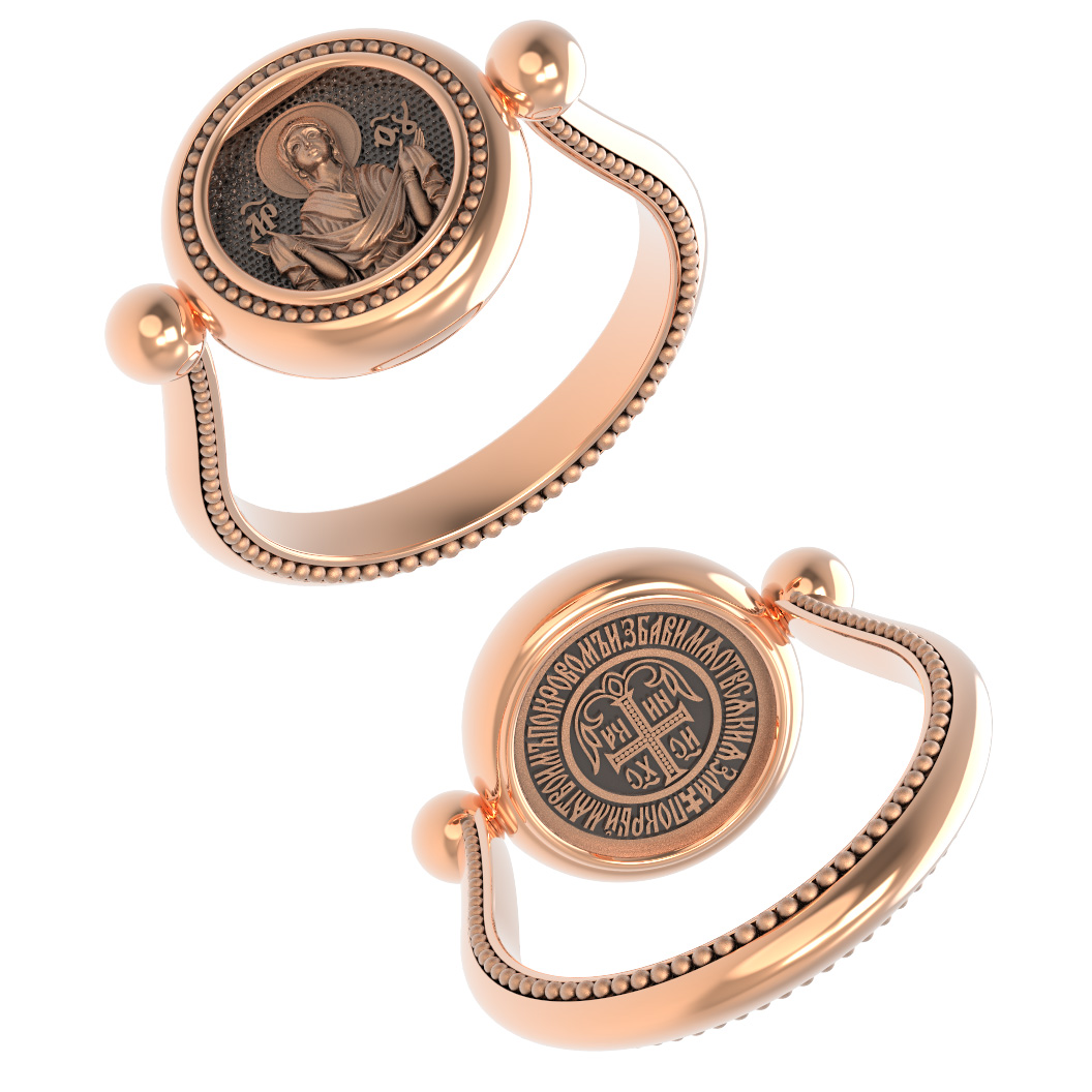 На перстне изображена икона Покров Пресвятой Богородицы. Праздник Покрова Божией Матери является воспоминанием чуда, которое произошло во Влахнернской церкви 1 (14) октября 910 года: Пресвятая Богородица явилась верующим над алтарем храма и распростерла над ними Свое покрывало. В этот день Божья Матерь открыла людям, что Она является Ходатаицей за них перед Богом. Богородица простирает Свой молитвенный покров над всеми православными христианами и умоляет Сына Своего о даровании вечного спасения каждому человеку.