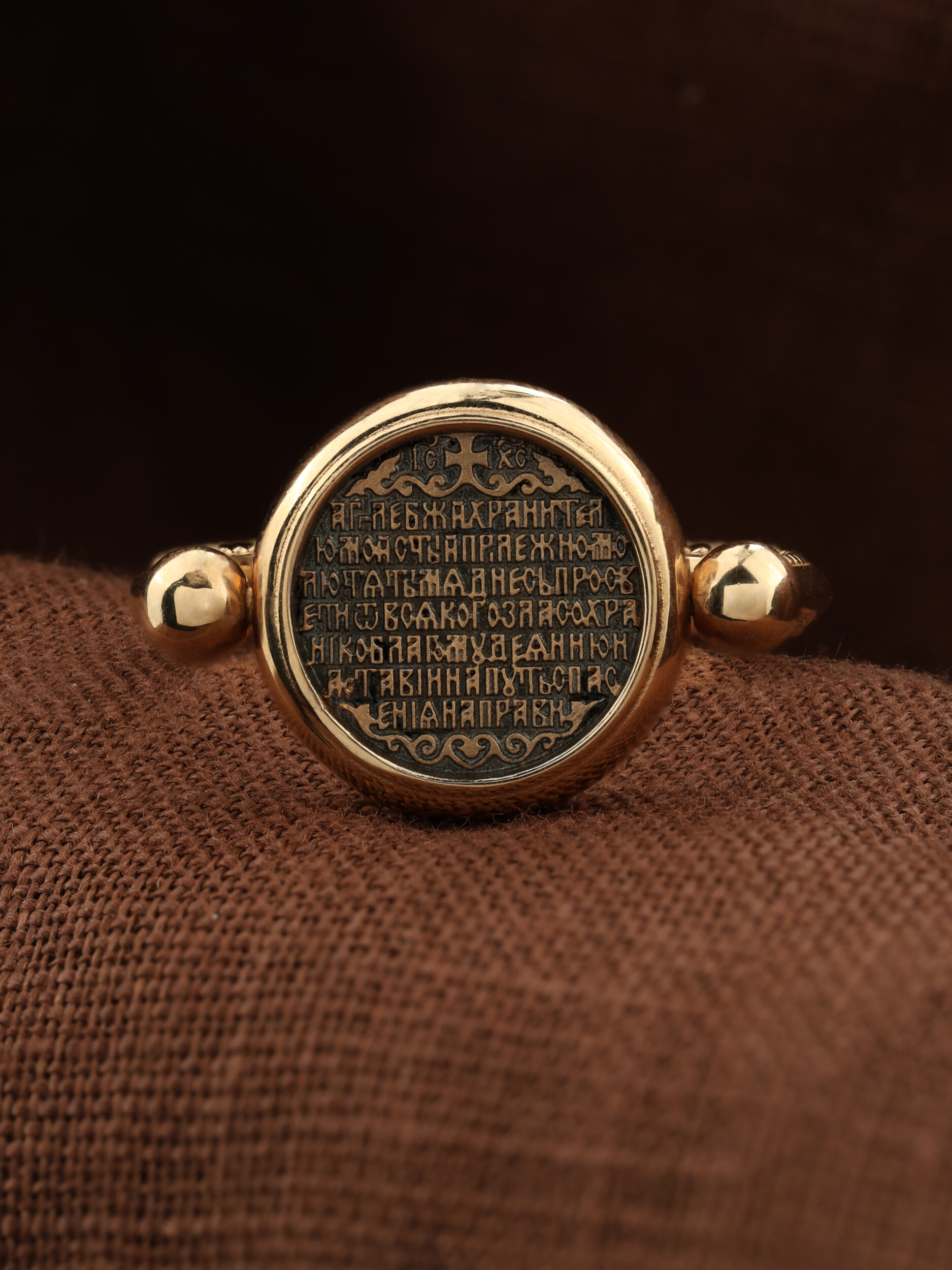 С внутренней стороны кольца выгравирована молитва» О, всесвятый, великий Михаиле Архистратиже. Не презри нас, грешных, молящихся тебе о помощи и заступлении твоем в веце сем и будущем».