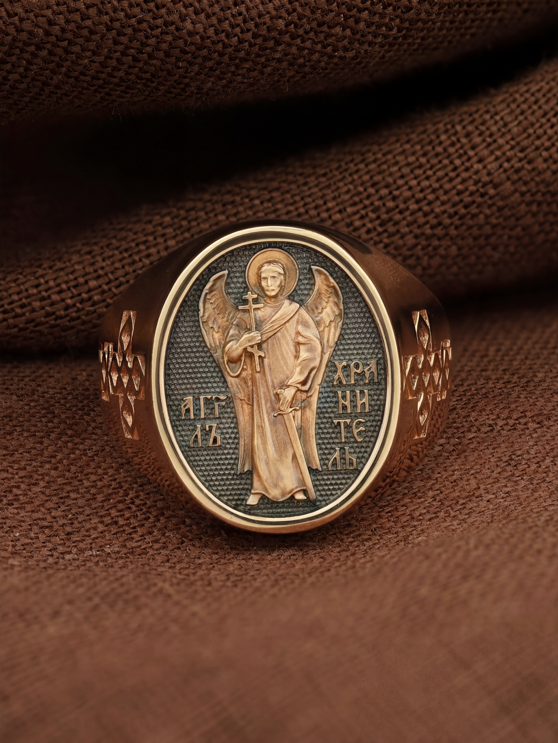 Кольцо «Святой Ангел-Хранитель " выполнено в древних христианских традициях. Ангел-Хранитель — это Ангел приставляемый Богом к человеку при крещении для охраны и помощи в добрых делах. Он невидимо находится при человеке на протяжении всей его жизни, если человек сохраняет в себе любовь к Богу и истинную веру перед Ним. Ангел-Xранитель делают для нас все, что служит к истинному нашему благу и спасению. Невидимо пребывая при нас постоянно, он, руководствуя нас ко спасению, не только по нашему желанию таинственно наставляет нас на все доброе и полезное, не только возносит наши молитвы к Богу, но еще и сам от себя охраняют и защищают нас от врагов видимых и невидимых и ходатайствует за нас пред Богом. Ангел-Хранитель так любит нас, как никто на земле любить не может. Ангел-Хранитель — присный друг наш, незримый тихий собеседник, пресладостный утешитель. Одного лишь каждому из нас он желает — спасения души; к этому он направляет все свои заботы. И если видит нас также заботящимися о спасении, радуется, если же видит нас пребывающими в нерадении о душе своей, скорбит.