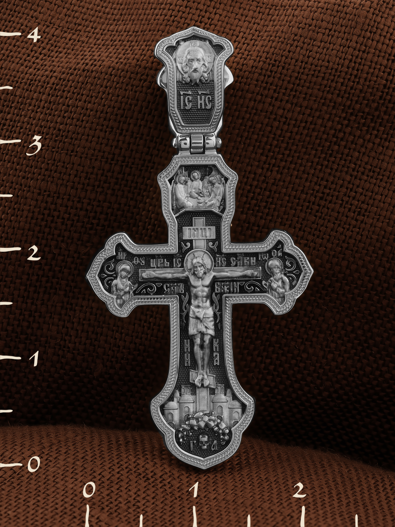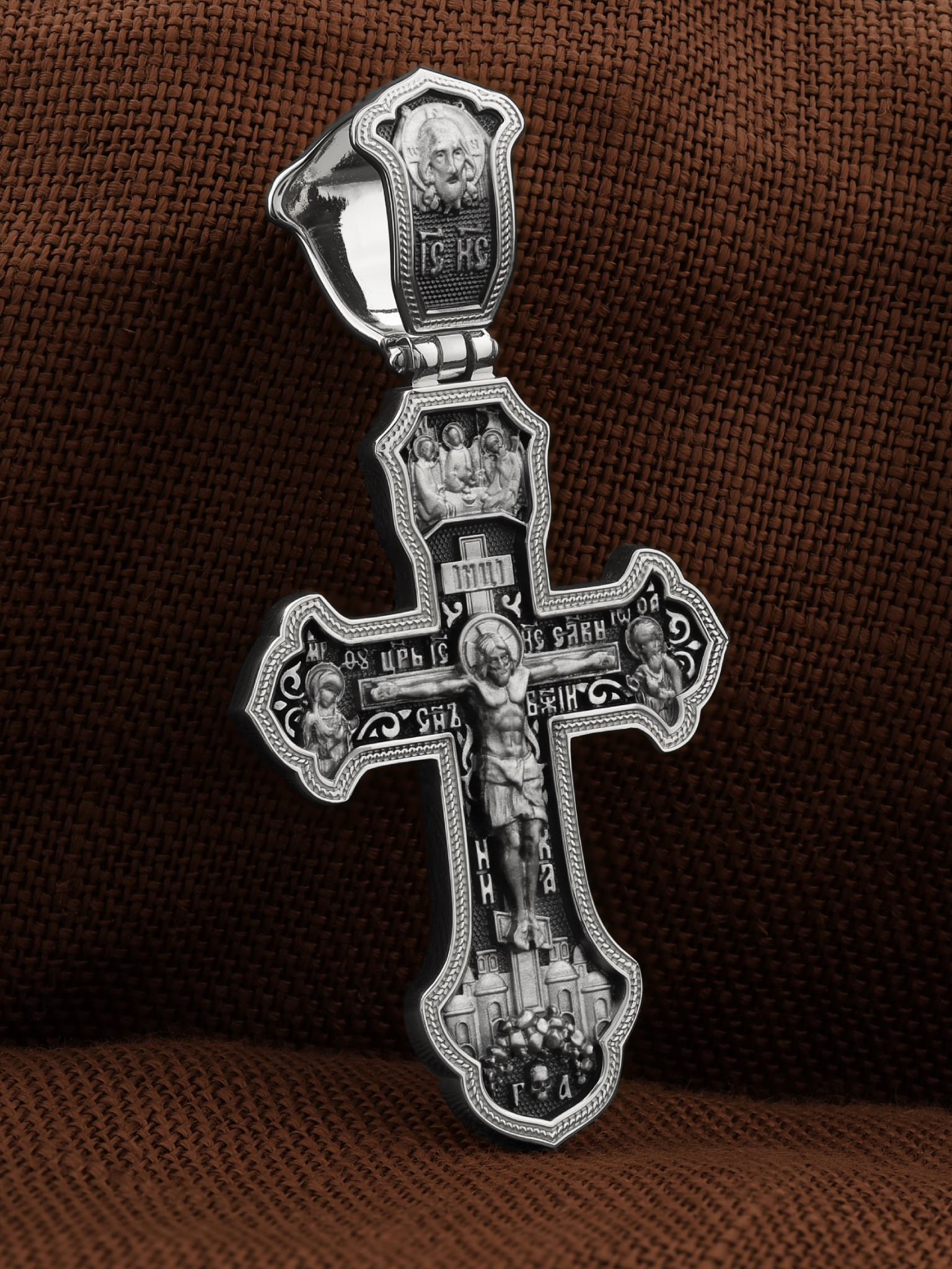 На лицевой стороне креста изображено Распятие Господа и Спасителя нашего Иисуса Христа, отдавшего Себя на смерть, для искупления грехов мира. Крест является символом жертвенной любви Всеблагого Бога к падшим людям, всепобеждающим духовным оружием христиан, основанием и средоточием церковной жизни. Господь сказал: кто хочет идти за Мною, отвергнись себя, и возьми крест свой, и следуй за Мною. (Мк. 8: 34). Над распятием помещена икона Святой Троицы, написанная преподобным Андреем Рублёвым в XV веке. На иконе изображены три ангела, являющихся образом Единосущного и Триипостасного Бога — Святой Троицы. На кулонном кольце изображен Нерукотворный образ Господа и Спасителя нашего Иисуса Христа. На верхней табличке, выше головы Иисуса, расположена надпись, составленная Понтием Пилатом — «IНЦI». Она означает «Иисус Назорей, Царь Иудейский». Надпись «IC» «ХC», означает Иисус Христос, помещается на разных сторонах поперечной перекладины креста. Рядом — слово «НИКА», что означает «победитель» и надпись «Царь Славы». Слева от Распятия изображена Пресвятая Богородица, справа — Про-рок Предтеча и Креститель Господень Иоанн. Ниже расположена надпись «Сын Божий». За крестом высится Иерусалимская стена, в знак того, что Господь был распят вне стен города. Крест стоит на горе камней, символизирующих Голгофу. В ее основании различается череп– это голова Адама.