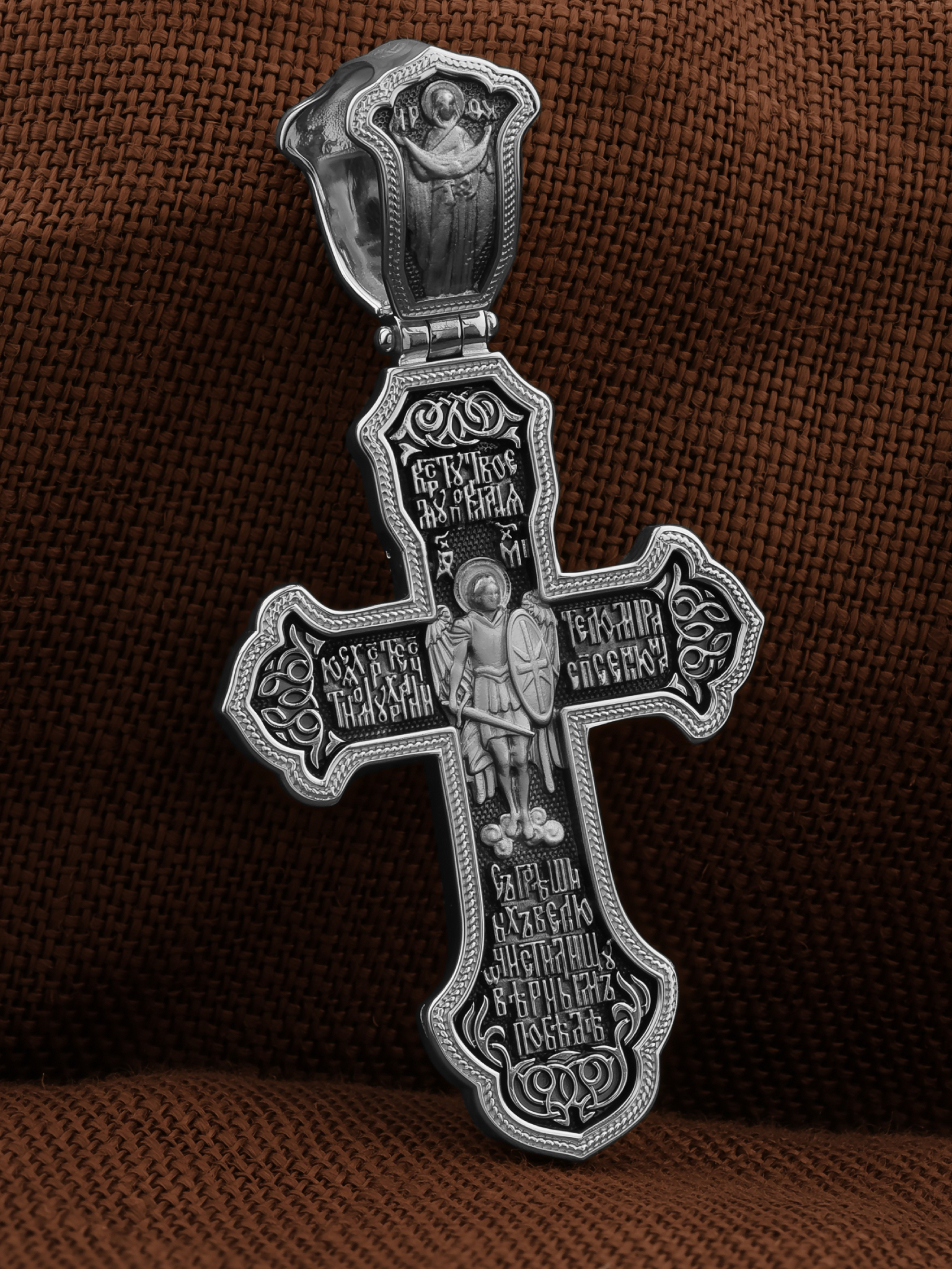 В центре оборотной стороне креста помещен образ Архангела Михаила — верного служителя Божия, который низринул с Неба возгордившегося денницу с другими павшими духами. Он изображен в воинственном виде с огненным мечом в правой руке и щитом в левой. В Православии его называют Архистратигом, что означает глава святого воинства Ангелов и Архангелов. Вокруг образа размещена молитва: «Кресту твоему поклоняемся, Христе, честному хранителю мира, спасения нас грешных, велию очистилищу, верным победе». На кулонной кольце изображена икона Божией Матери «Покров Пресвятой Богородицы». Праздник Покрова Пресвятой Богородицы пришел на Русь в XII веке из Византии и стал одним из самых почитаемых. Богородица простирает Свой молитвенный покров над всеми православными христианами и умоляет Сына своего о даровании вечного спасения каждому человеку.