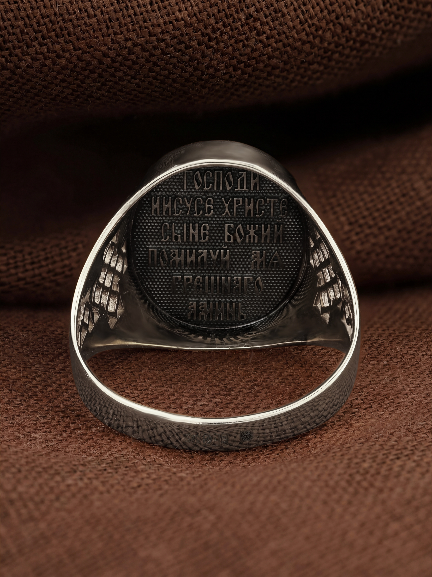 С внутренней стороны кольца выгравирована молитва: «Господи, Иисусе Христе, Сыне Божий, помилуй меня грешнаго.»