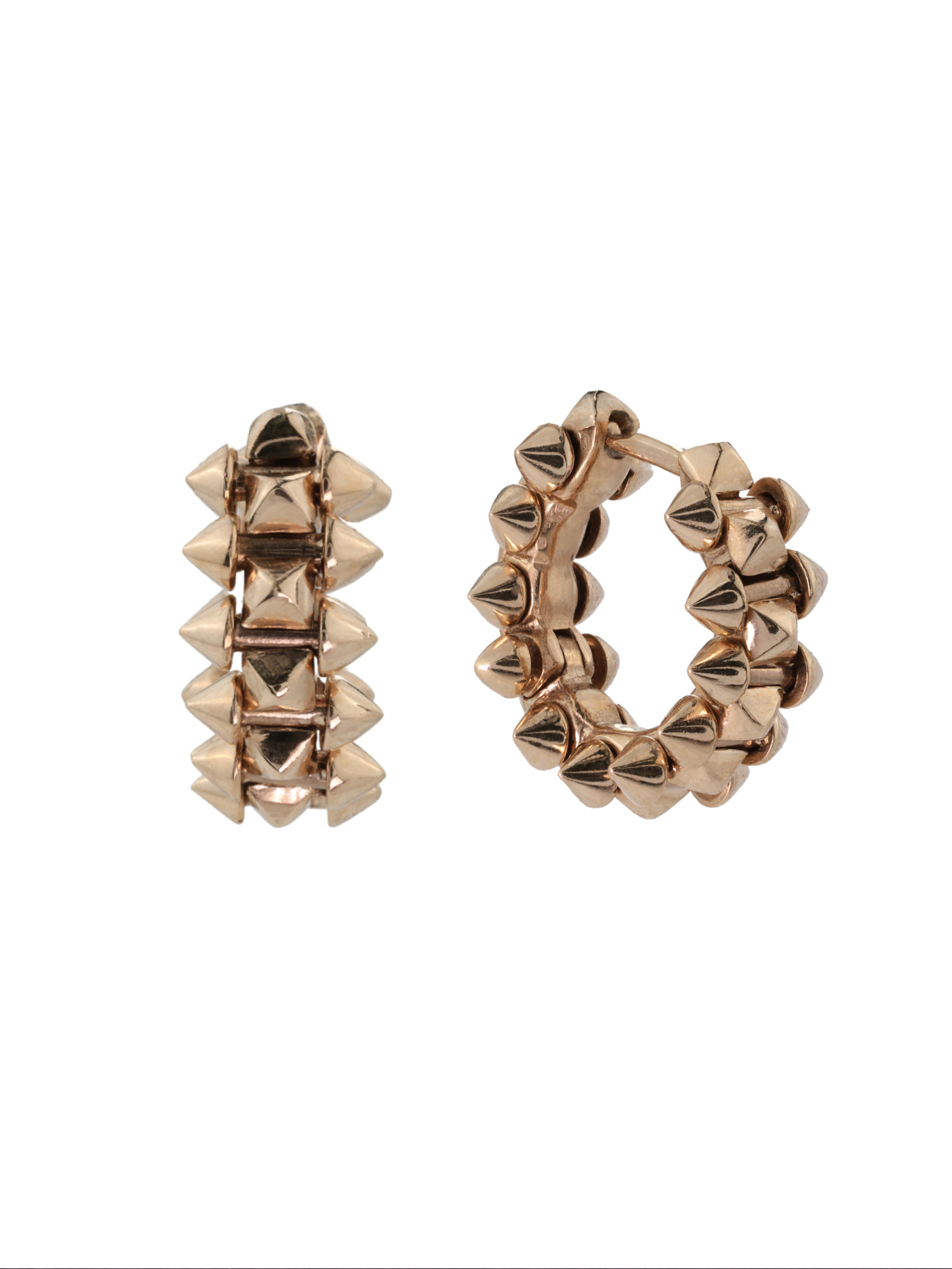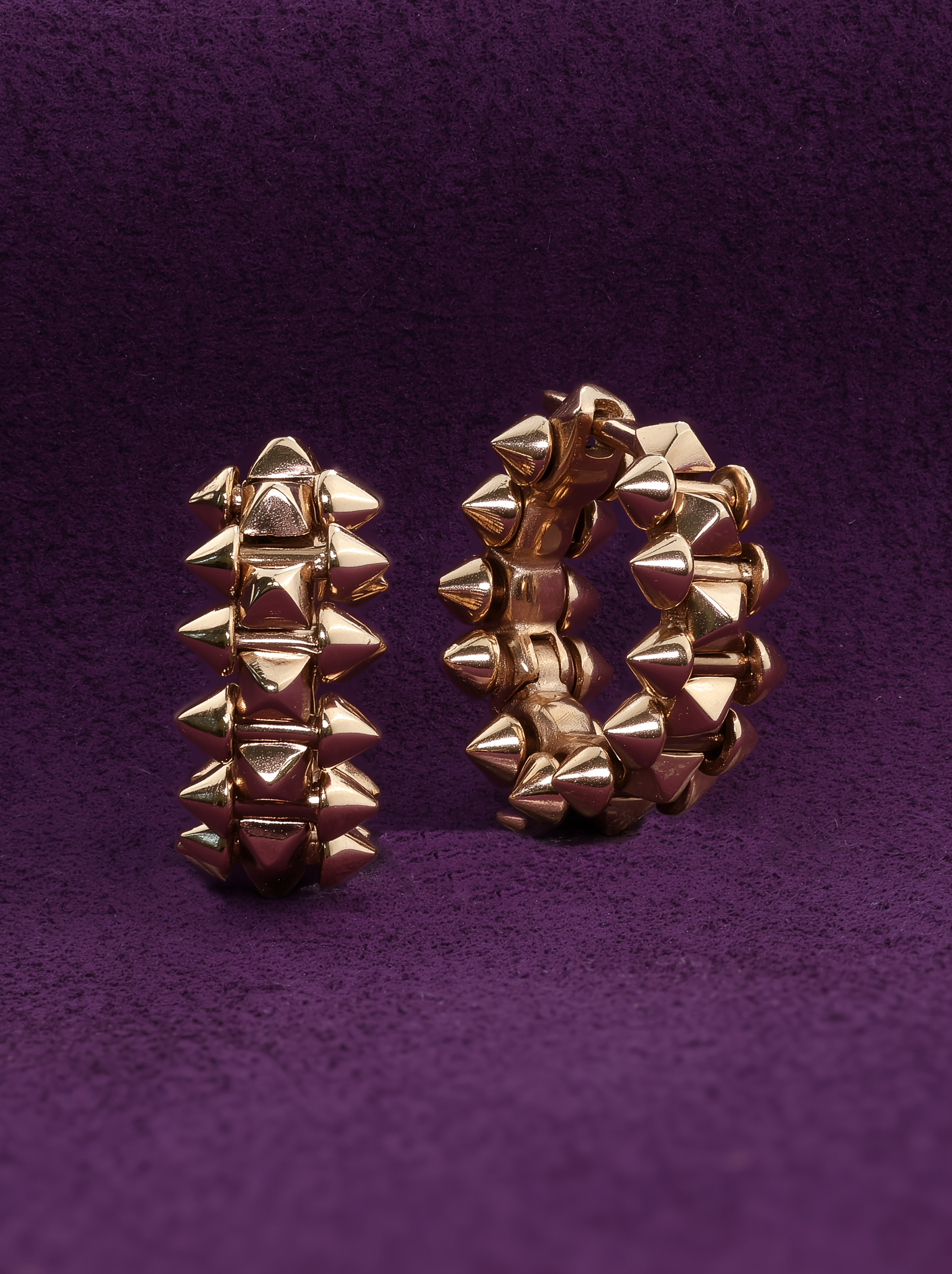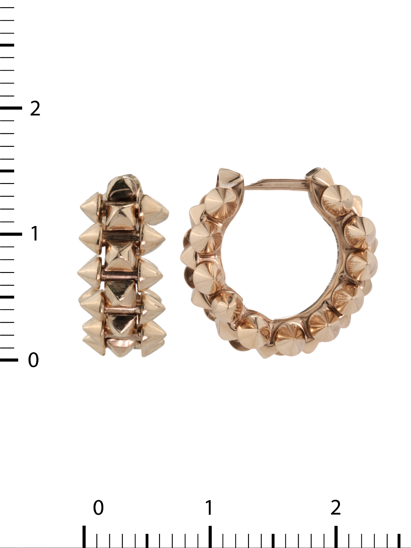 Изделие выполнено из красного золота 585 пробы, что обеспечивает не только благородный блеск, но и долговечность украшения. Теплый красный цвет материала гармонично сочетается с геометрически выверенной формой шипов, придавая серьгам современный и статусный вид. Это универсальный выбор, ведь такие серьги одинаково органично смотрятся как на женщинах, так и на мужчинах, подчеркивая уверенность и стиль.
