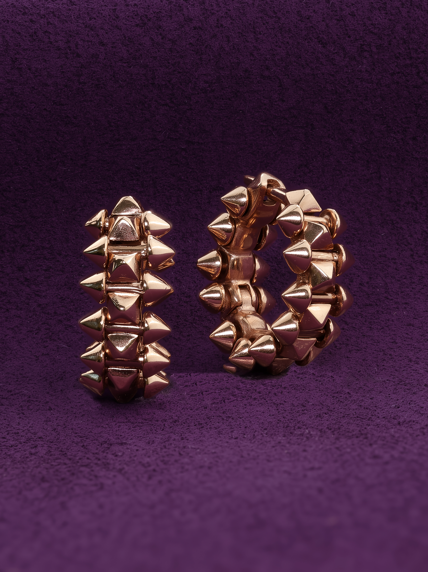 Модель выполнена из благородного розового золота 585 пробы. Мягкий, теплый оттенок материала придает изделию утонченность, которая гармонично контрастирует с агрессивной геометрией дизайна. Благодаря продуманной форме и универсальному визуальному решению, эти серьги подходят как для женщин, так и для мужчин, становясь ярким акцентом в любом образе. Они идеально смотрятся как самостоятельный аксессуар, так и в сочетании с другими украшениями из этой серии.