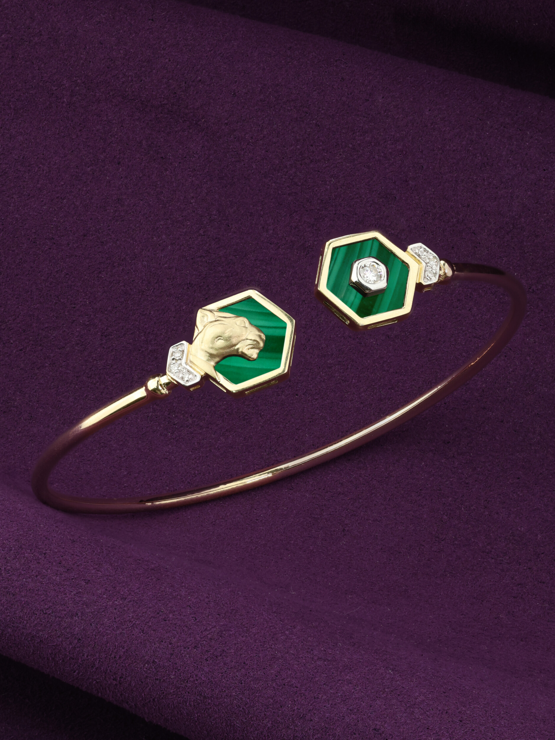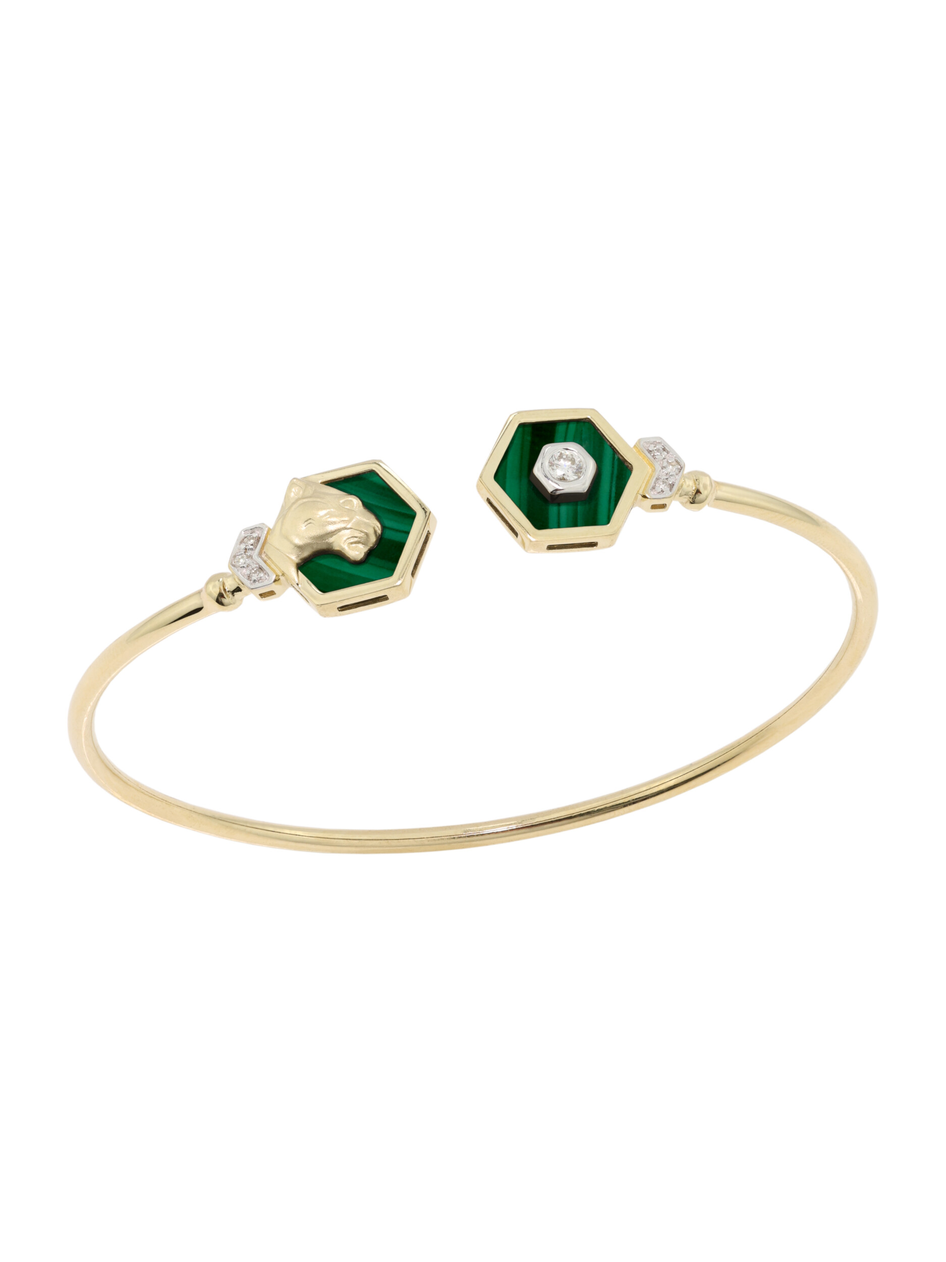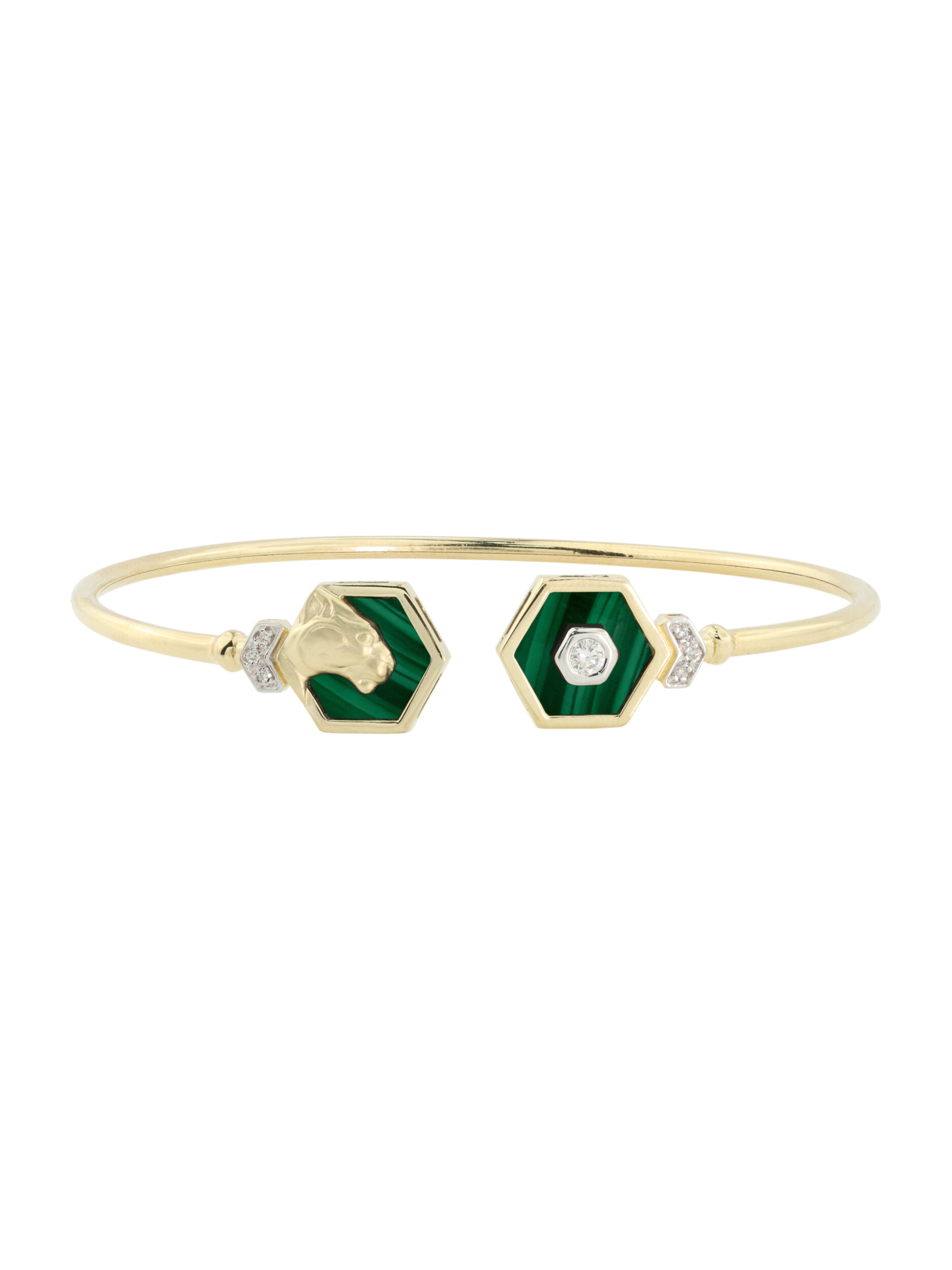 Центральными элементами композиции выступают девять вставок, выполненных в двух формах: строгие шестигранники и сияющие круги. Насыщенный зеленый цвет малахита великолепно сочетается с благородным лимонным оттенком золота, а чистые белые бриллианты добавляют браслету ослепительного блеска. Контрастное сочетание цветов и геометрических форм делает этот аксессуар поистине уникальным.