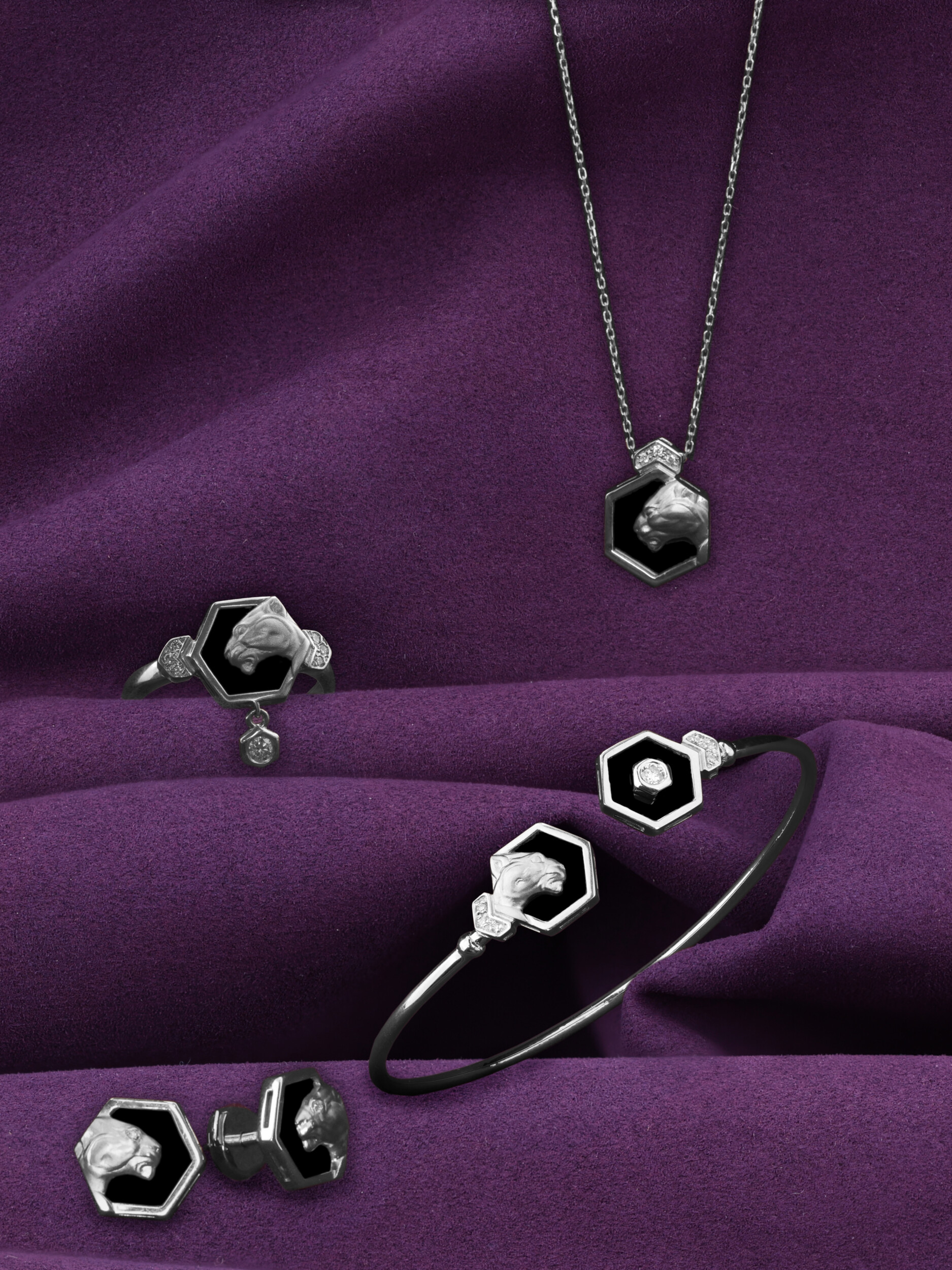 Элегантное колье из белого золота 585 пробы из коллекции De Luxe — Гексагон станет безупречным акцентом в вашем образе. Дизайн украшения воплощает грацию и силу: центральным элементом выступает выразительный силуэт пантеры, выполненный с ювелирной точностью. Геометрическая форма подвески-шестигранника придает изделию современный и динамичный вид, сочетая в себе строгость линий и роскошь материалов.