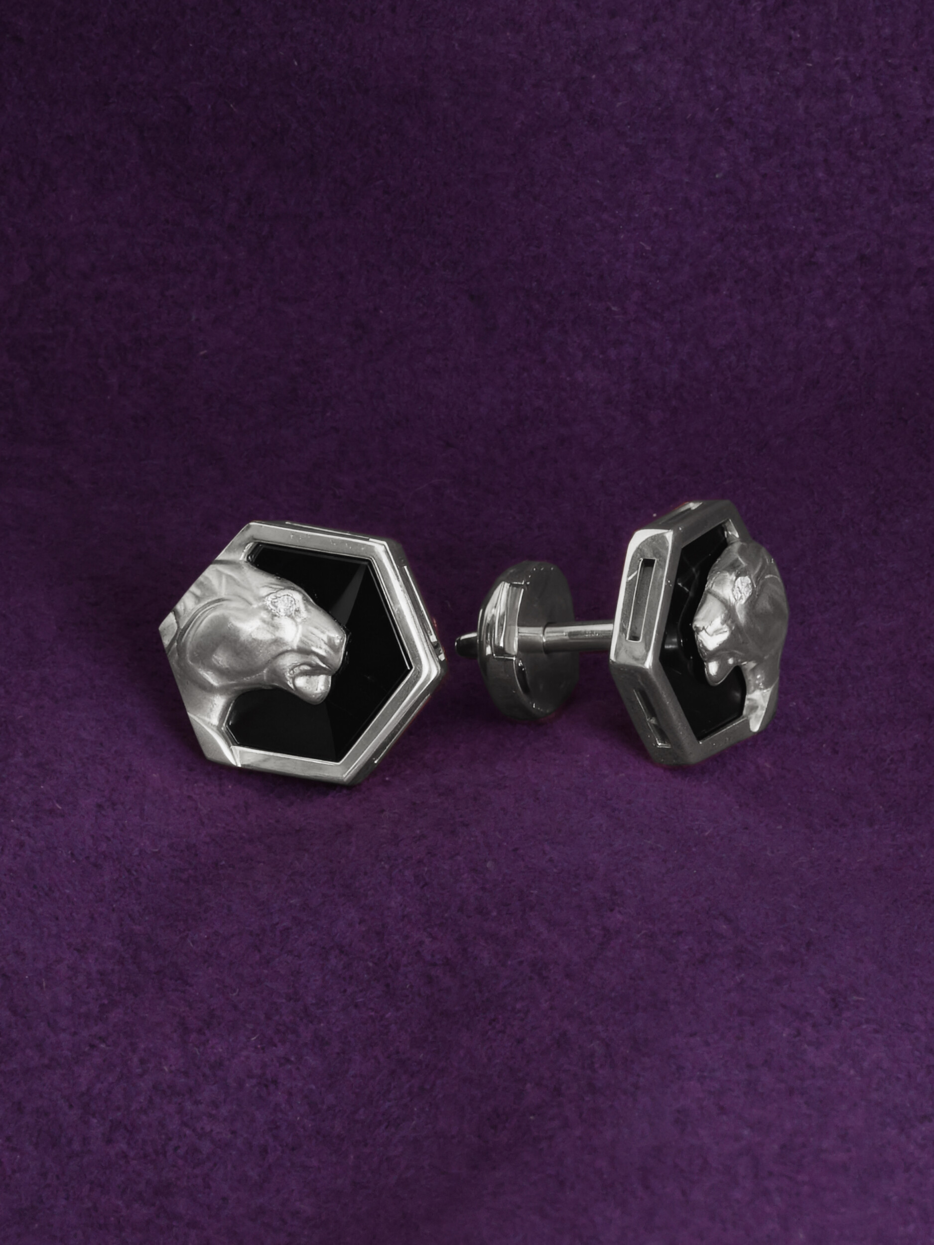 Основа изделия выполнена из благородного белого золота, создающего холодный и глубокий блеск, который подчеркивает контраст вставок. В центре композиции расположен черный оникс шестигранной формы, служащий идеальным фоном для объемного изображения пумы. Взгляд хищника акцентирован искристой чистотой круглого бриллианта, что добавляет изделию премиальности. Всего в модели использованы 4 вставки, создающие завершенный и выразительный облик.