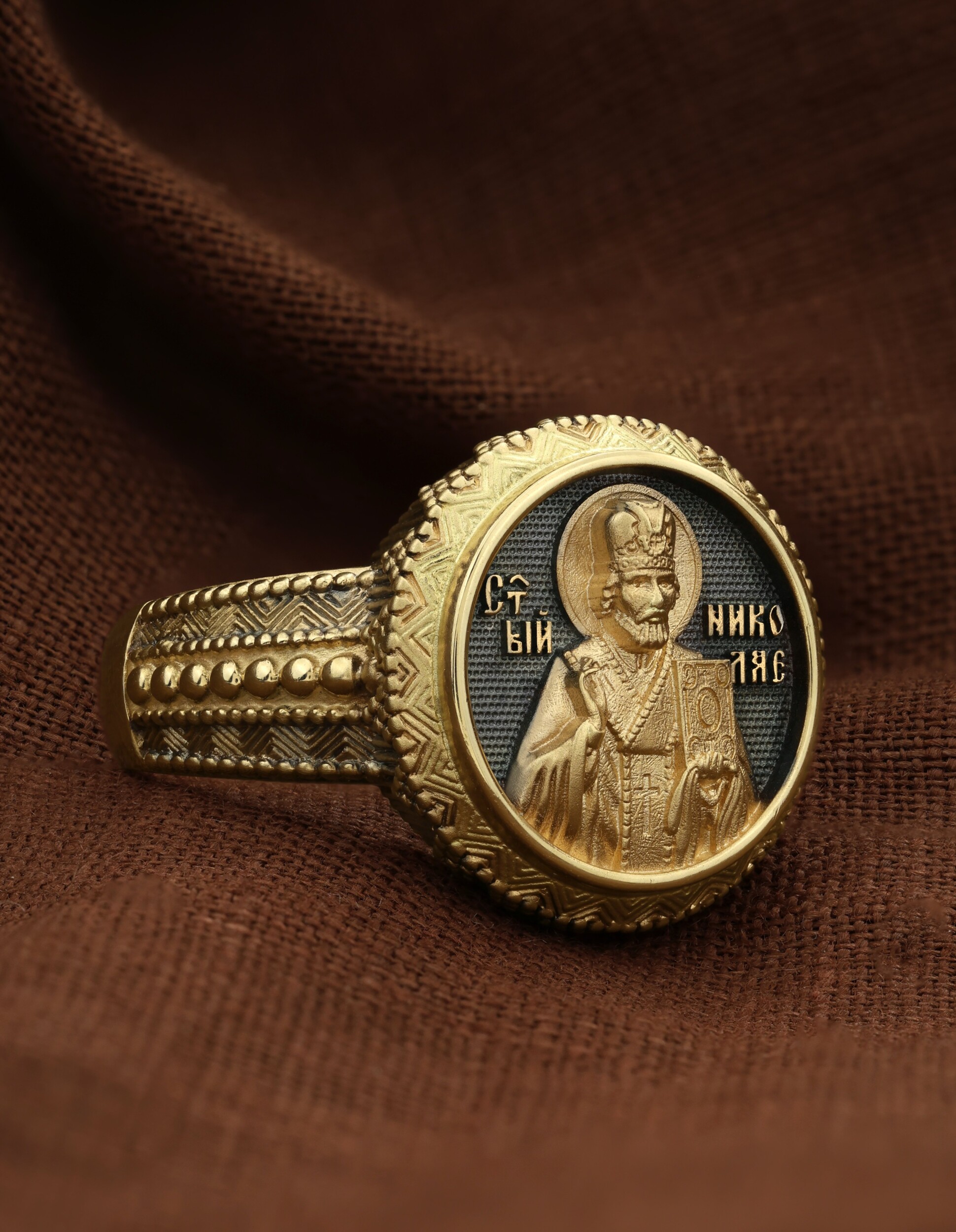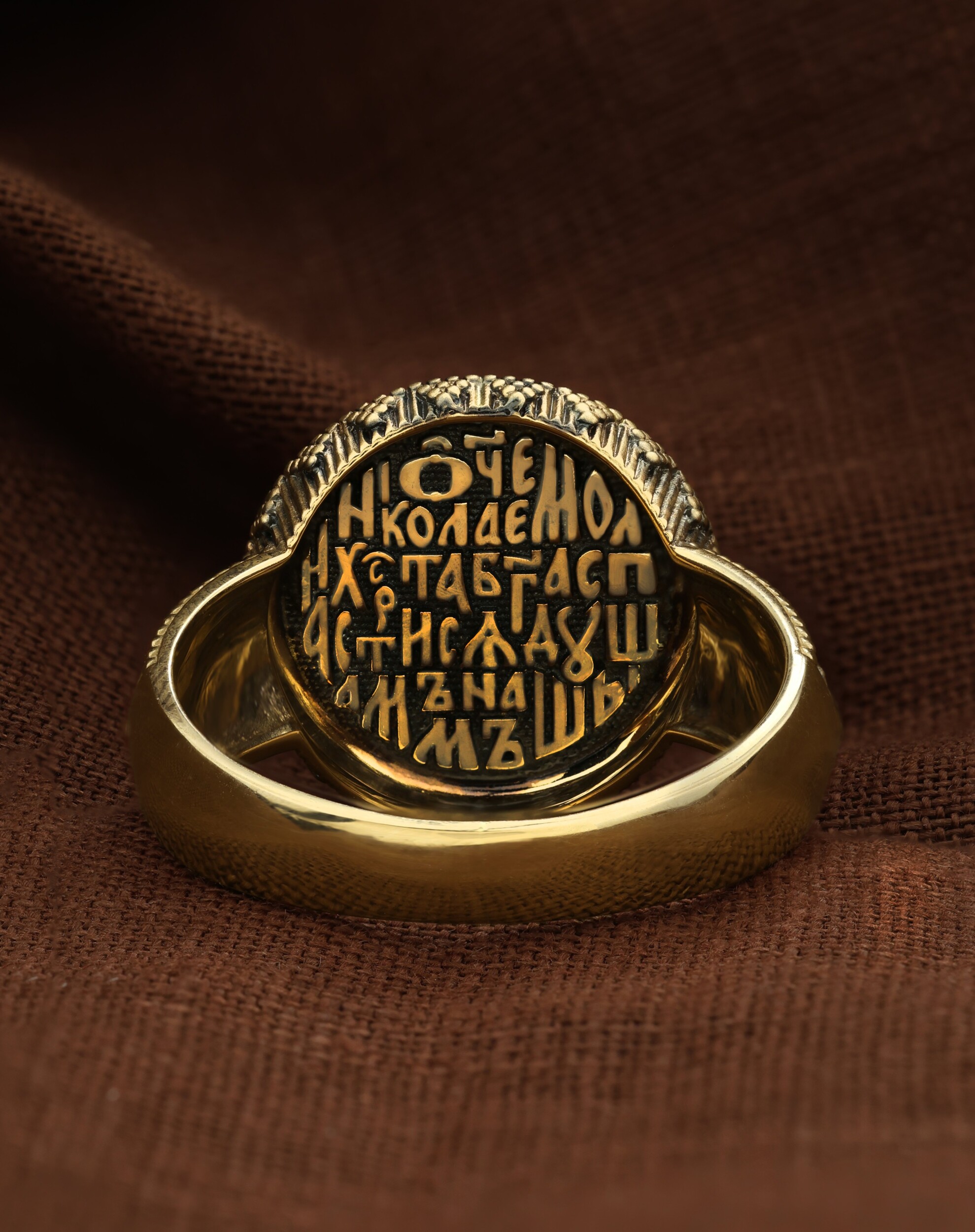С внутренней стороны кольца выгравирована молитва: «Отче Николае, моли Христа Бога спастися душам нашим».