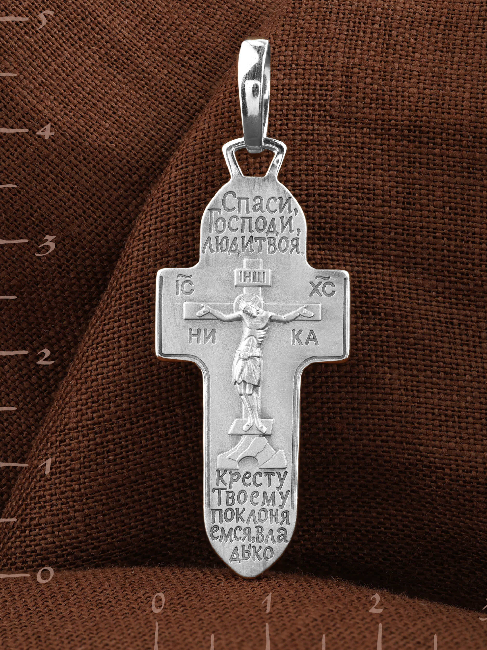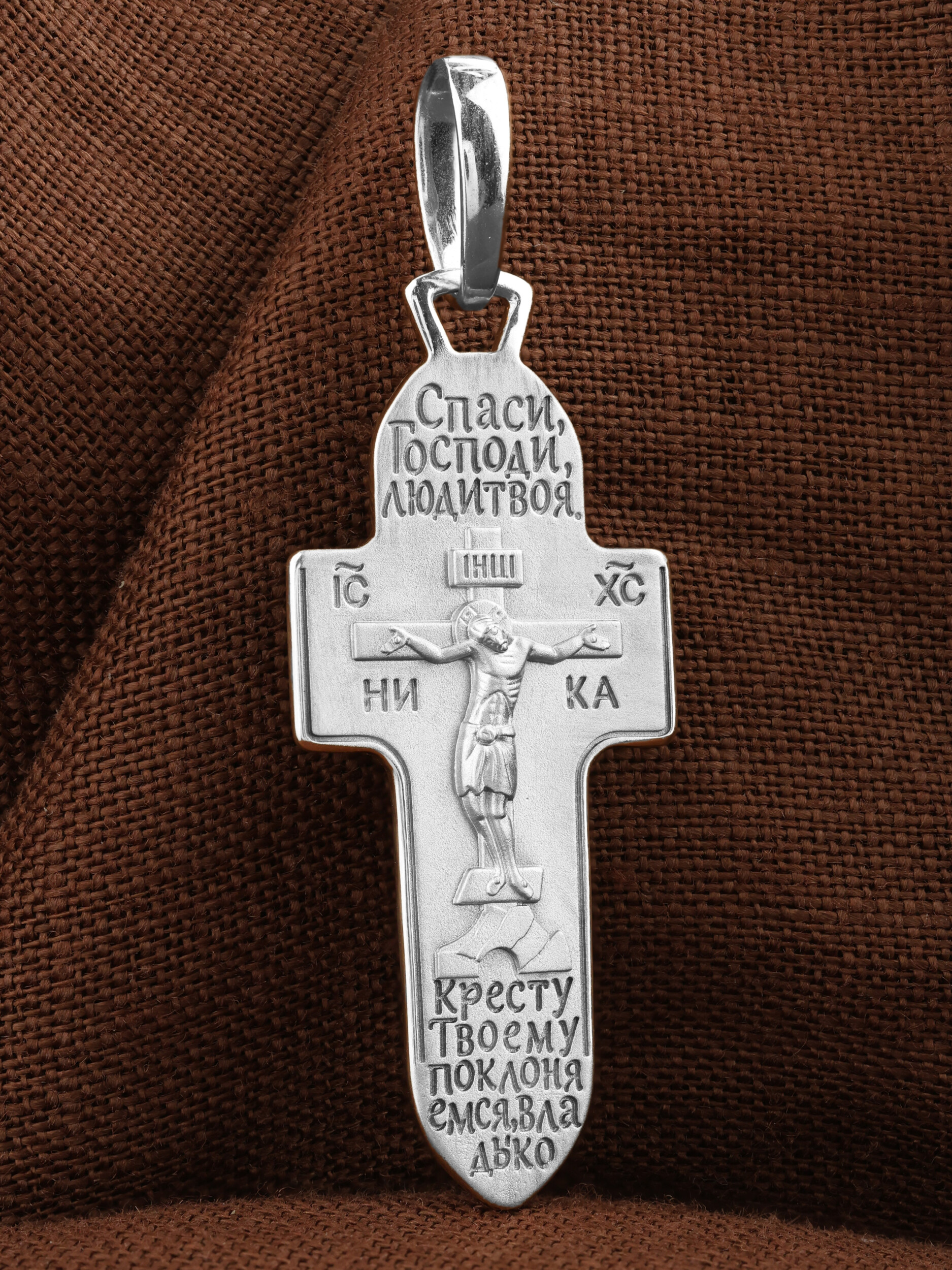 На лицевой стороне креста изображено Распятие Господа и Спасителя нашего Иисуса Христа. Крест- символ спасения и искупления рода человеческого, знамение победы над смертью и адом. Иисус Христос, как искупительная жертва освобождения человечества от власти греха, умер крестной смертью и в третий день воскрес. На верхней табличке, выше головы Иисуса, расположена надпись, составленная Понтием Пилатом — «IНЦI». Она означает «Иисус Назорей, Царь Иудейский». Надпись «IC» «ХC», означает Иисус Христос, помещается на разных сторонах поперечной перекладины креста. Под ней помещено слово «НIКА», что означает Победитель. Крест стоит на горе камней, символизирующих Голгофу.