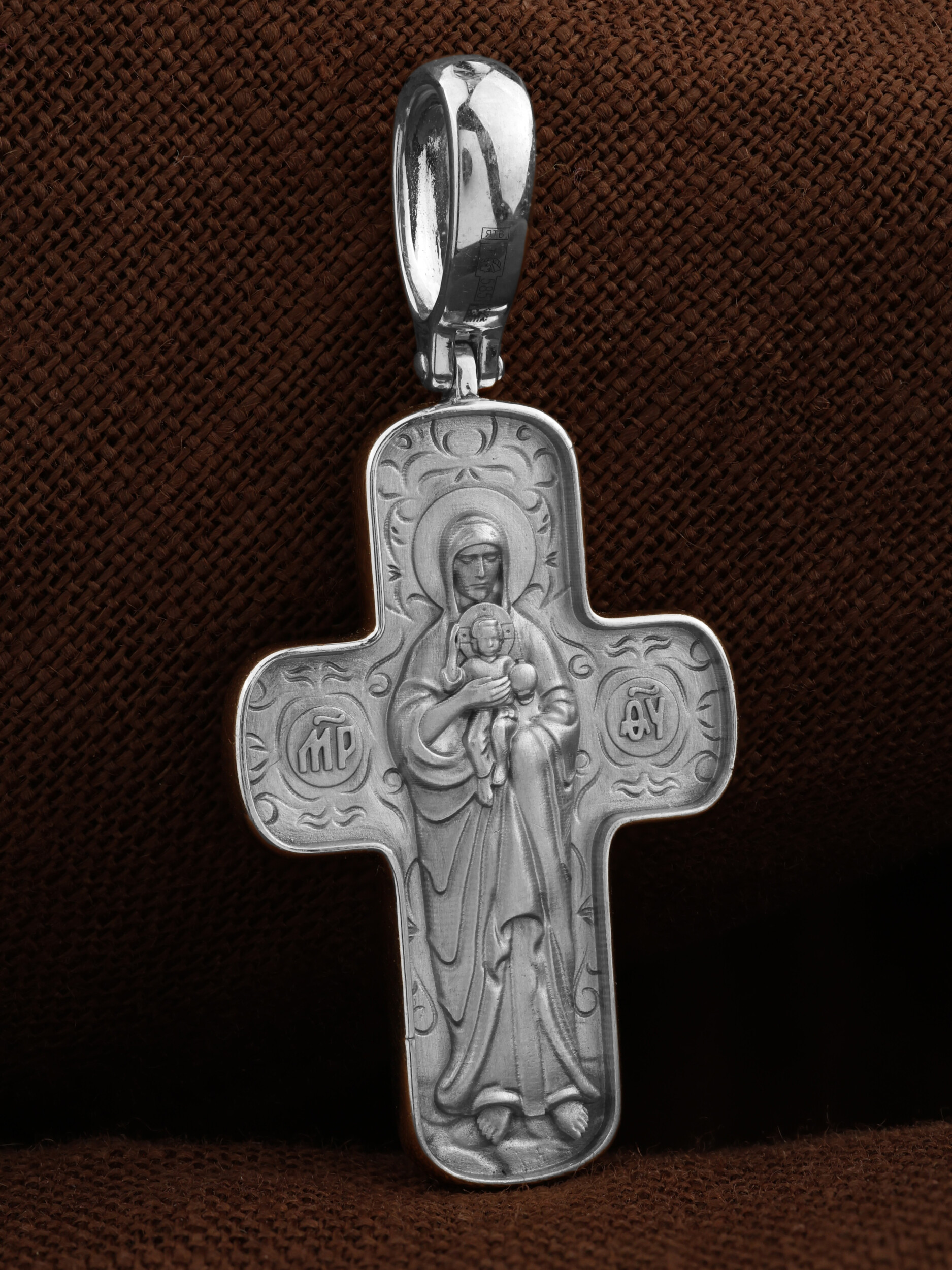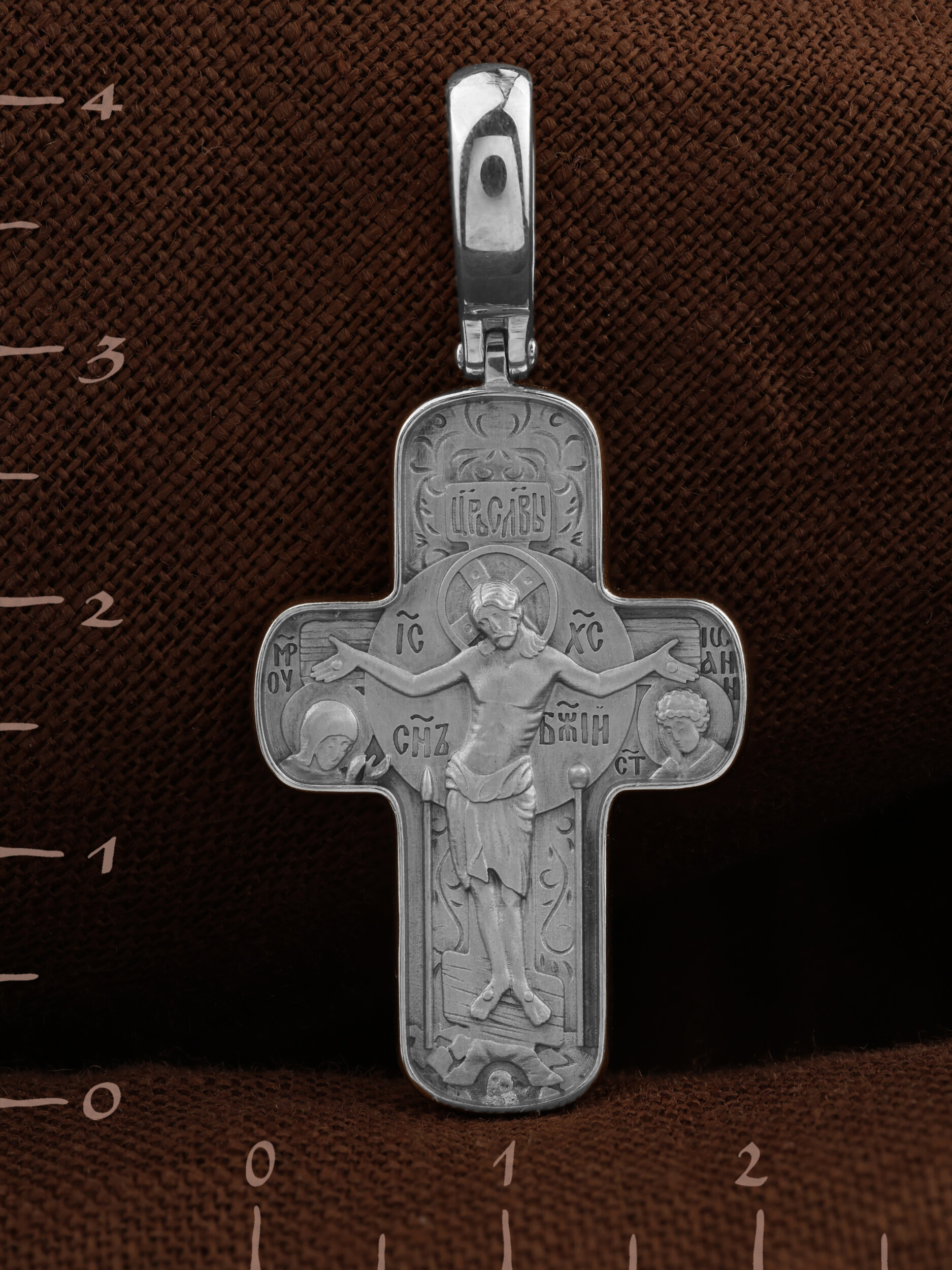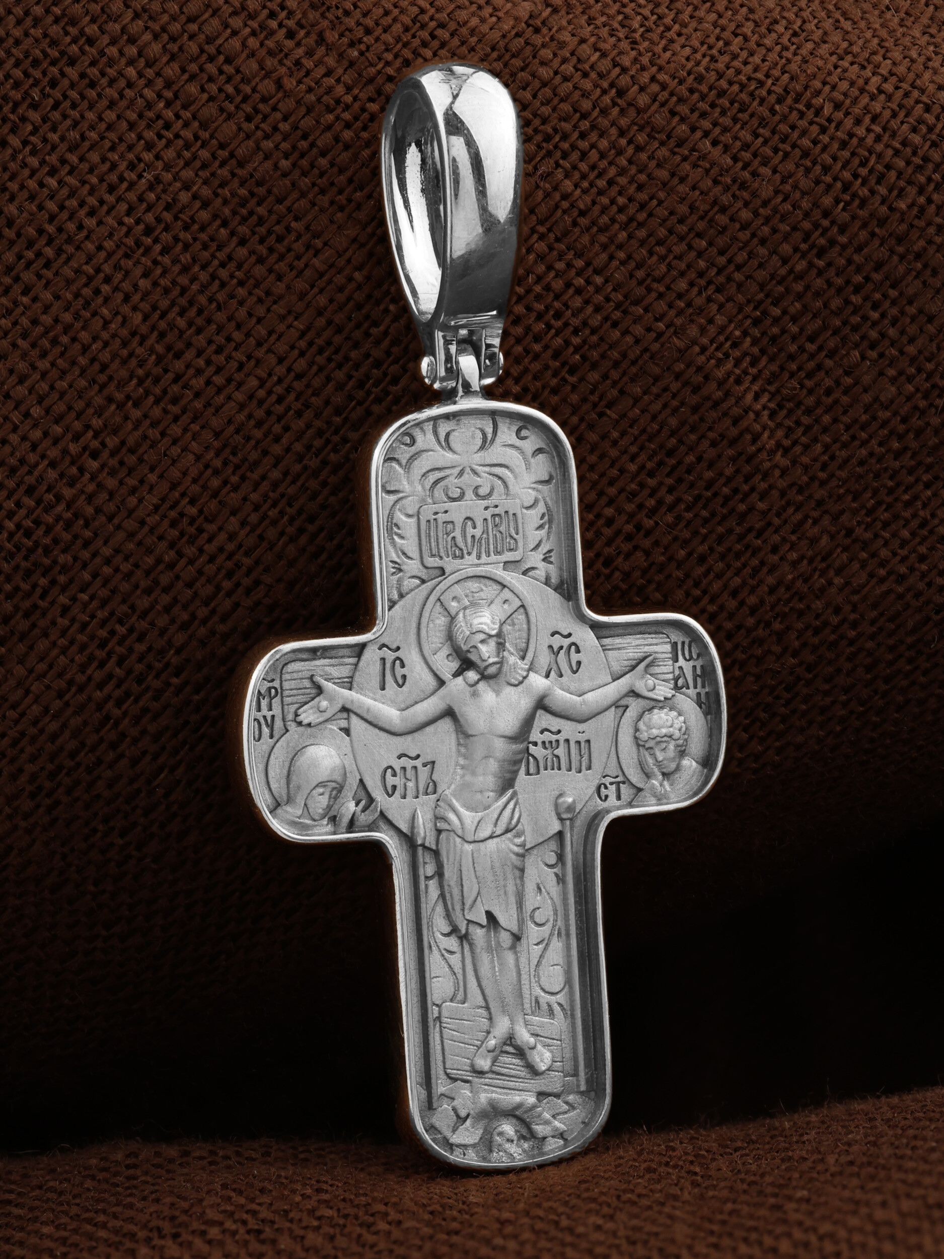 На лицевой стороне креста изображено Распятие Господа и Спасителя нашего Иисуса Христа. Крест- символ спасения и искупления рода человеческого, знамение победы над смертью и адом. Иисус Христос, как искупительная жертва освобождения человечества от власти греха, умер крестной смертью и в третий день воскрес. Над вершиной Распятия помещена надпись «Царь Славы». Надпись «IС» « ХС» означает Иисус Христос и помещается на разных сторонах поперечной перекладины креста. Рядом расположена надпись «Сын Божий». Слева от Распятия изображена Пресвятая Богородица, справа — апостол и евангелист Иоанн Богослов, один из ближайших учеников Иисуса Христа. Крест стоит на горе камней, символизирующих Голгофу. В ее основании различается череп — это голова Адама. Вдоль креста изображены копие сотника Лонгина и трость с губкой. На православном кресте Христос не умирает, а свободно простирает руки, ладони Иисуса открыты, будто он хочет обнять все человечество, даря им свою любовь и открывая путь к вечной жизни.