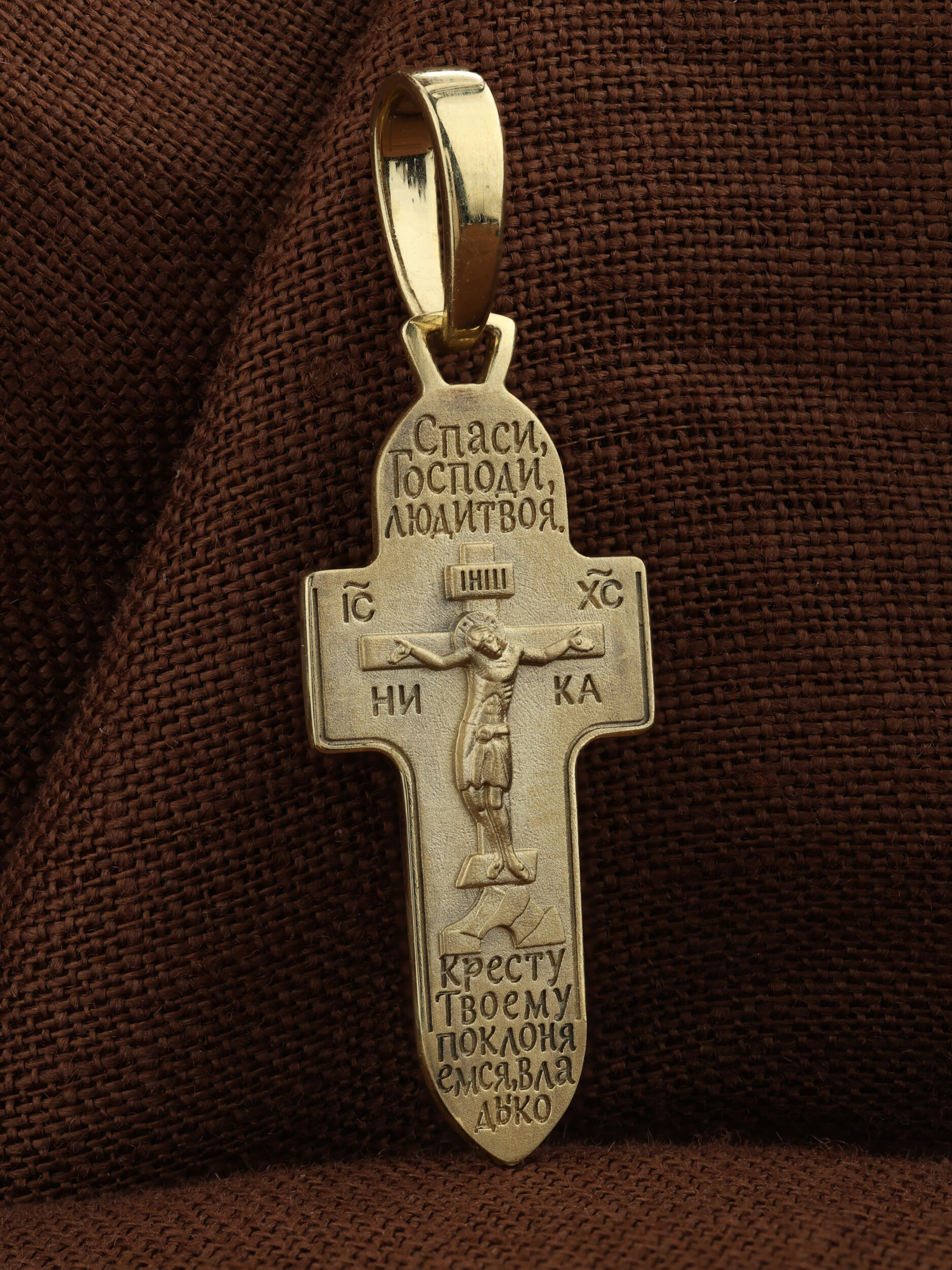 На лицевой стороне креста изображено Распятие Господа и Спасителя нашего Иисуса Христа. Крест- символ спасения и искупления рода человеческого, знамение победы над смертью и адом. Иисус Христос, как искупительная жертва освобождения человечества от власти греха, умер крестной смертью и в третий день воскрес. На верхней табличке, выше головы Иисуса, расположена надпись, составленная Понтием Пилатом — «IНЦI». Она означает «Иисус Назорей, Царь Иудейский». Надпись «IC» «ХC», означает Иисус Христос, помещается на разных сторонах поперечной перекладины креста. Под ней помещено слово «НIКА», что означает Победитель. Крест стоит на горе камней, символизирующих Голгофу.