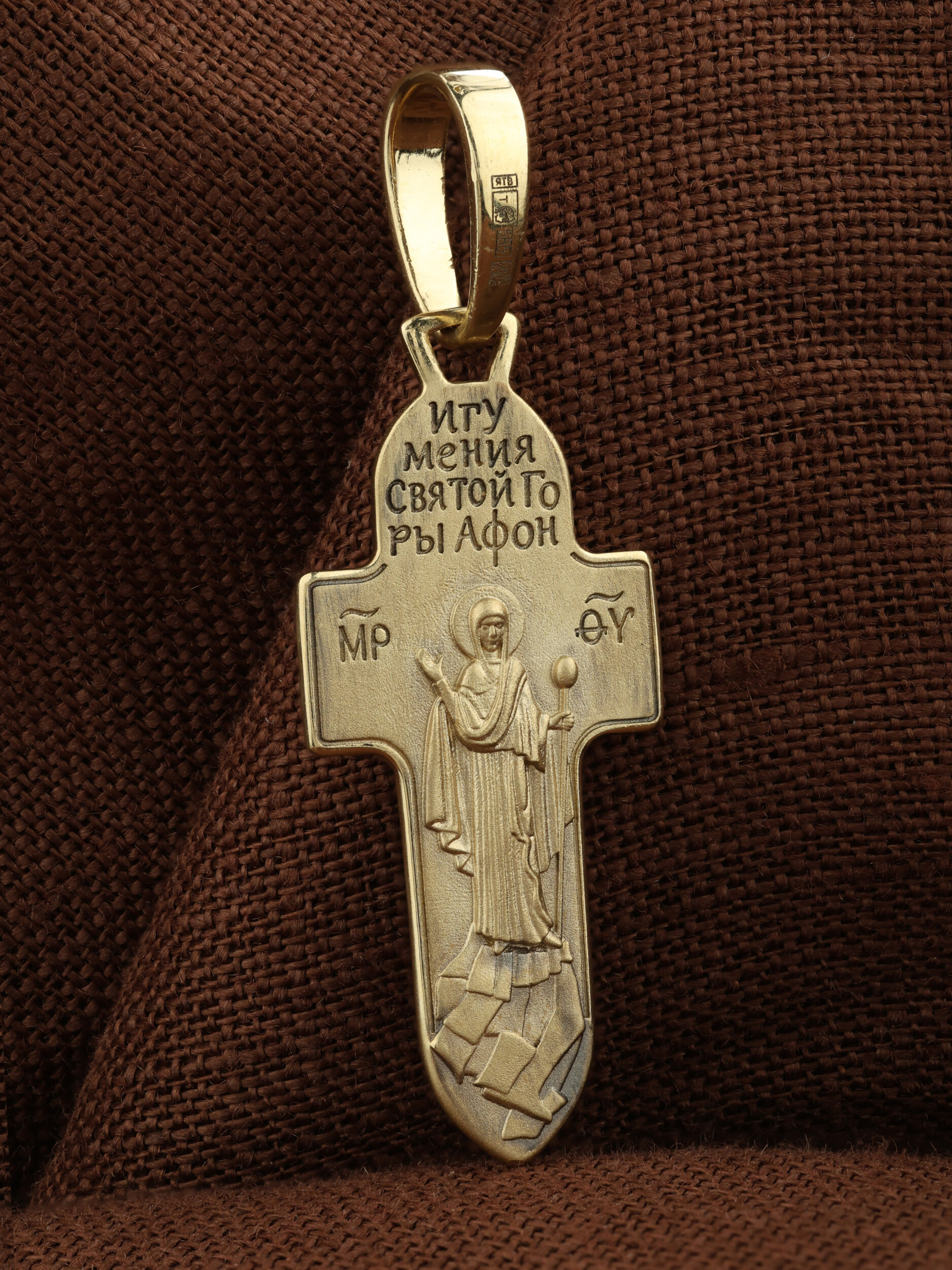 На оборотной стороне креста изображена Икона Божией Матери «Игумения Святой Горы Афонской». Икона написана греческим иконописцем афонского монастыря схимонахом Паисием. Богоматерь изображена с игуменским жезлом над всем монашеским островом. Святое предание связывает появление монашеских обителей на Святой Горе с особым попечительством Пресвятой Богородицы на Афоне. Божия Матерь возвестила евангельское учение жителям горы Афон, которые были язычниками. Народ слушал Ее проповеди, затем уверовал и крестился. Силой Своей проповеди и многочисленными чудесами Богородица обратила местных жителей в христианство. Она поставила там начальником и учителем одного из Апостольский мужей и сказала: «Сие место буди мне и жребий, данный мне от Сына Бога моего».