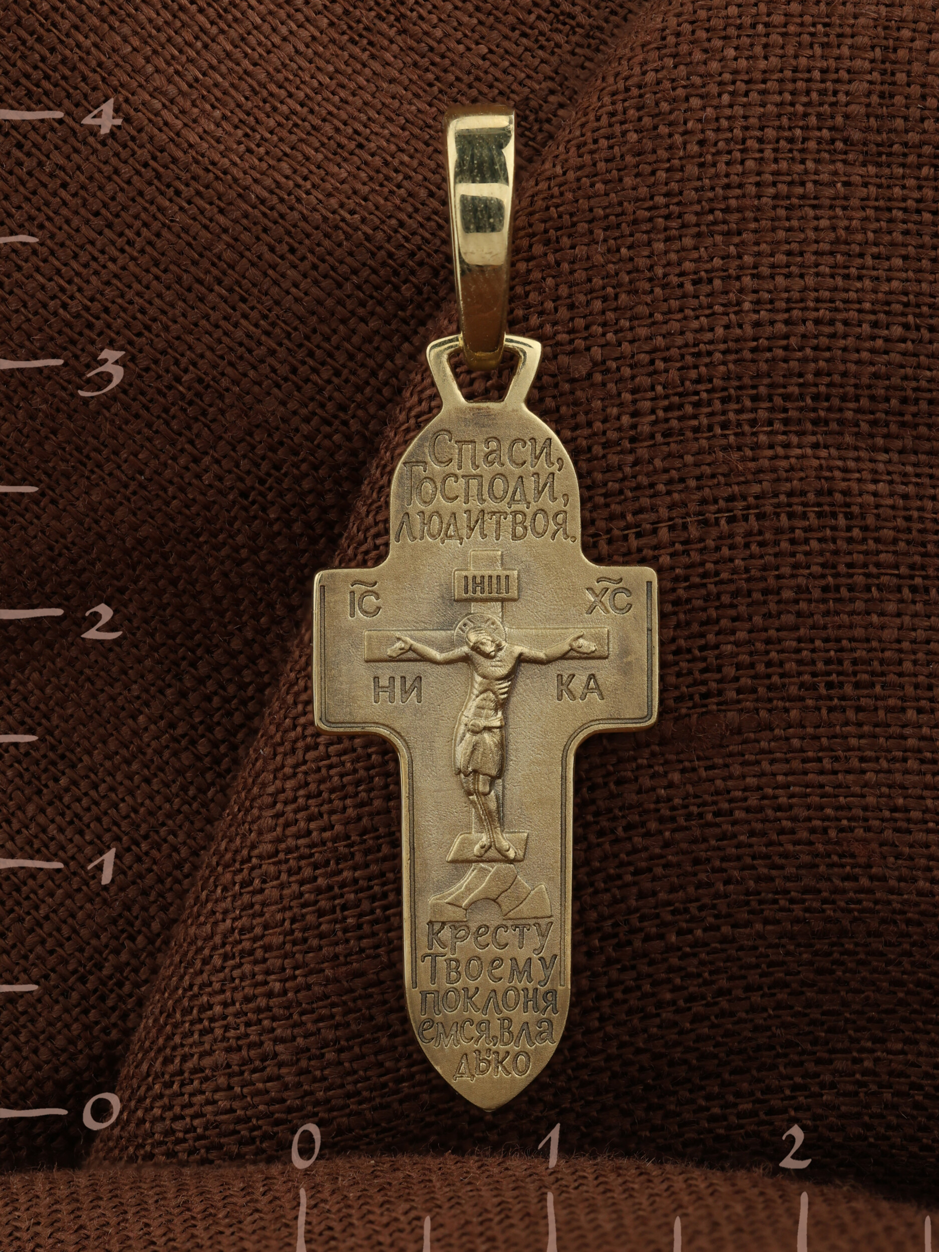 На кресте размещены слова молитвы: «Спаси, Господи, люди твоя» и «Кресту Твоему поклоняемся, Владыко».