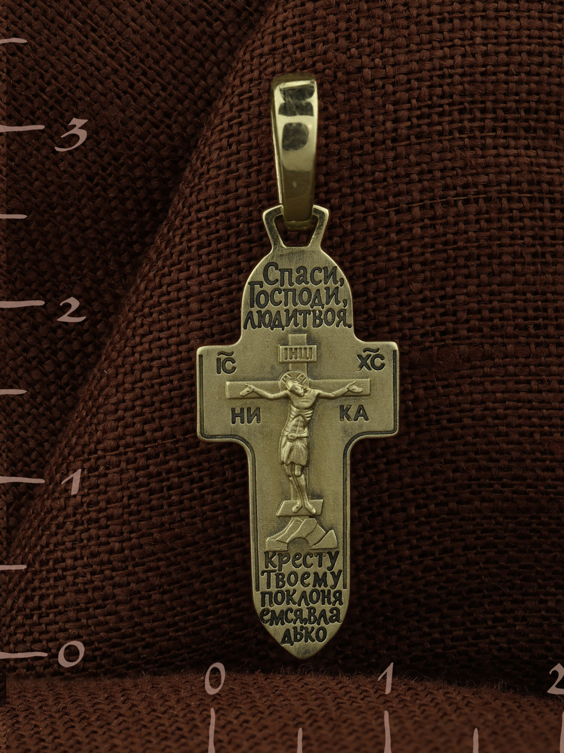 На кресте размещены слова молитвы: «Спаси, Господи, люди твоя» и «Кресту Твоему поклоняемся, Владыко».