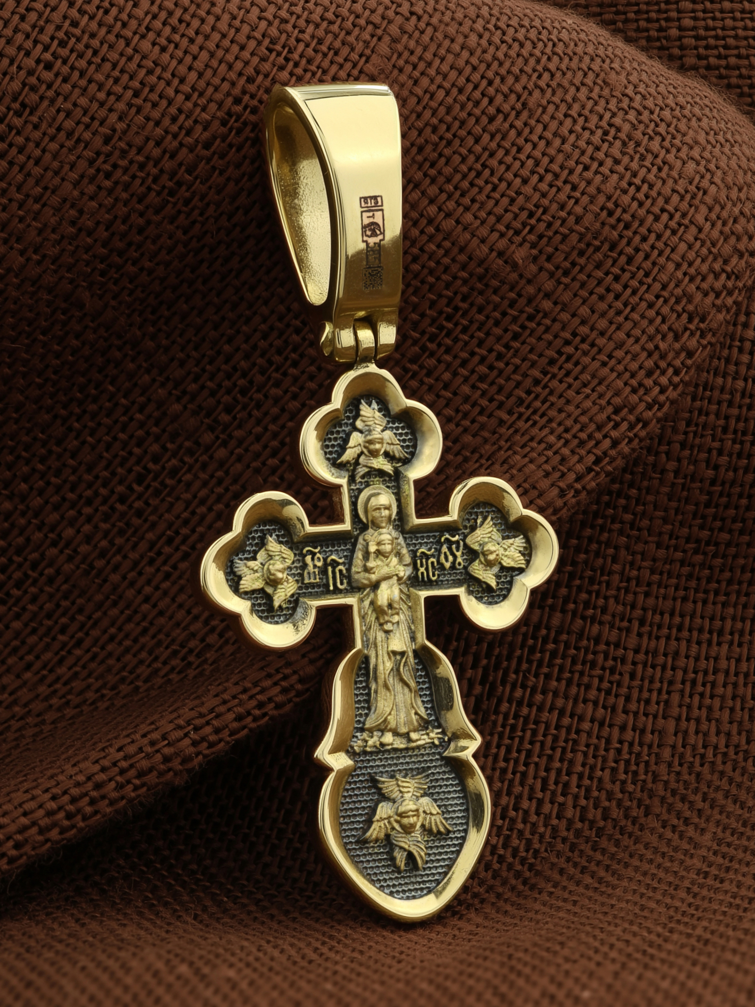 На обороте креста изображена Пресвятая Богородица в Своем образе Валаамском. Эта икона была написана в 1878 году иеромонахом Валаамского монастыря о. Алипием. Икона прославилась чудом исцеления мещанки Натальи Андреевой в 1897 году, и с тех почитается как целительница при различных недугах. Икону окружают шестикрылые Серафимы — самые приближенные к Господу Ангелы.