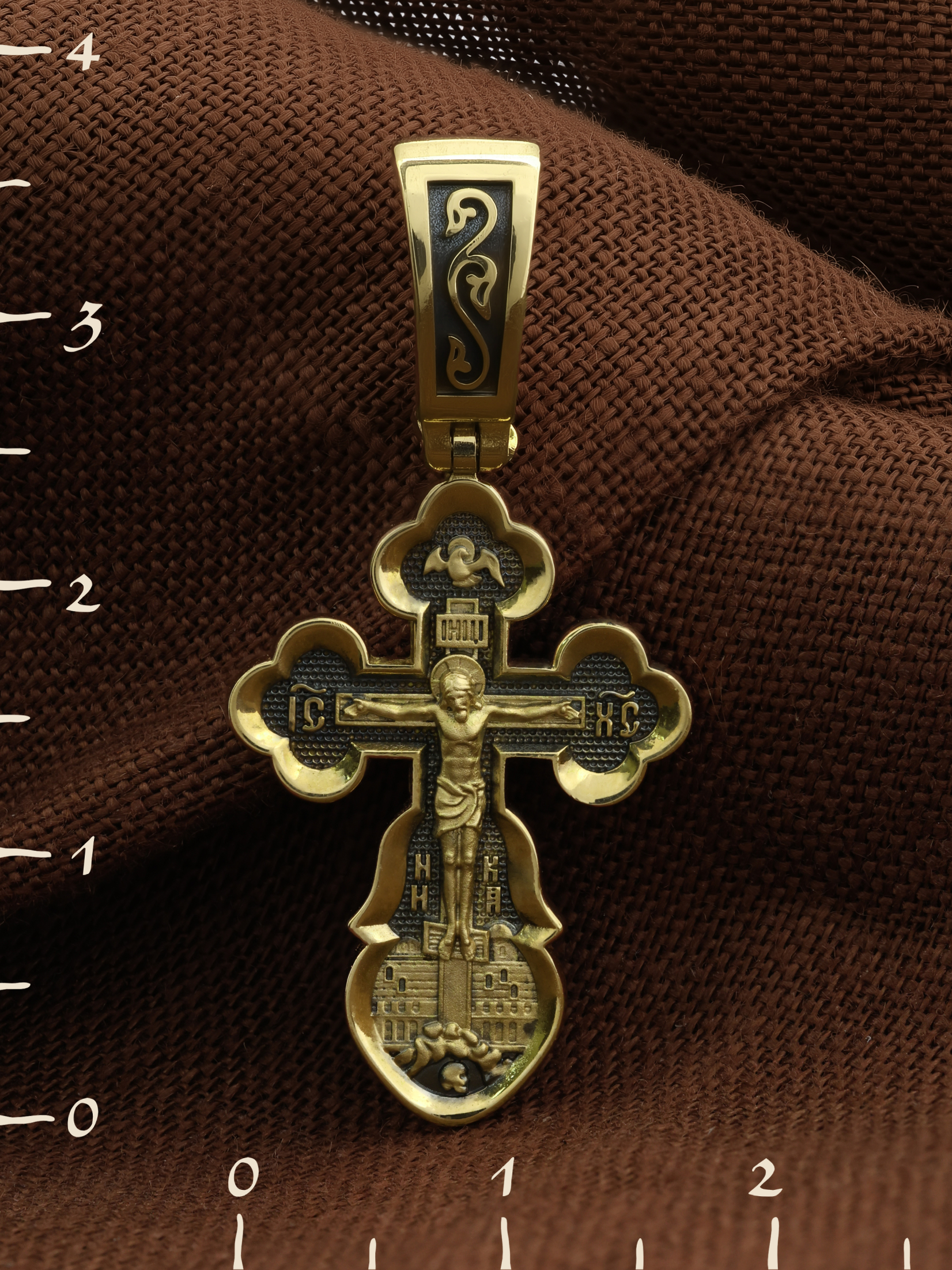 Распятие сопровождается иконографическими надписями, прославляющими Господа Иисуса Христа. На боковых оконечностях размещены инициалы святого имени Спасителя «IС ХС» и надпись «Сын Божий», обозначающая Его божественную природу. На подножии Креста можно прочитать надпись «НИКА» (Победитель) — символ победы Господа над смертью. Венчает лицевую сторону образ Святого Духа в виде голубя.