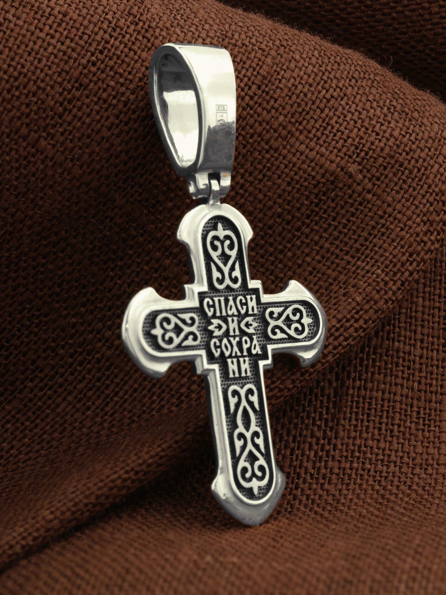 Обратная сторона креста выполнена с использованием растительного орнамента. Такой крест с растительным узором вводит мотив процветшего креста и символизирует Древо Жизни. Умерев за наши грехи, Христос возродил всех для Жизни Вечной, «Смертию смерть поправ…». Своими страданиями Он искупил грехи человечества, умерев и сошествовав во ад, победил сатану, освободил души праведников от вечной смерти и открыл им небесные врата рая. Поэтому на обороте данного креста написано молитвенное славословие: «Спаси и сохрани».