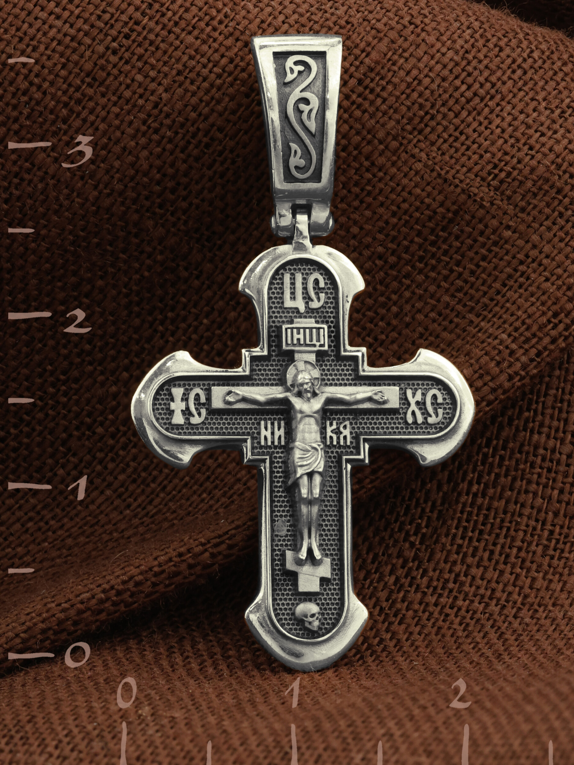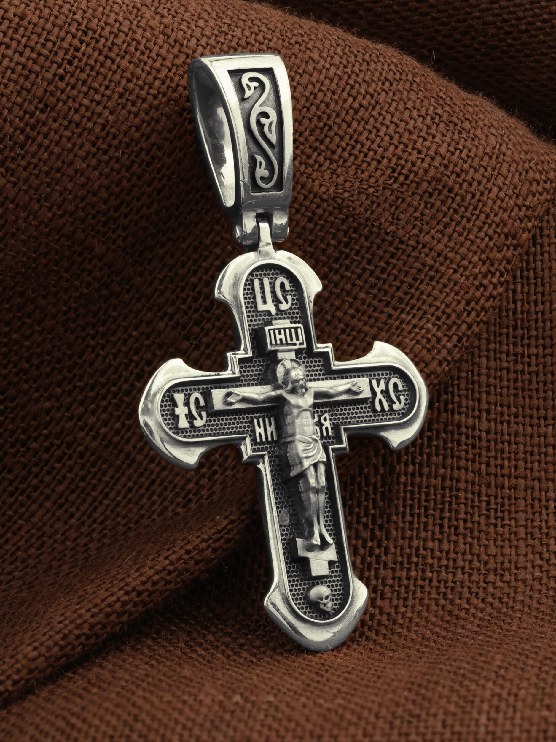 На лицевой стороне креста изображено Распятие, потому что это орудие казни Иисус Христос сделал орудием победы над грехом и смертью. Своими страданиями Он искупил грехи человечества, умерев и сошествовав во ад, победил сатану, освободил души праведников от вечной смерти и открыл им небесные врата рая. Жертва Христа сделала возможным спасение для каждого человека. На православном кресте Христос не умирает, а свободно простирает руки, ладони Иисуса открыты, будто он хочет обнять все человечество, даря им свою любовь и открывая путь к вечной жизни. Над титлом видим слова «ЦРЬ СЛВЫ» — Царь Славы. Верхняя перекладина символизирует собой табличку с надписью «IHЦI» — Иисус Назарянин Царь Иудейский. Возле перекладины пишется сокращенно имя Спасителя «IC XC» — Иисус Христос, ниже добавляется «НИКА» (греч. — Победитель). Возвышение, на котором стоит Крест, символизирует гору Голгофу, на которой произошло Распятие. У подножия Креста изображают прах Адама, обозначенный черепом.