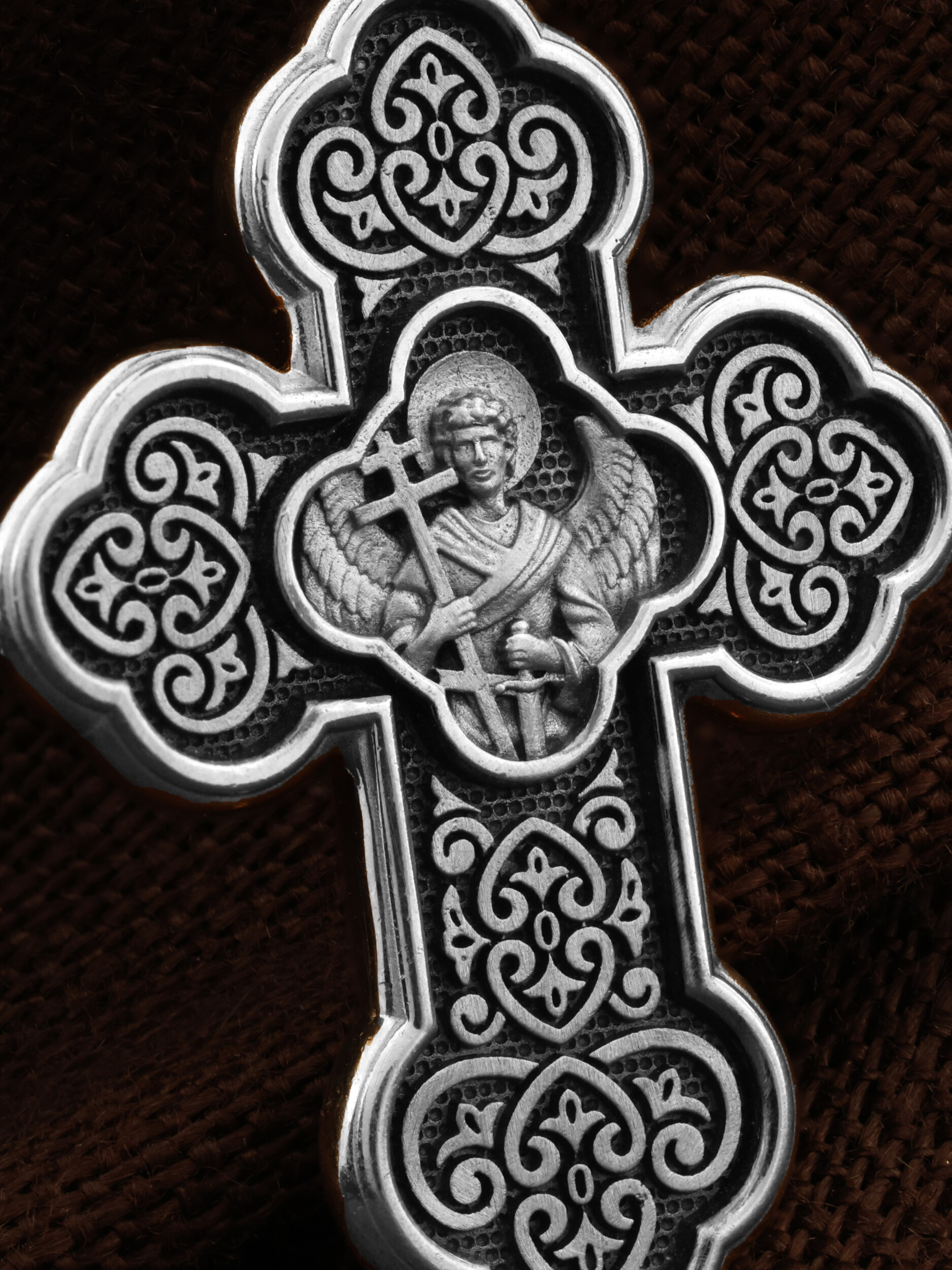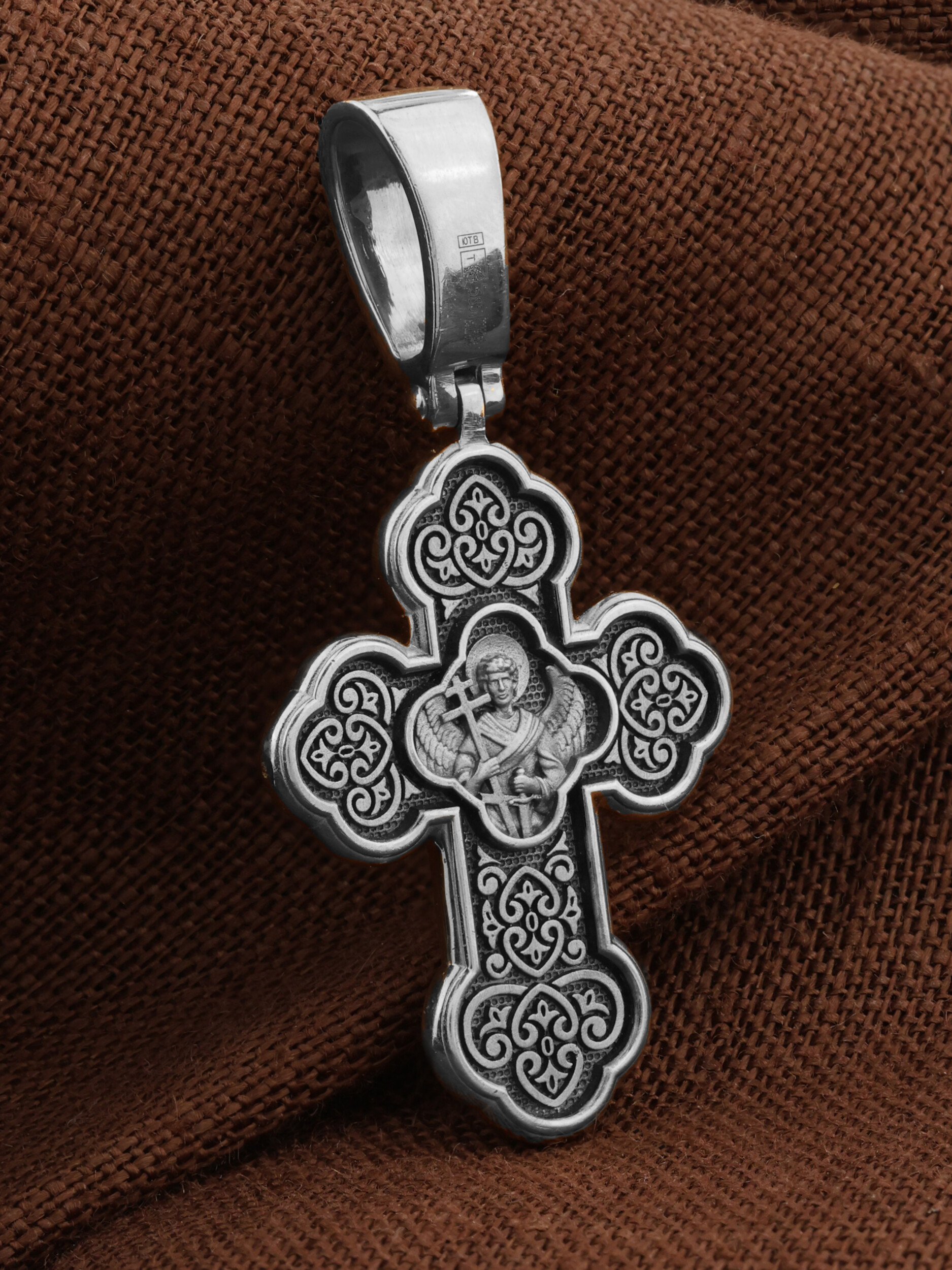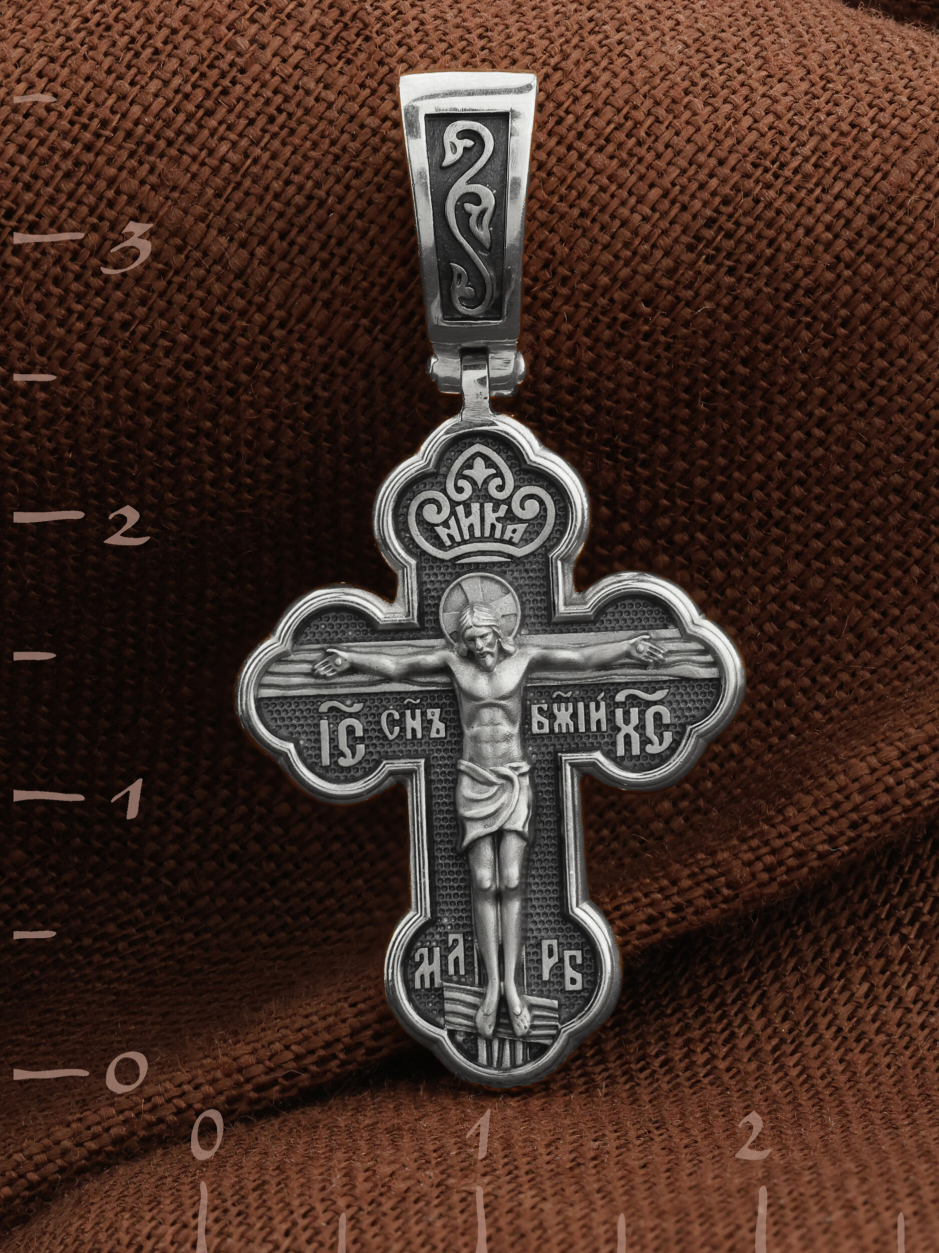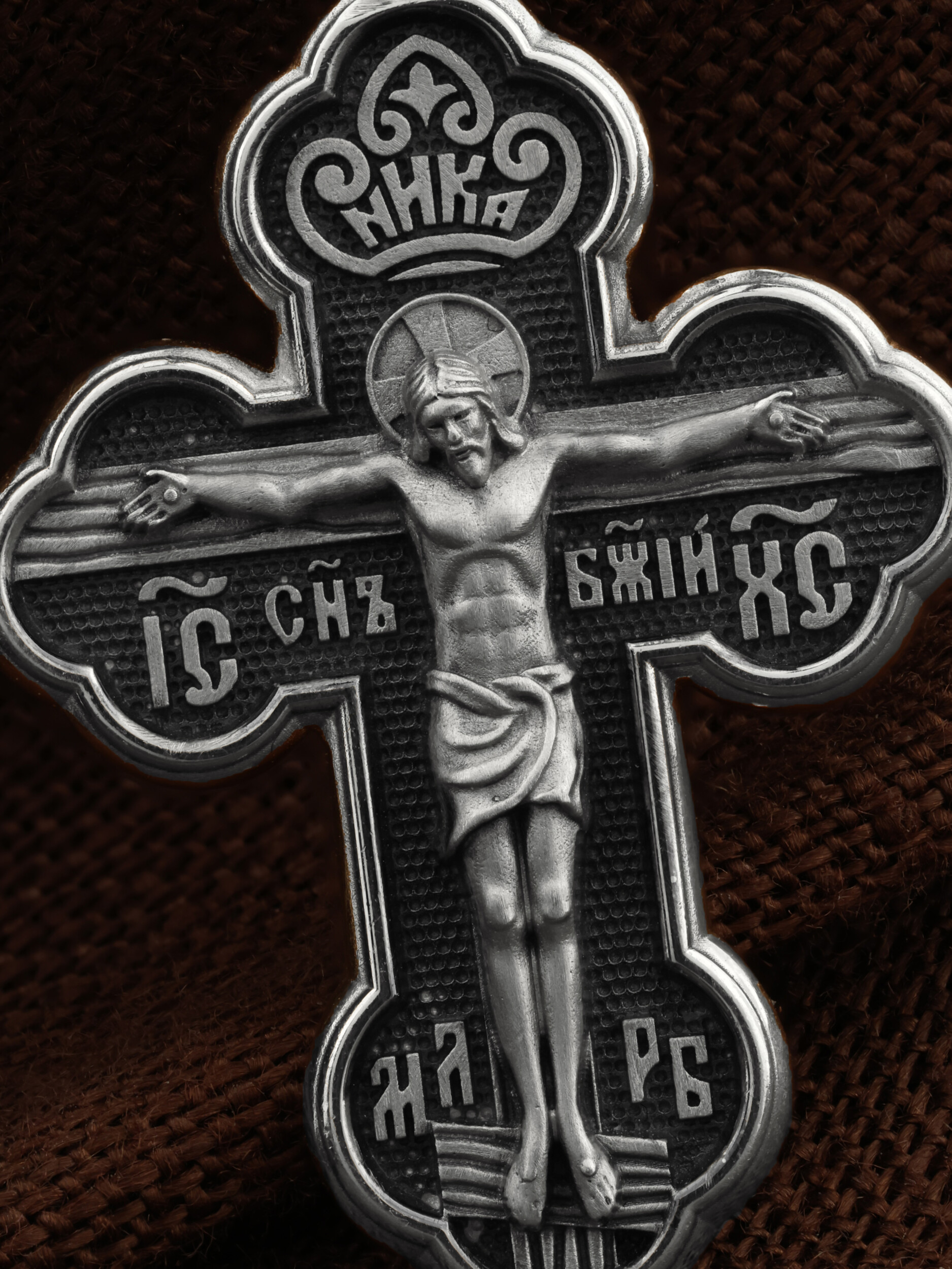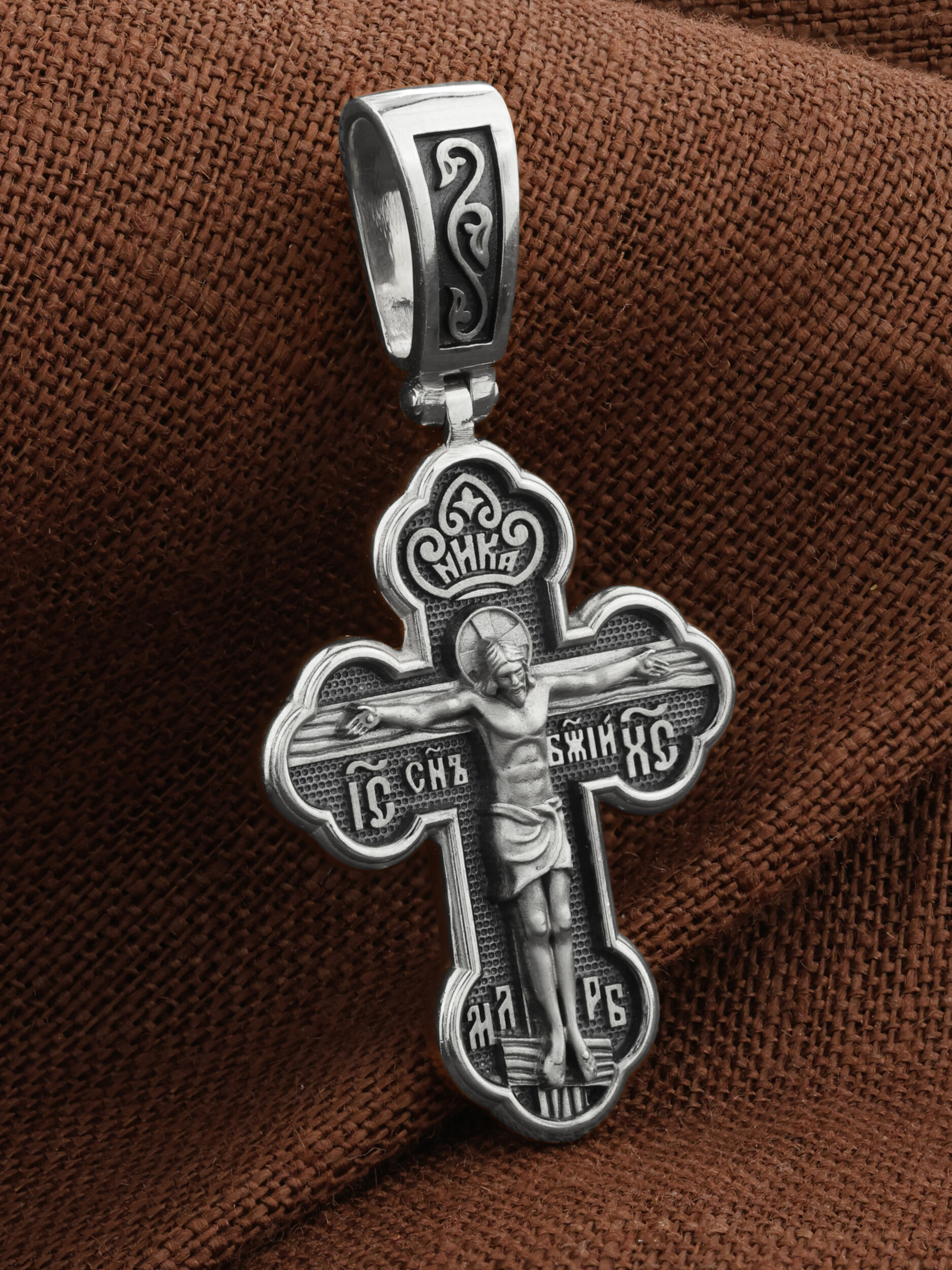 Крест нательный четырехконечный с трехлепестковыми завершениями перекладин. На лицевой стороне креста изображено Распятие, потому что это орудие казни Иисус Христос сделал орудием победы над грехом и смертью. Своими страданиями Он искупил грехи человечества, умерев и сошествовав во ад, победил сатану, освободил души праведников от вечной смерти и открыл им небесные врата рая. Жертва Христа сделала возможным спасение для каждого человека. На православном кресте Христос не умирает, а свободно простирает руки, ладони Иисуса открыты, будто он хочет обнять все человечество, даря им свою любовь и открывая путь к вечной жизни. Над головой Христа надпись — «НИКА» (греч. — Победитель). С обеих сторон горизонтальной перекладины надписи — монограмма святого имени Христа — «ИС ХС», а рядом с ней словосочетание «СНЪ БЖIЙ» — «СЫН БОЖИЙ». Две пары букв на кресте «МЛ» «РБ» означают: Место Лобное Рай Бысть. Возвышение, на котором стоит Крест, символизирует гору Голгофу, на которой произошло Распятие. У подножия Креста изображают прах Адама, обозначенный черепом.