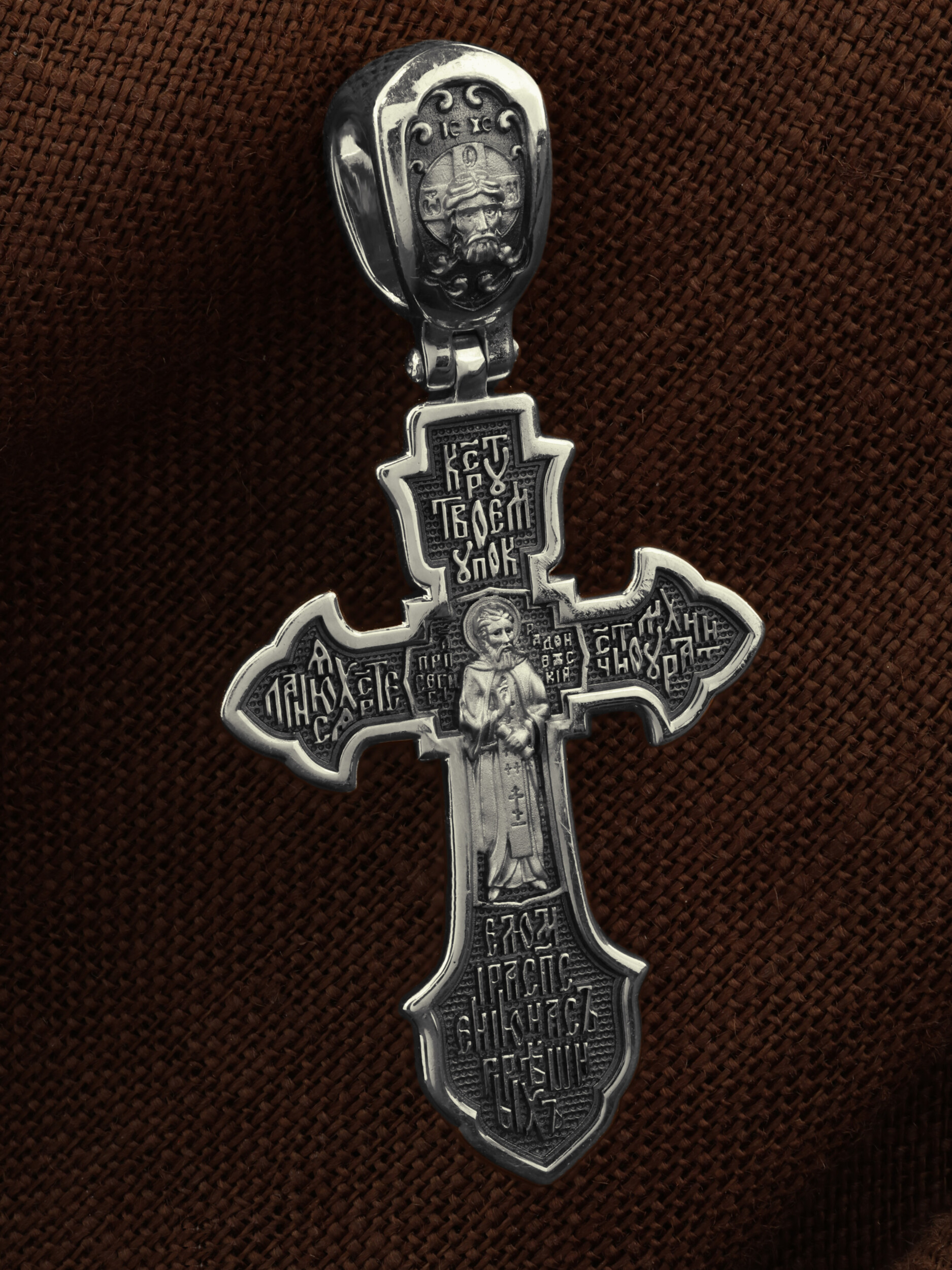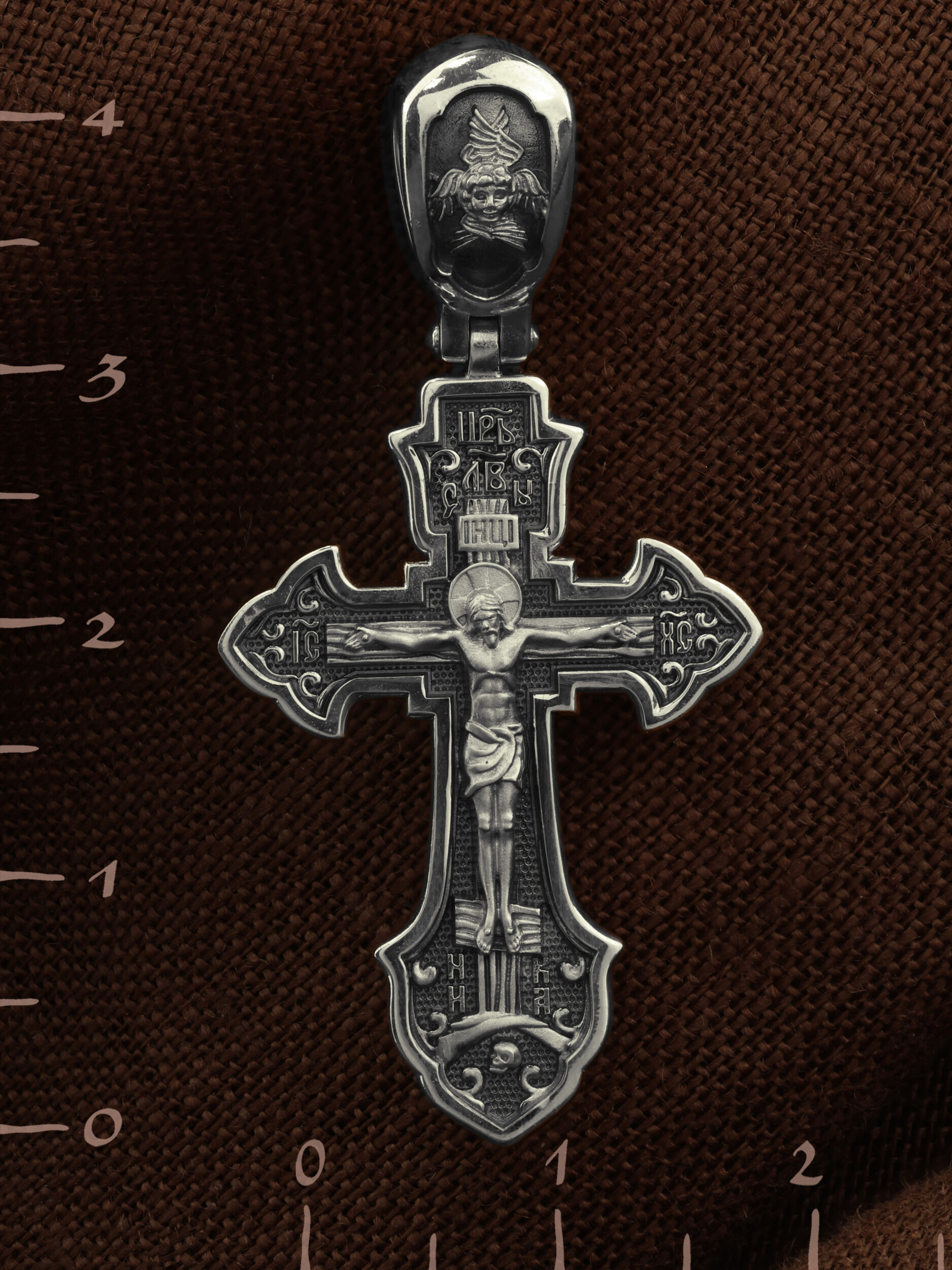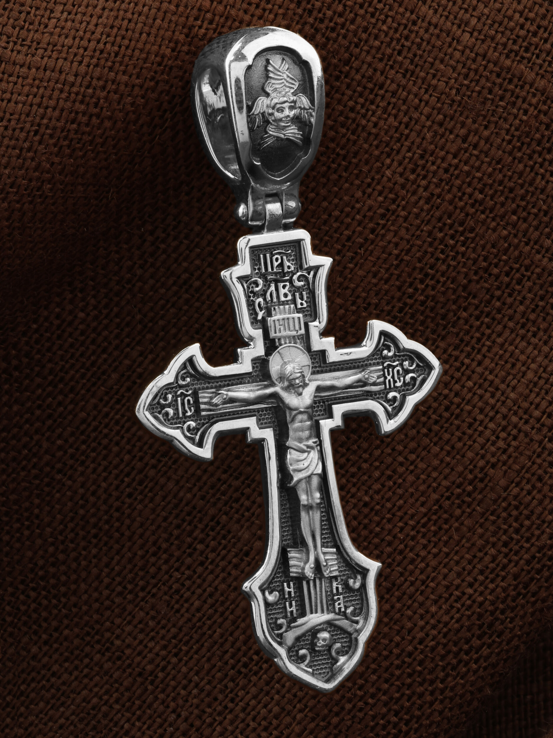 На лицевой стороне этого креста центральную часть занимает икона Распятия Христа — образ жертвы, принесенной Господом за грехи людей. Над титлом видим слова «ЦРЬ СЛВЫ» — Царь Славы. Верхняя перекладина символизирует собой табличку с надписью «IHЦI» — Иисус Назарянин Царь Иудейский. Возле перекладины пишется сокращенно имя Спасителя «IC XC» — Иисус Христос. У подножия мы видим четыре буквы «МЛ» «РБ» — Место Лобное Рай Бысть. Возвышение, на котором стоит Крест, символизирует гору Голгофу, на которой произошло Распятие. У подножия Креста изображают прах Адама, обозначенный черепом. На кулонном кольце изображен шестикрылый Серафим — самый приближенный к Господу Ангел.