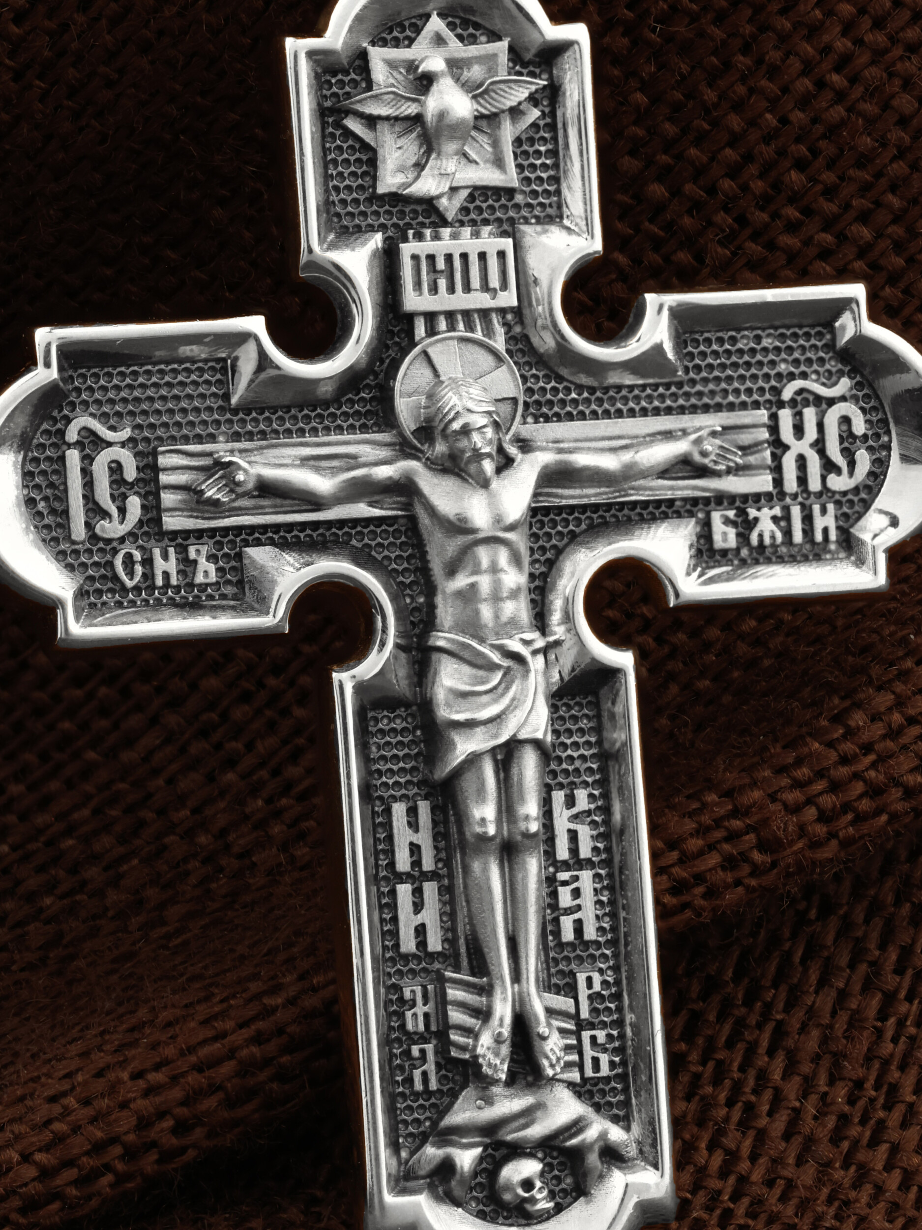 На лицевой стороне креста изображено Распятие Иисуса Христа. Господь представлен свободно покоящимся на кресте с простертыми руками и как бы обнимающим всю Вселенную. Верхняя перекладина символизирует титло — табличку, на которой, согласно Евангелию, было начертано: Иисус Назорей Царь Иудейский (IНЦI). Также Распятие сопровождается надписями, олицетворяющими Христа: святое имя Христа «IC» (Иисус) «ХС» (Христос), и словосочетание «СНЪ БЖIЙ» — СЫН БОЖИЙ. Рядом с образом Христа помещены слова — «НИКА» (греч. — Победитель) и четыре буквы «МЛ» «РБ» — Место Лобное Рай Бысть. Возвышение, на котором стоит Крест, символизирует гору Голгофу, на которой произошло Распятие. У подножия Креста изображают прах Адама, обозначенный черепом. На кулонном кольце изображен шестикрылый Серафим — самый приближенный к Господу Ангел.